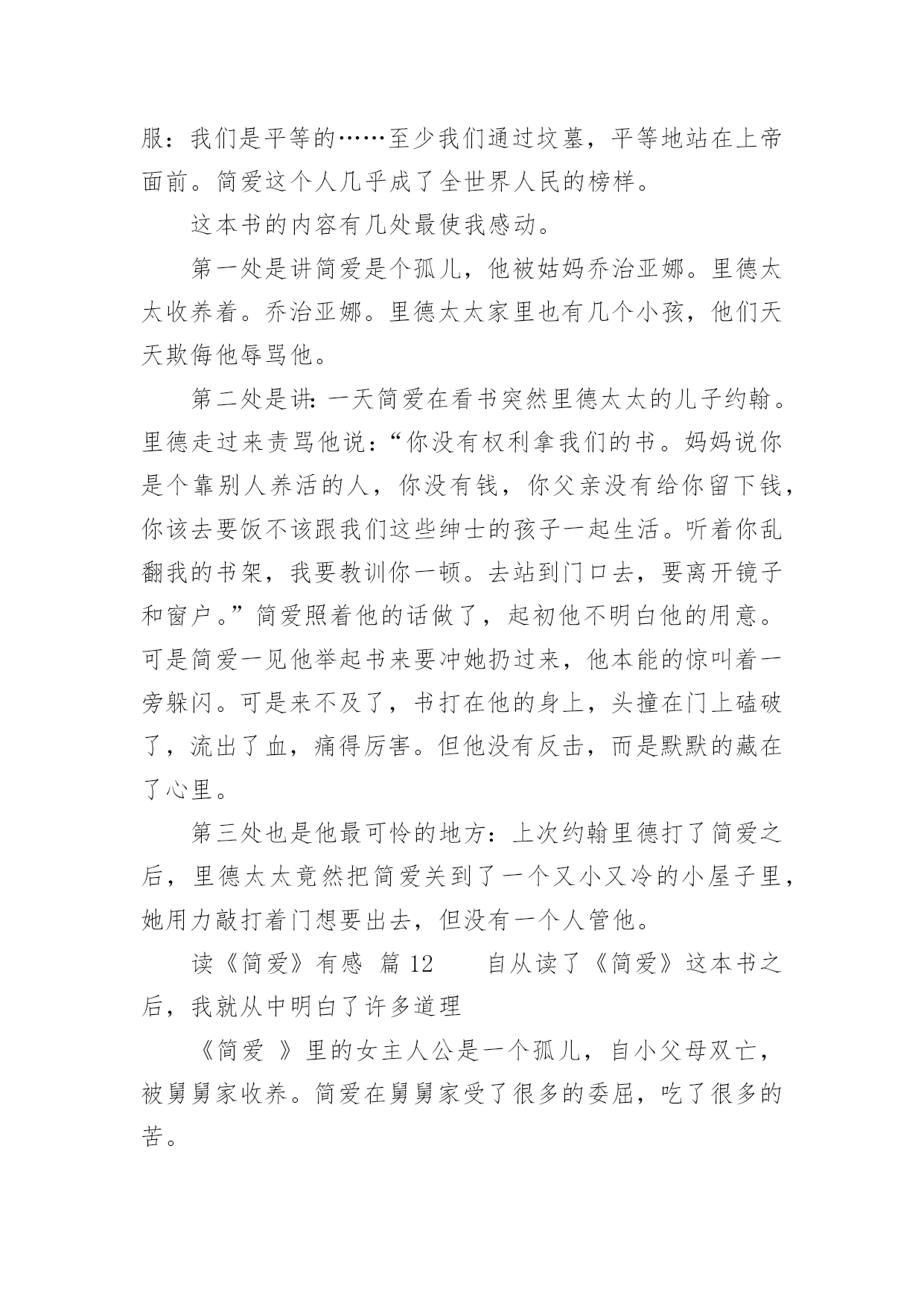 读《简爱》有感读《简爱》有感15篇当赏读完一本名著后,相信你一定有很多值得分享的收获,不妨坐下来好好写写读后感吧。那么你会写读后感吗?以下是小编帮大家整理的读《简爱》有感,供大家参考借鉴,希望可以帮助到有需要的朋友。读《简爱》有感1古人云:"愿乘风破万里浪,甘面壁读十年书"。因此,我从小就喜欢读书,而夏洛蒂·勃朗特的简·爱则更是让我受益匪浅。小说讲述的是女主人公简·爱的成长历程,她从小失去父母,寄住在舅妈家,不平等的待遇让她饱受欺凌,小小年纪就承受了别人无法想象的委屈和痛苦。成年后,她成了桑菲尔德贵族庄园