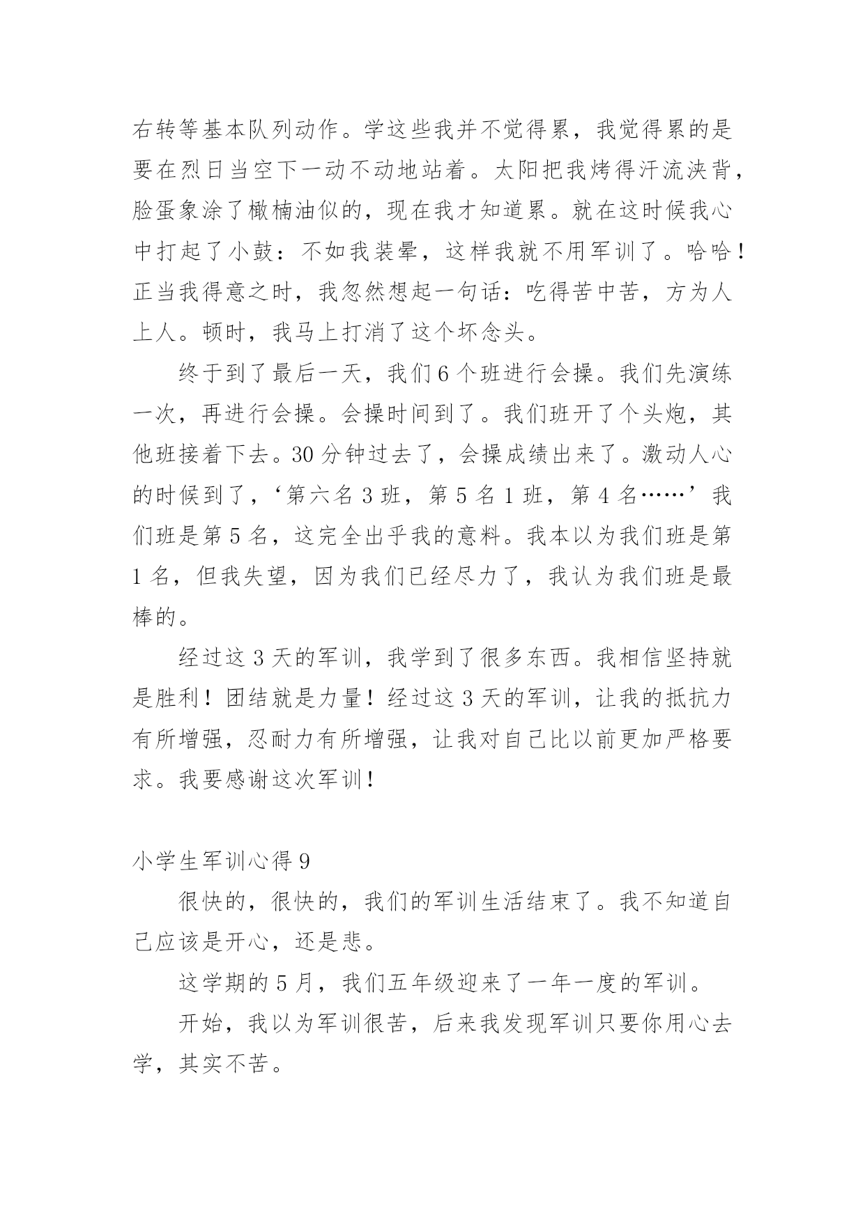 小学生军训心得小学生军训心得当我们备受启迪时,就很有必要写一篇心得体会,如此可以一直更新迭代自己的想法。应该怎么写才合适呢?以下是小编收集整理的小学生军训心得,仅供参考,希望能够帮助到大家。小学生军训心得1军训让我的感触很深,我深深体会到了作为一名军人有多么的辛苦和不容易。军训不仅磨练了我的意志还让我锻炼了我的耐力、素质!虽然很苦、很累但是我很高兴,因为军训使我认识了许多新同学,不管什么事情都得付出才会有回报,人生是苦乐交织的。在这几天的军训生活中,我们腰也酸、腿也疼,实在有些吃不消了,但是为了胜利完成军