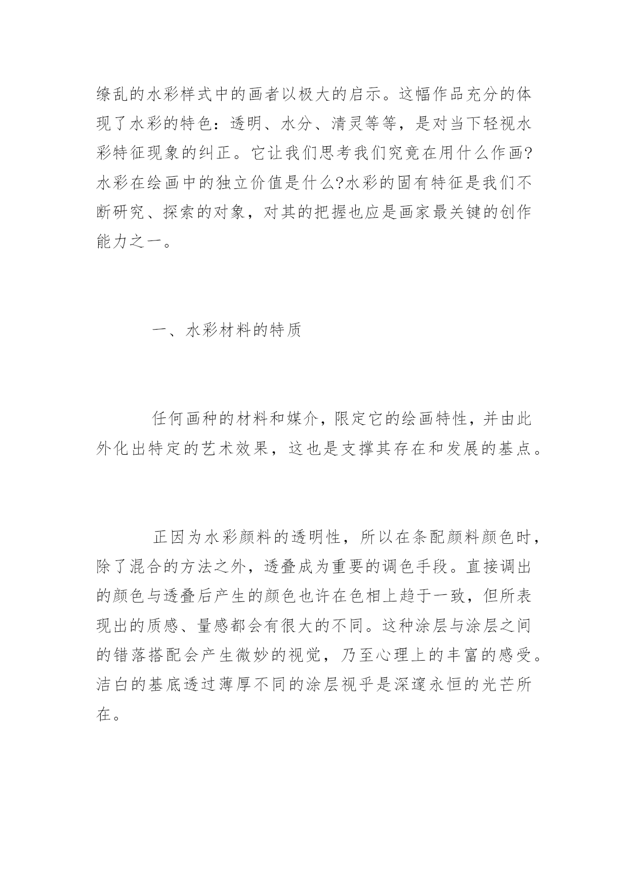 论水彩画的艺术特征论水彩画的艺术特征水彩画起源于西方,它和油画一样深受西方绘画理念的影响,有着深厚的艺术积淀和广阔而完整的发展空间。下面这篇论文是关于论水彩画的艺术特征的,希望对大家有帮助哦!摘要:“水彩画”顾名思义,就是以水为媒介调和颜料作画的表现方式。就其本身而言具有两个基本特征:一是颜料本身具有的透明性;二是绘画过程中水的流动性。水彩材质的特性导致水彩艺术的特殊性。水色的结合、透明性质、随机性及肌理都是值得研究的课题。水融色的干湿浓淡变化以及在纸上的渗透效果使水彩画具有很强的