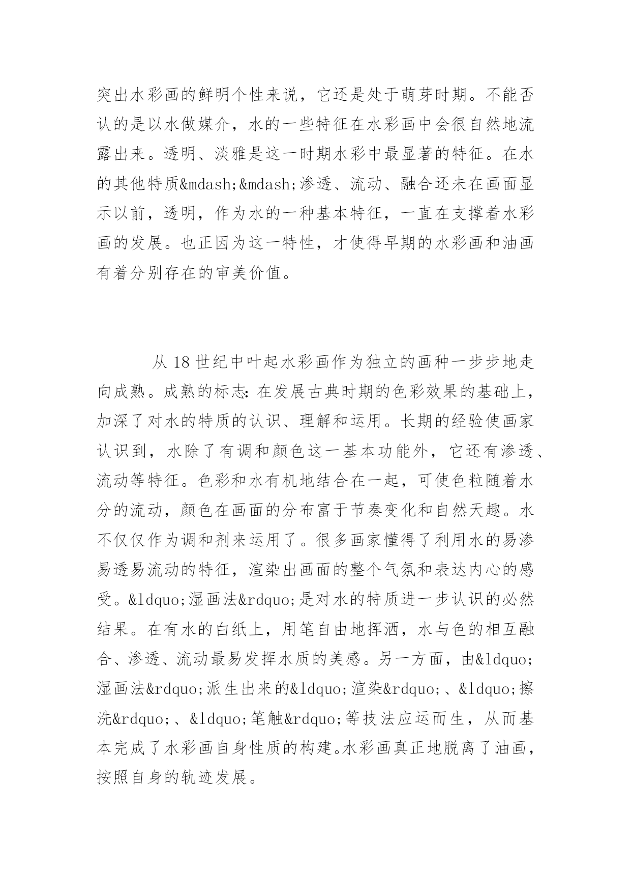 浅谈水彩画的艺术特征摘要:水彩画始于欧洲已有相当长的历史是一门古老的艺术画种。它具有清晰、明快、绚丽、高雅的艺术特色。早在意大利文艺复兴前期已出现。18、19世纪的英国更是以精美的水彩艺术享誉世界。水彩画水色交融以其清新透明、湿润流畅的艺术特色给人一种抒情美的感受。颜料系用胶水调制可溶于水利用颜料的这一特性水的渗融效果及纸的底色易产生透明感及轻快、湿润的艺术效果。有干、湿、粗笔等不同画法。始于15世纪欧洲18世纪在英国有很大发展19世纪初流传世界各地并且有所发展。本文简单的