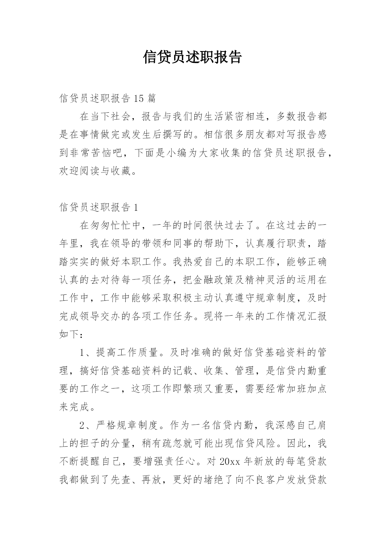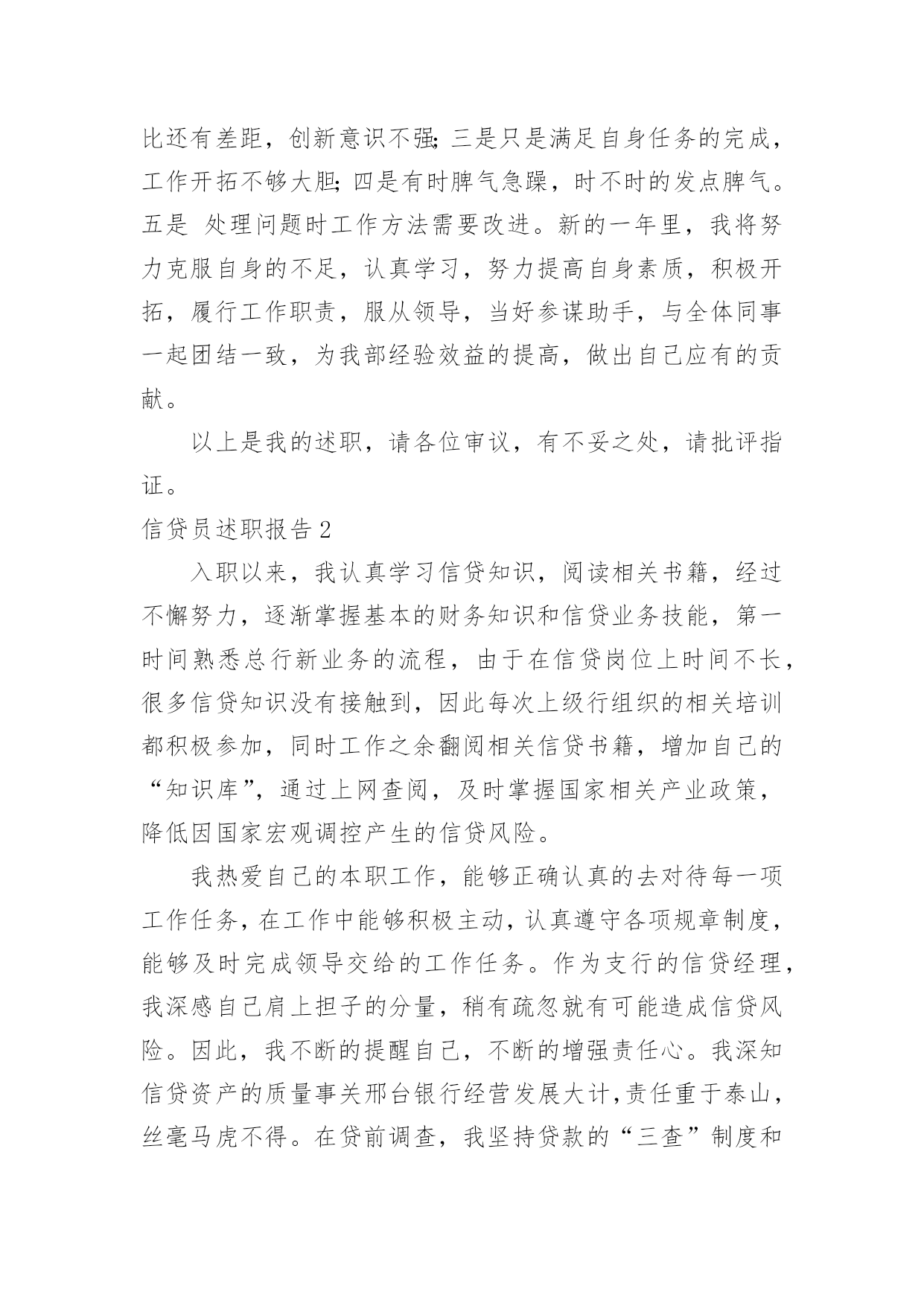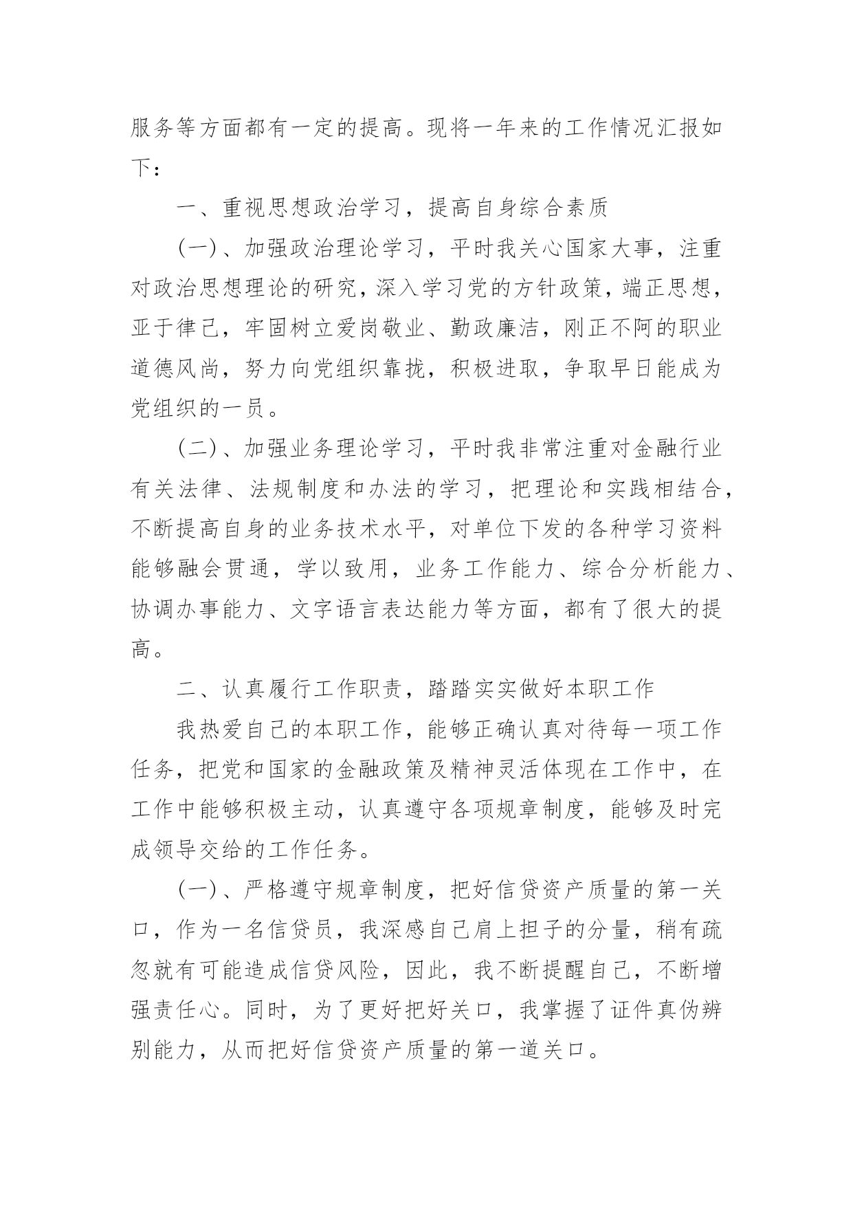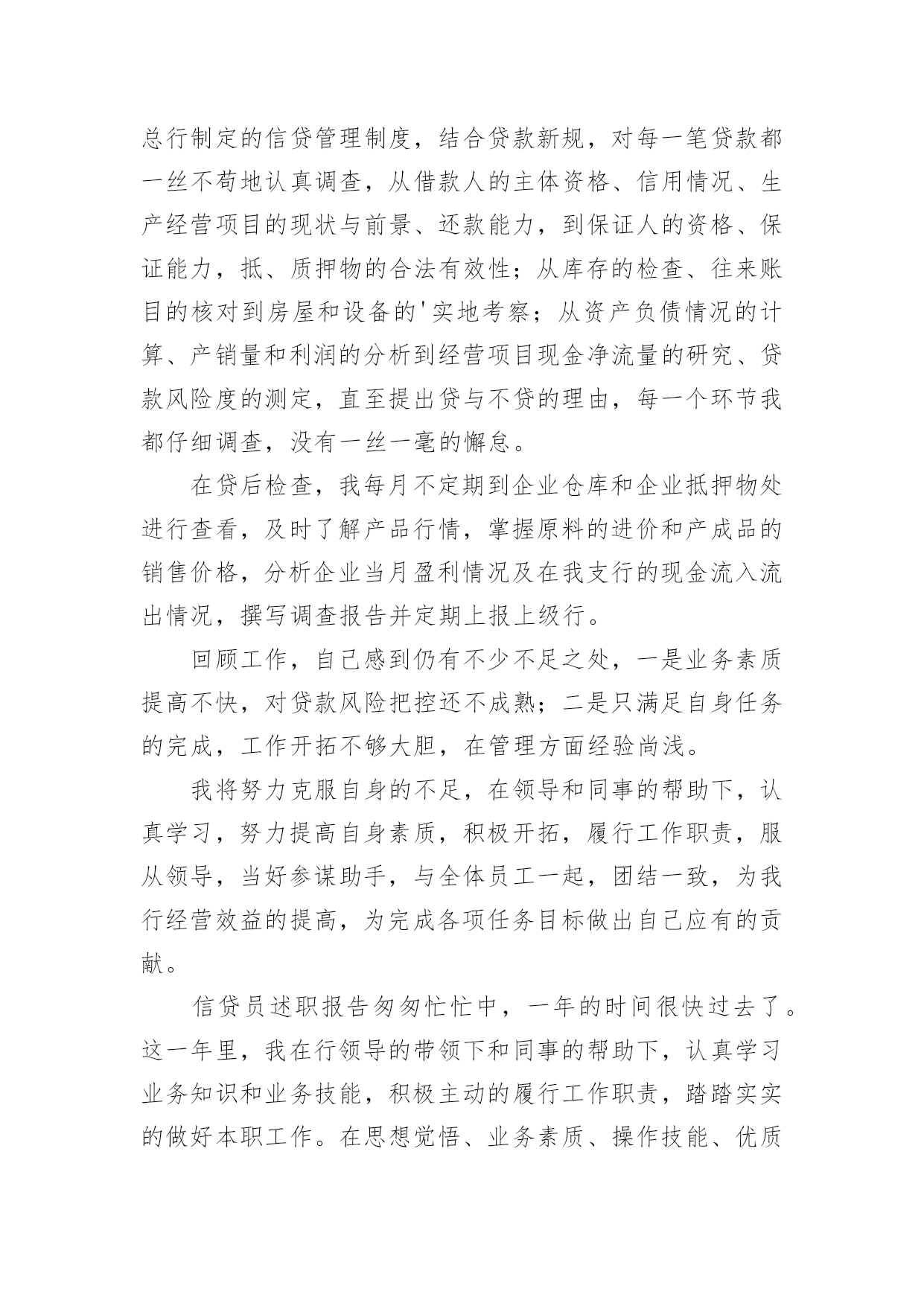 信贷员述职报告信贷员述职报告15篇在当下社会,报告与我们的生活紧密相连,多数报告都是在事情做完或发生后撰写的。相信很多朋友都对写报告感到非常苦恼吧,下面是小编为大家收集的信贷员述职报告,欢迎阅读与收藏。信贷员述职报告1在匆匆忙忙中,一年的时间很快过去了。在这过去的一年里,我在领导的带领和同事的帮助下,认真履行职责,踏踏实实的做好本职工作。我热爱自己的本职工作,能够正确认真的去对待每一项任务,把金融政策及精神灵活的运用在工作中,工作中能够采取积极主动认真遵守规章制度,及时完成领导交办的各项工作任务。现将一年