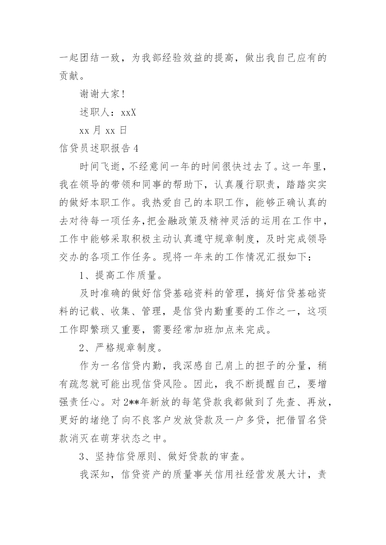 信贷员的述职报告信贷员的述职报告范文(精选3篇)时光在流逝,从不停歇;万物在更新,而我们在成长,回顾过去这段时间的工作,收获颇丰,好好准备一份述职报告吧。那么应当如何写述职报告呢?以下是小编为大家整理的信贷员的述职报告范文(精选3篇),欢迎大家分享。信贷员的述职报告1尊敬的领导,各位同事:大家好!匆匆忙忙中,一年的时间很快过去了。这一年里,我在领导的带领和同事的帮助下,认真履行职责,踏踏实实的做好本职工作。我热爱自己的本职工作,能够正确认真的去对待每一项任务,把金融政策及精神灵活的运用在工作中,工作中能够