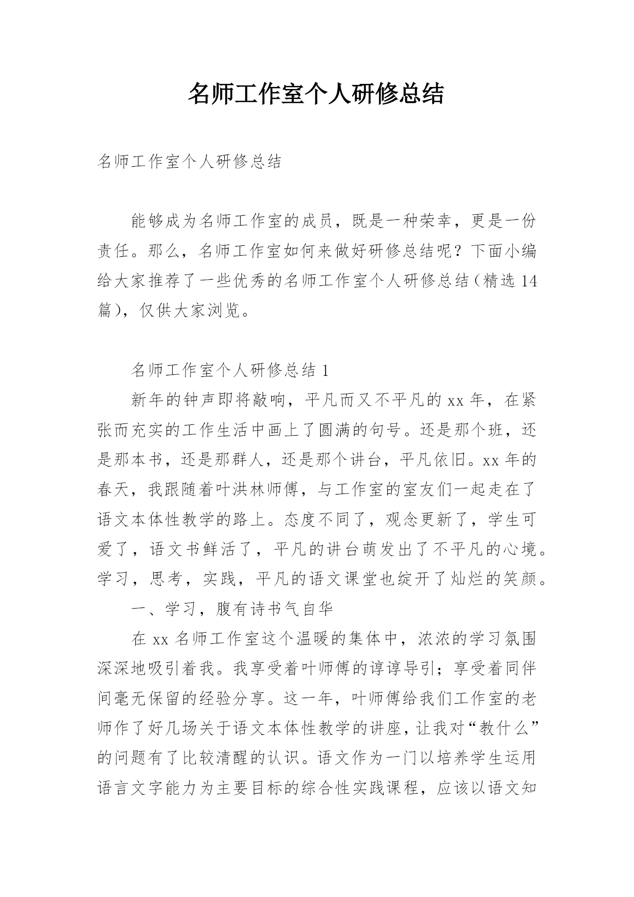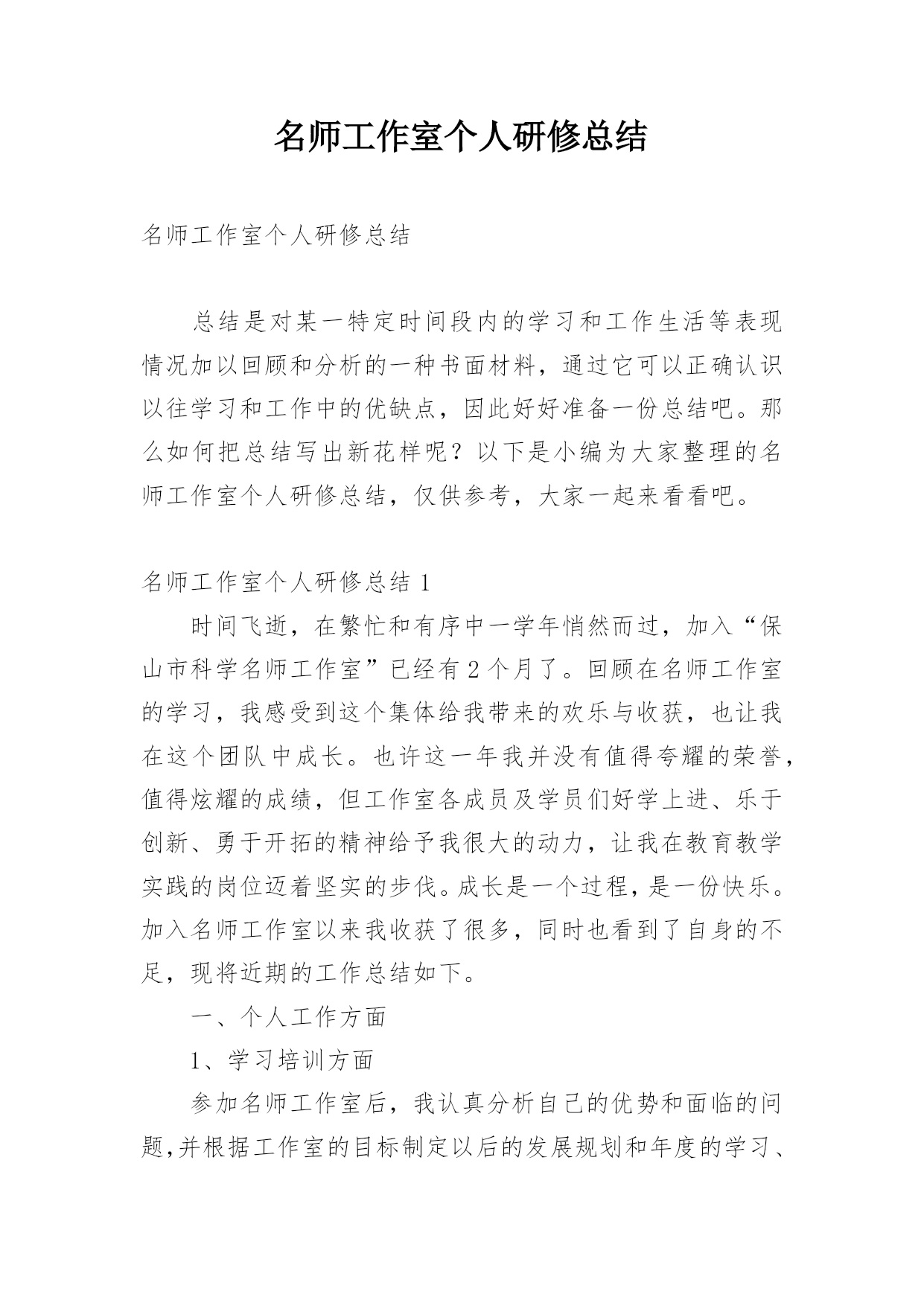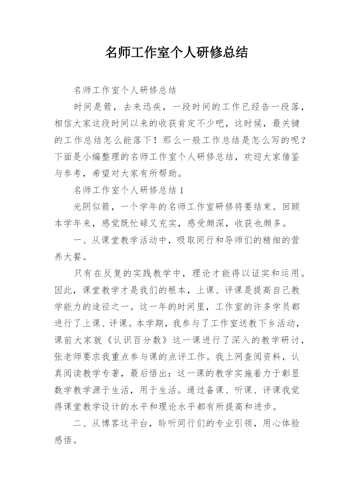 名师工作室个人研修总结名师工作室个人研修总结总结是对某一特定时间段内的学习和工作生活等表现情况加以回顾和分析的一种书面材料,通过它可以正确认识以往学习和工作中的优缺点,因此好好准备一份总结吧。那么如何把总结写出新花样呢?以下是小编为大家整理的名师工作室个人研修总结,仅供参考,大家一起来看看吧。名师工作室个人研修总结1时间飞逝,在繁忙和有序中一学年悄然而过,加入“保山市科学名师工作室”已经有2个月了。回顾在名师工作室的学习,我感受到这个集体给我带来的欢乐与收获,也让我在这个团队中成长。也许这一年我并没有值得