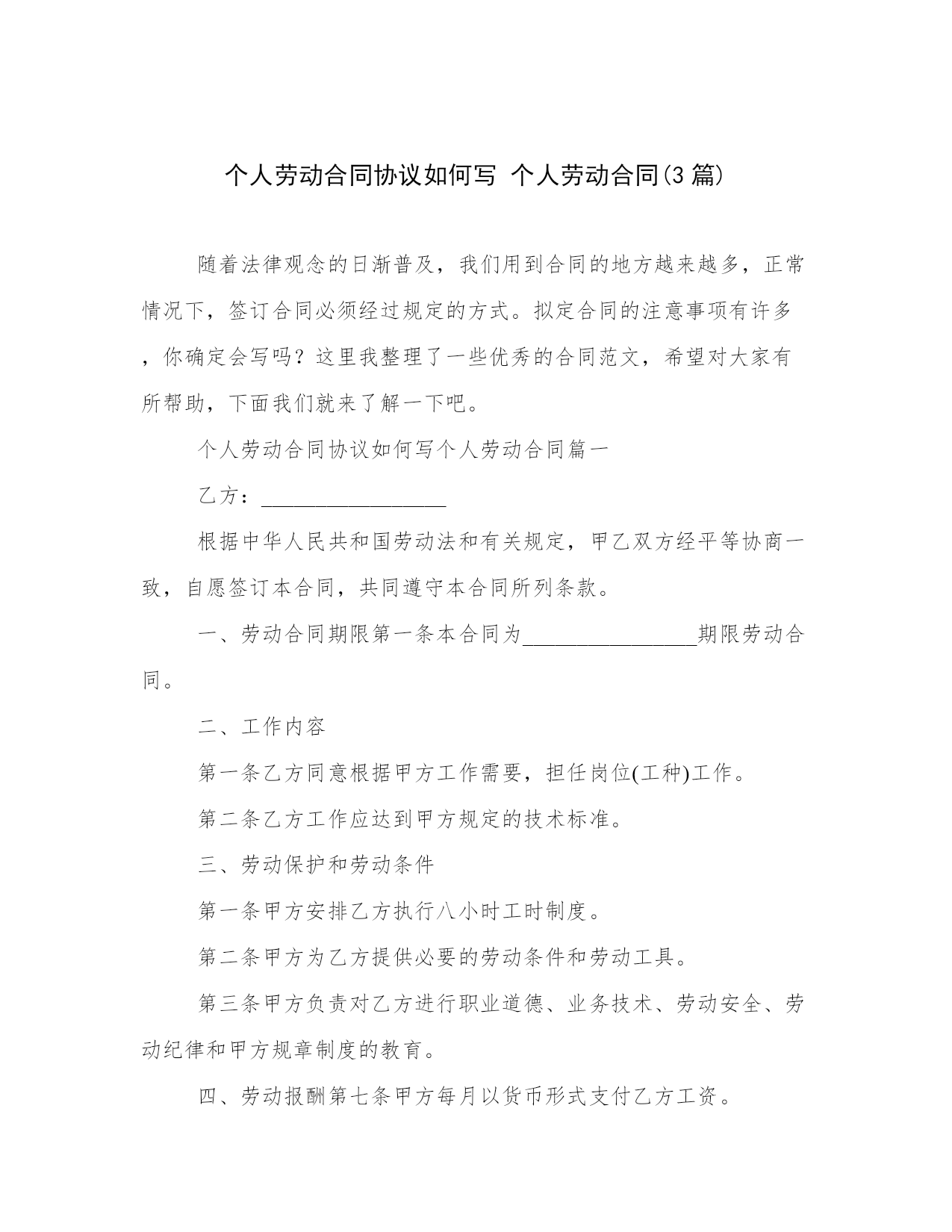 个人劳动合同协议如何写 个人劳动合同(3篇).docx