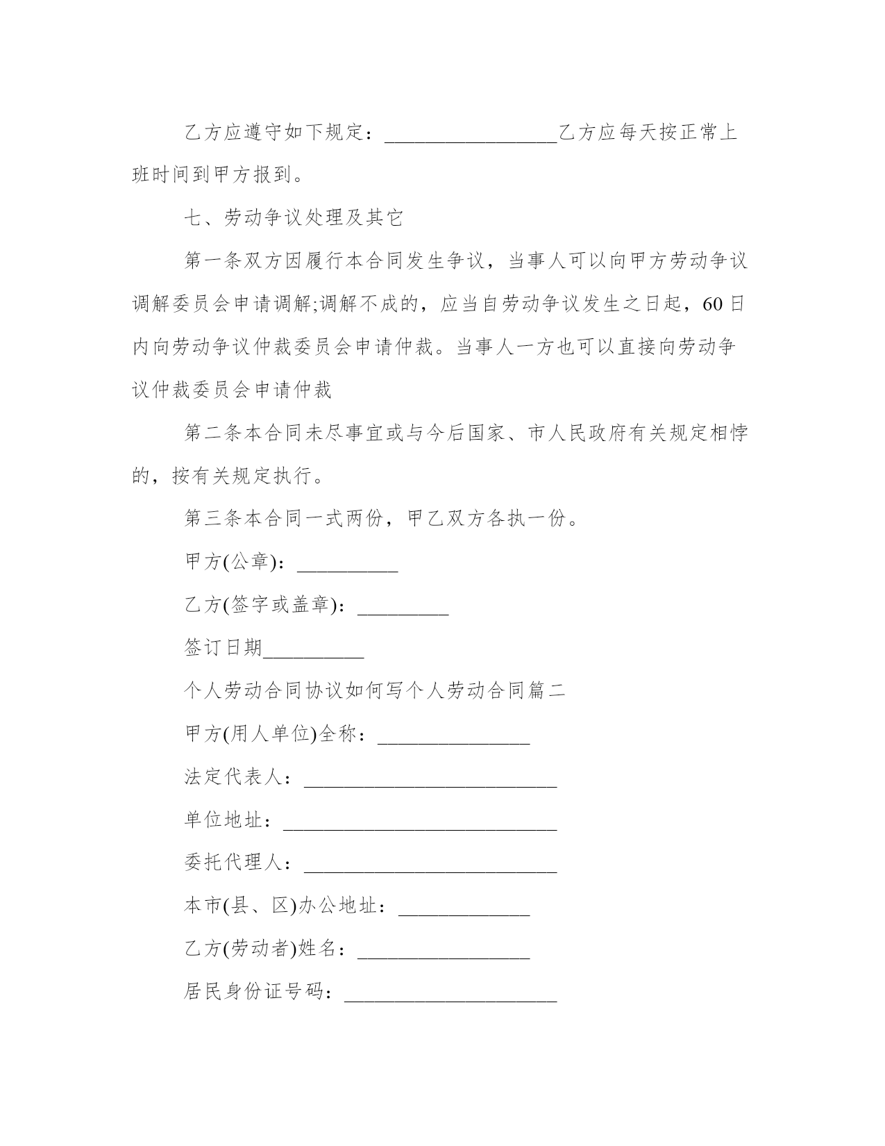 个人劳动合同协议如何写个人劳动合同(3篇)随着法律观念的日渐普及,我们用到合同的地方越来越多,正常情况下,签订合同必须经过规定的方式。拟定合同的注意事项有许多,你确定会写吗?这里我整理了一些优秀的合同范文,希望对大家有所帮助,下面我们就来了解一下吧。个人劳动合同协议如何写个人劳动合同篇一乙方:_________________根据中华人民共和国劳动法和有关规定,甲乙双方经平等协商一致,自愿签订本合同,共同遵守本合同所列条款。一、劳动合同期限第一条本合同为________________期限劳动合同。二、工
