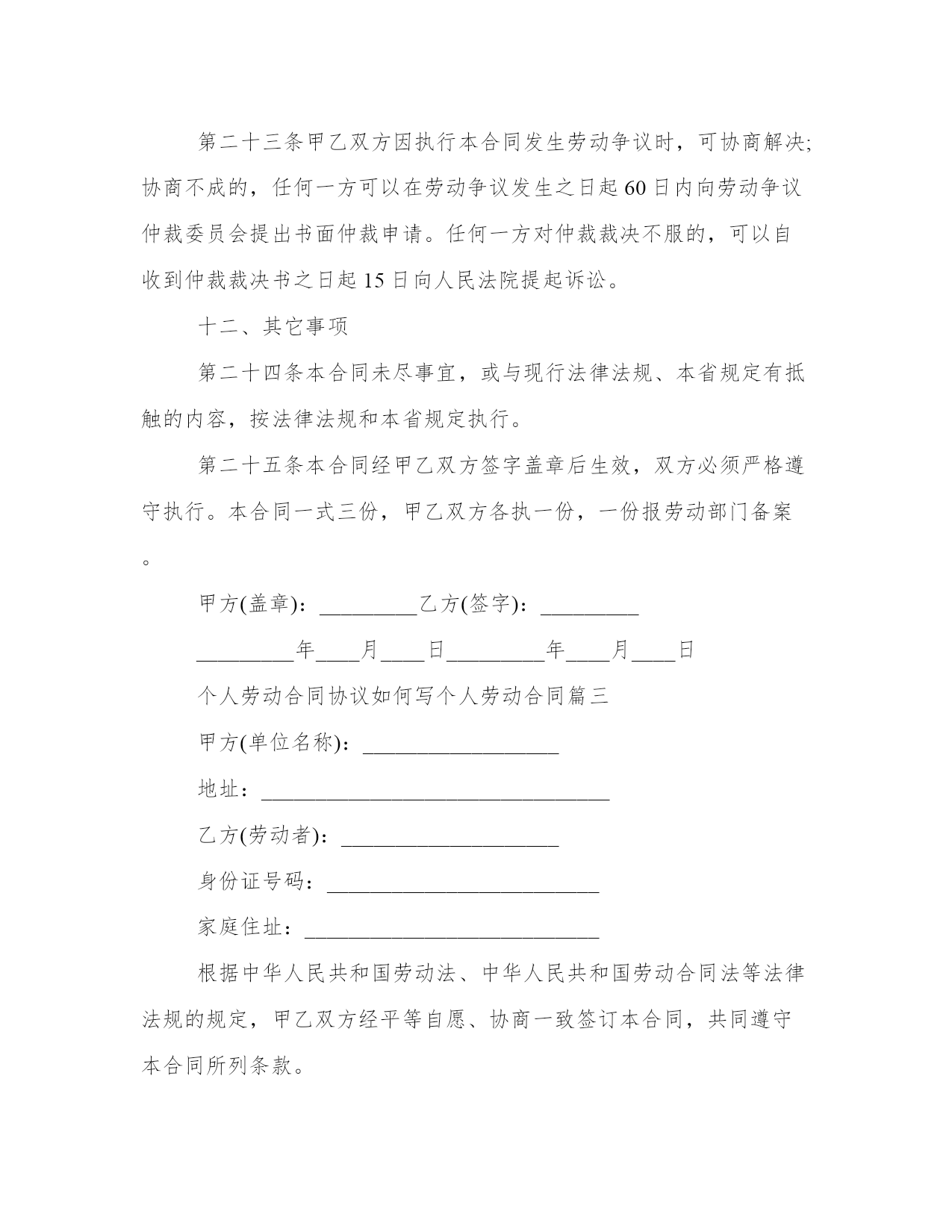 2023个人劳动合同协议如何写2023个人劳动合同协议如何写(精选3篇)2023个人劳动合同协议如何写篇1甲方(单位名称):__________________地址:________________________________乙方(劳动者):____________________身份证号码:_________________________家庭住址:___________________________根据《中华人民共和国劳动法》、《中华人民共和国劳动合同法》等法律法规的规定,甲乙双方经平等自愿