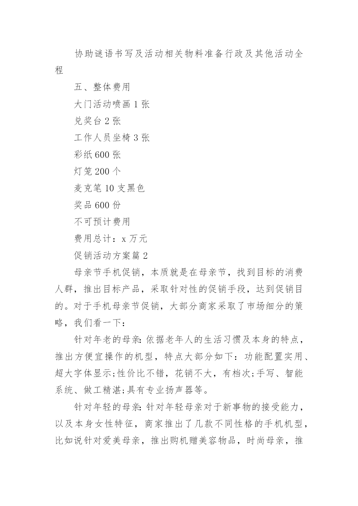 促销活动方案节假日促销方案一、活动主题情迷中秋月——大型灯谜活动二、活动时间待定三、活动地点商场一楼中厅四、活动内容活动期间,凡在本商场一次性购物满_x元(含_x元以上)即可参加猜灯谜活动,猜中者可获得精美礼品一份;每天限送礼品200份,先到先得,送完即止(一)、活动细则:1、活动期内,凡在本商场购物单张小票金额满_x元(含_x元以上),即可参加猜灯谜活动;猜中者可获得本商场赠送的精美礼品一份,一张小票限领一份奖品。2、每天送出奖品200份,数量有限,送完即止。3、顾客凭有效的销售小票先到一楼中厅兑奖处核
