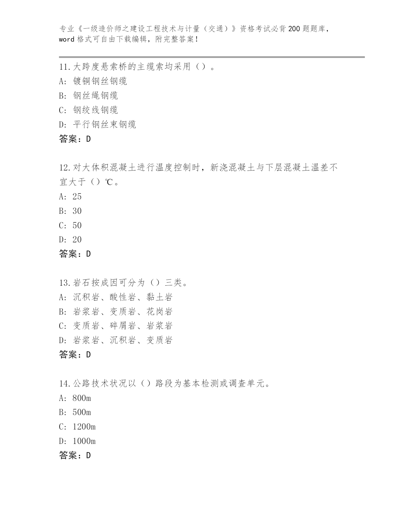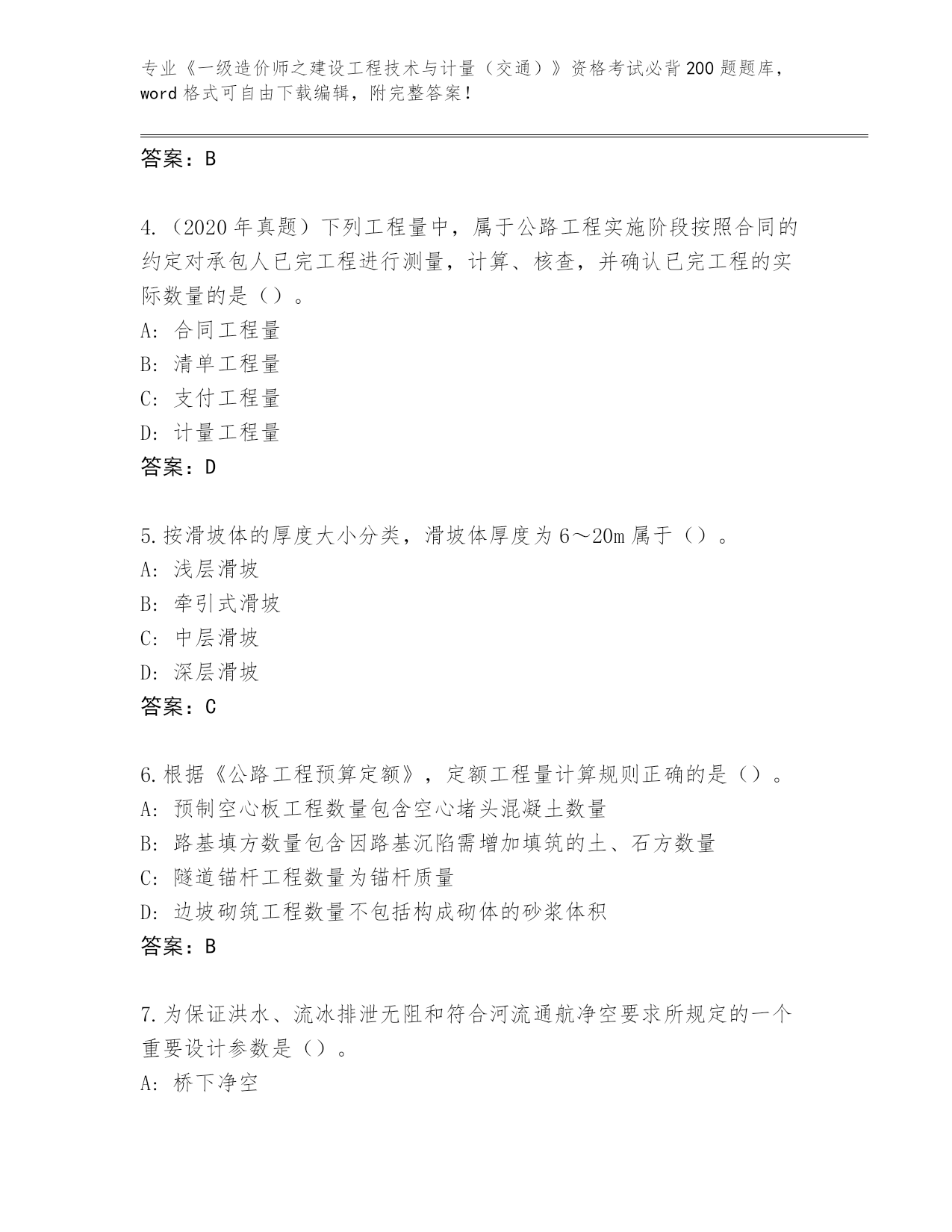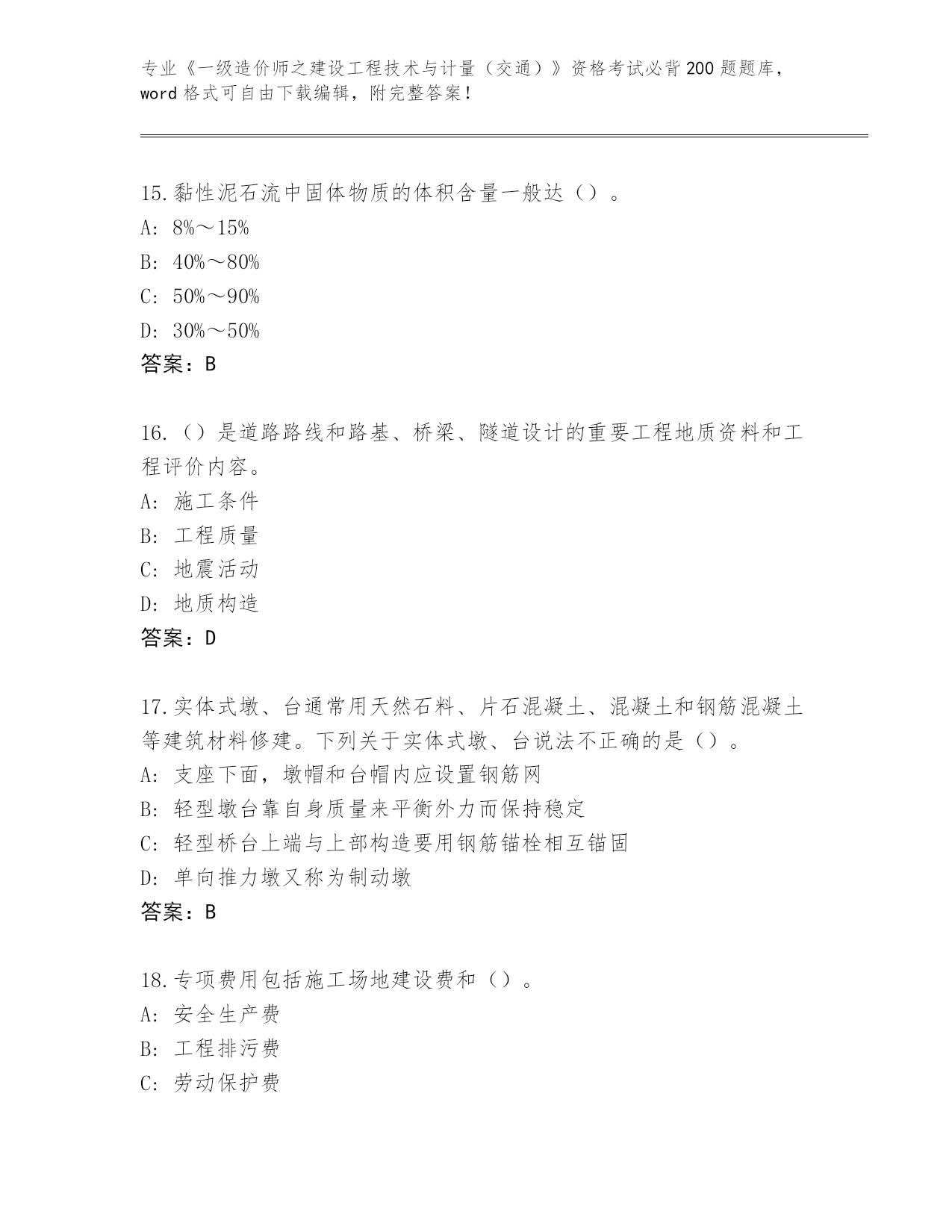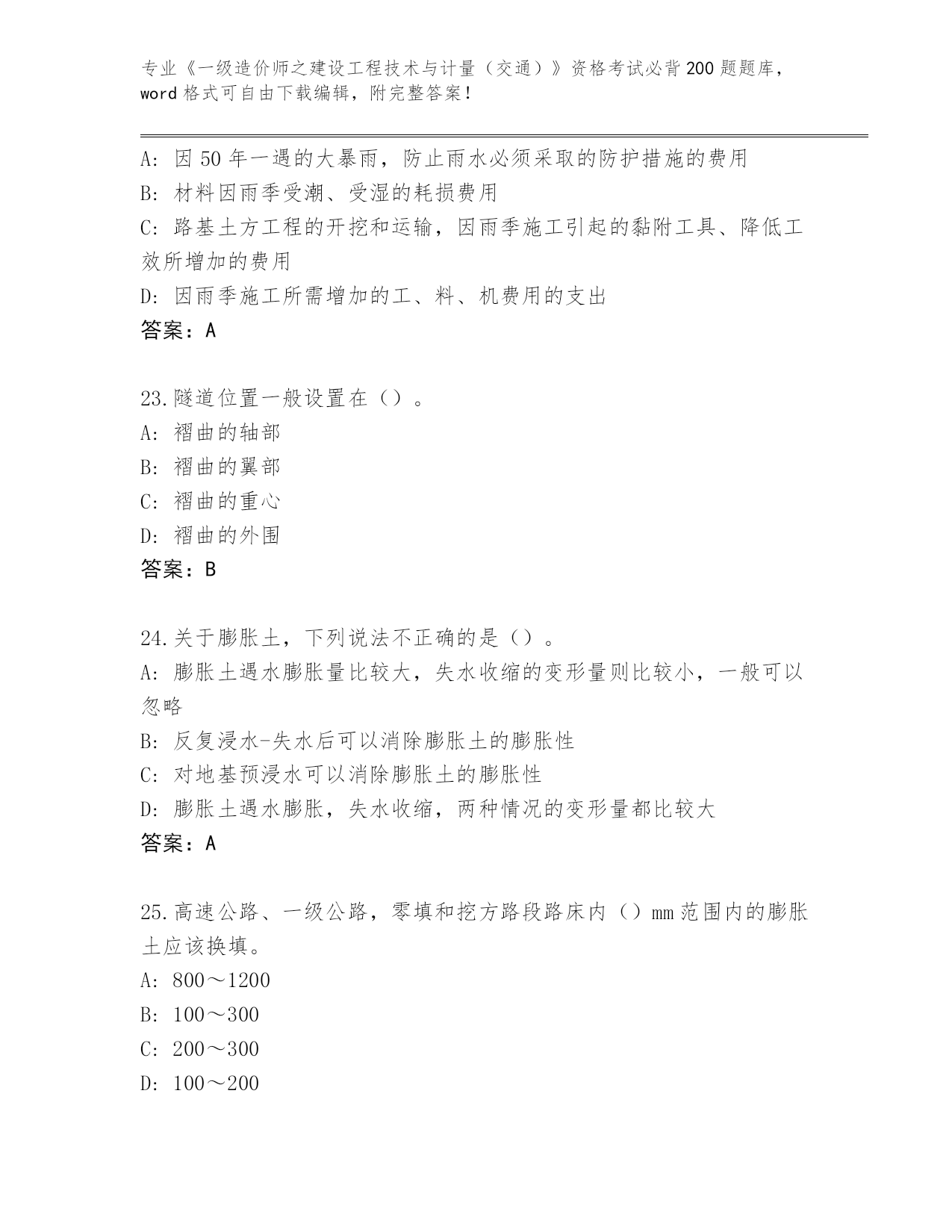 专业《一级造价师之建设工程技术与计量(交通)》考试必背200题题库,word格式可自由下载编辑,附完整答案!辽宁省振兴区《一级造价师之建设工程技术与计量(交通)》考试必背200题含答案(预热题)第I部分单选题(100题)1.下列不属于公路工程建设中的临时工程的是()。A:轨道铺设B:架设输电线路C:混凝土浇筑D:汽车便道答案:C2.河流的作用方式包括溶蚀和()。A:溯源侵蚀B:下蚀作用C:侧蚀作用D:机械侵蚀答案:D3.()颗粒极细,具有很大的亲水性、可塑性及膨胀性。A:碎屑物质B:化学沉积矿物C:有机质