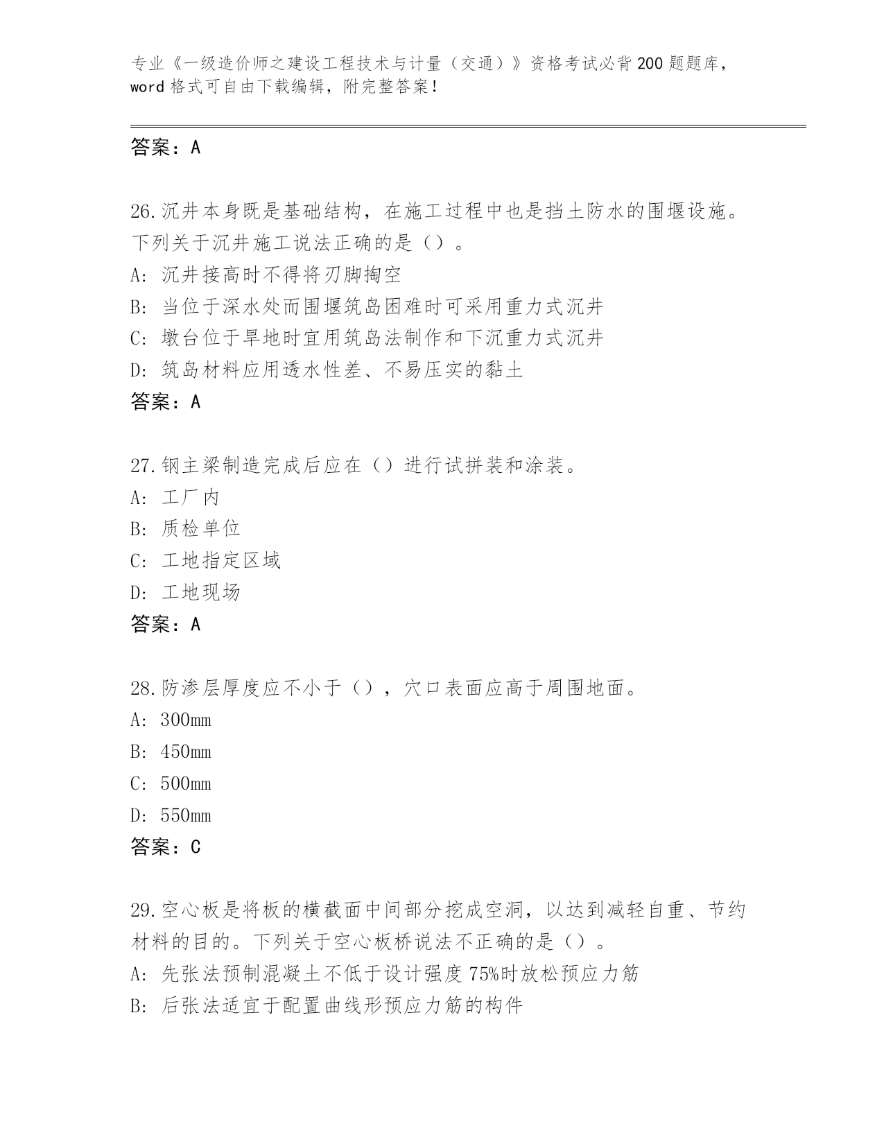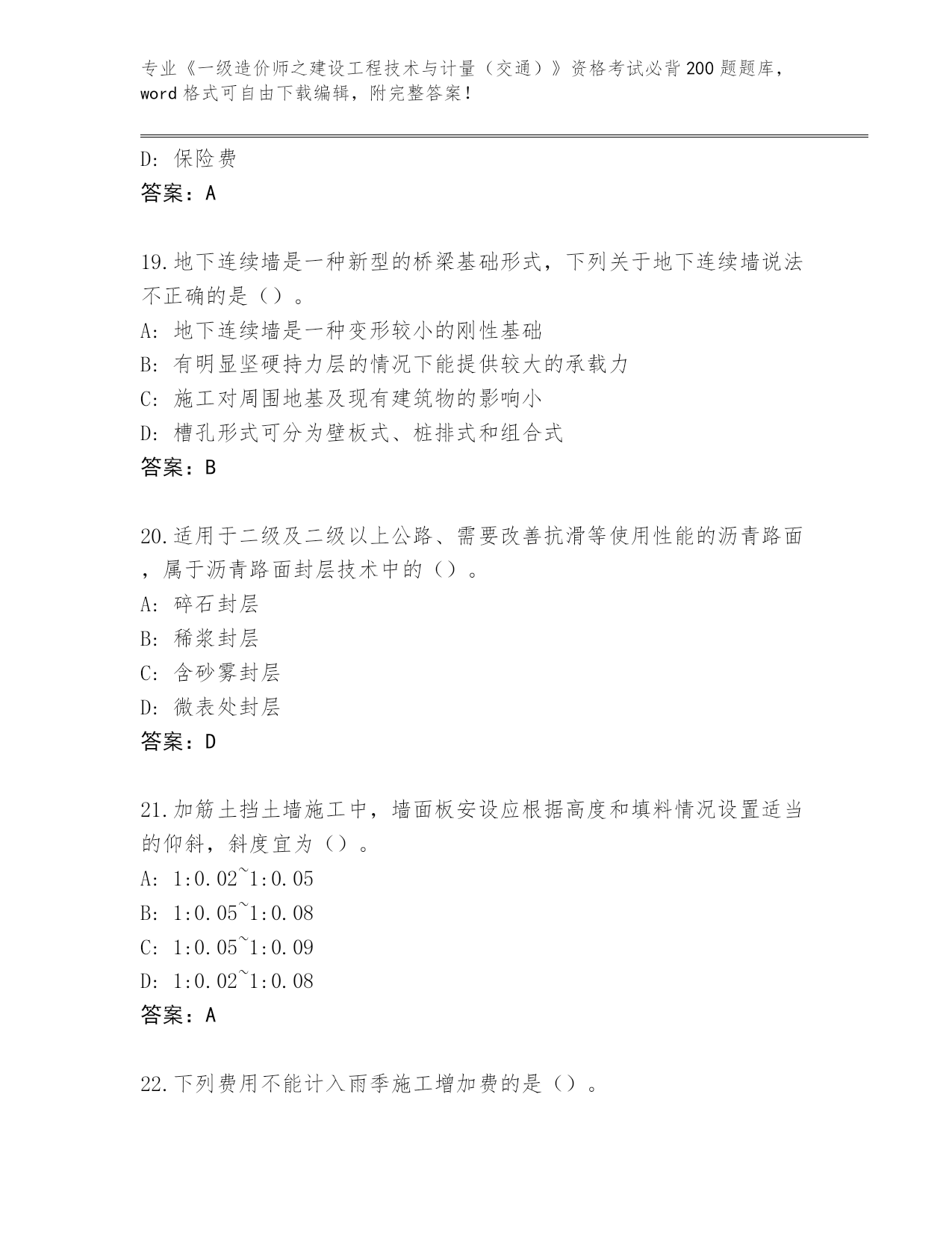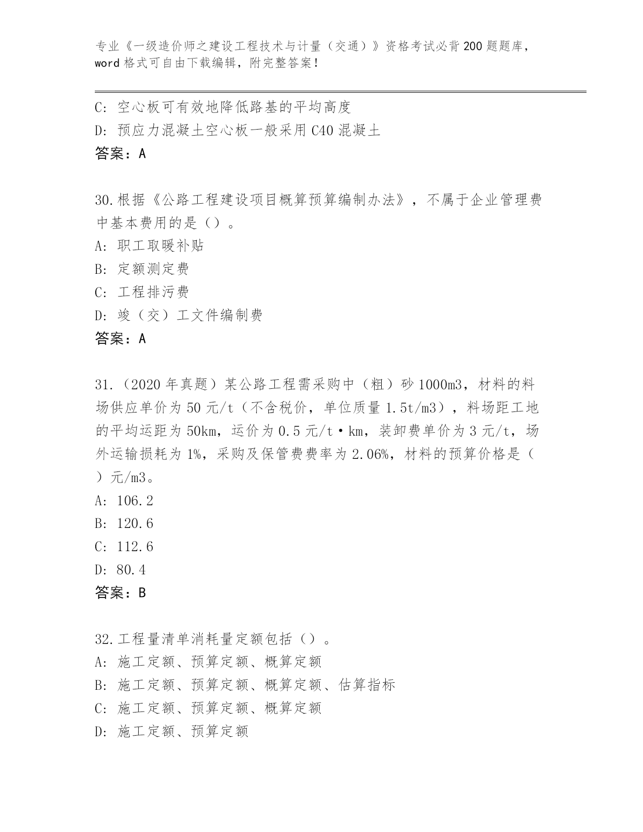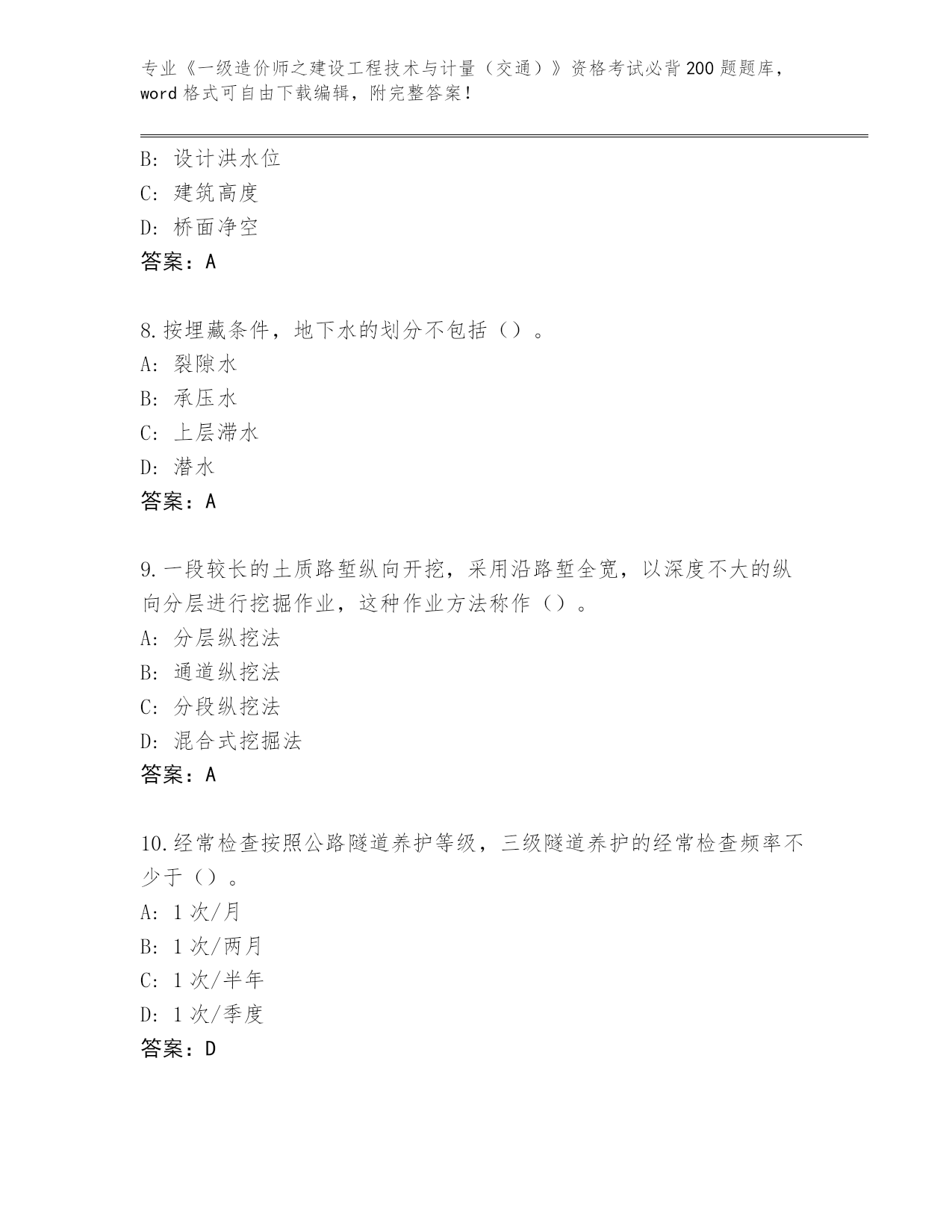 专业《一级造价师之建设工程技术与计量(交通)》考试必背200题题库,word格式可自由下载编辑,附完整答案!辽宁省振兴区《一级造价师之建设工程技术与计量(交通)》考试必背200题含答案(预热题)第I部分单选题(100题)1.下列不属于公路工程建设中的临时工程的是()。A:轨道铺设B:架设输电线路C:混凝土浇筑D:汽车便道答案:C2.河流的作用方式包括溶蚀和()。A:溯源侵蚀B:下蚀作用C:侧蚀作用D:机械侵蚀答案:D3.()颗粒极细,具有很大的亲水性、可塑性及膨胀性。A:碎屑物质B:化学沉积矿物C:有机质