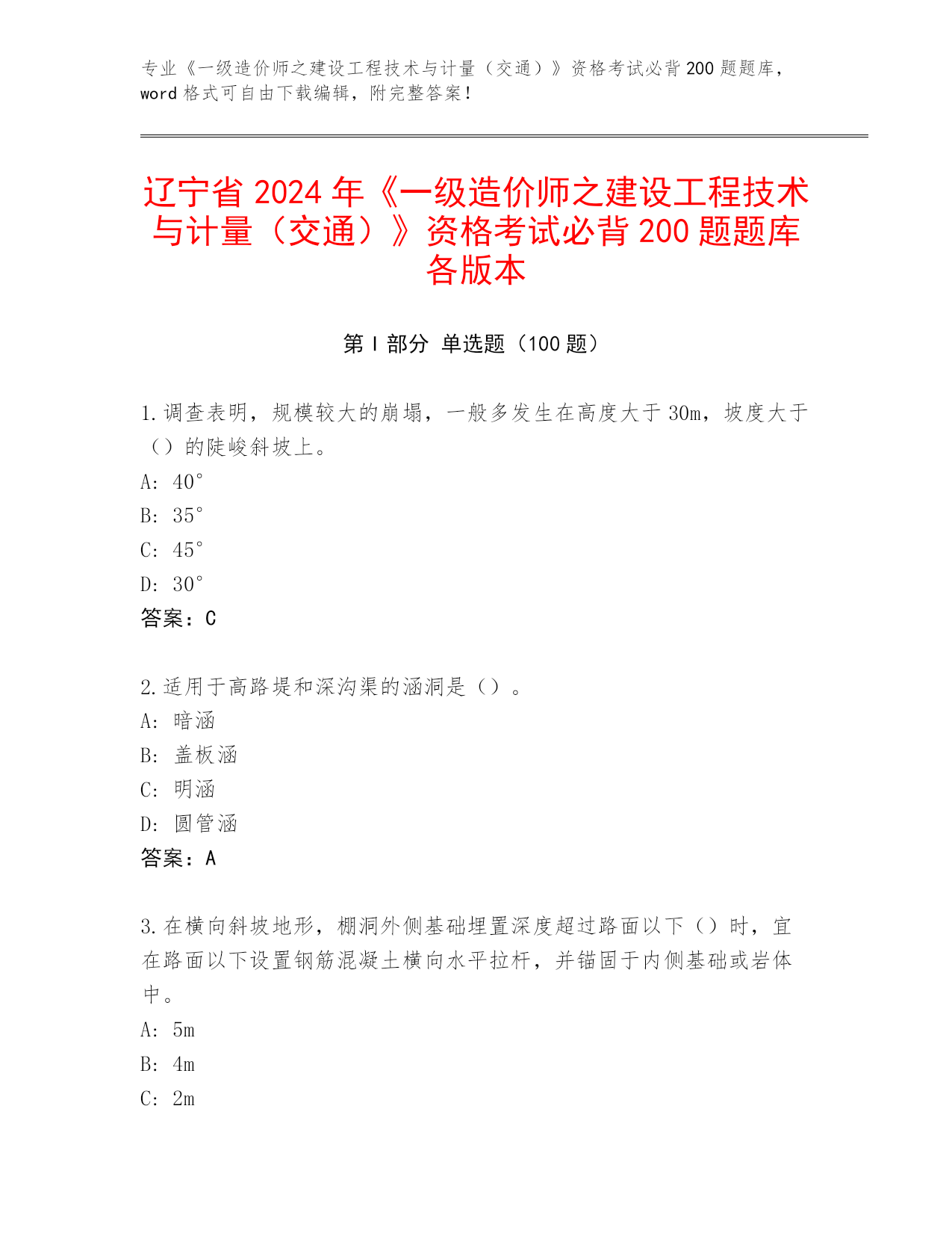 辽宁省2024年《一级造价师之建设工程技术与计量(交通)》资格考试必背200题题库各版本.docx