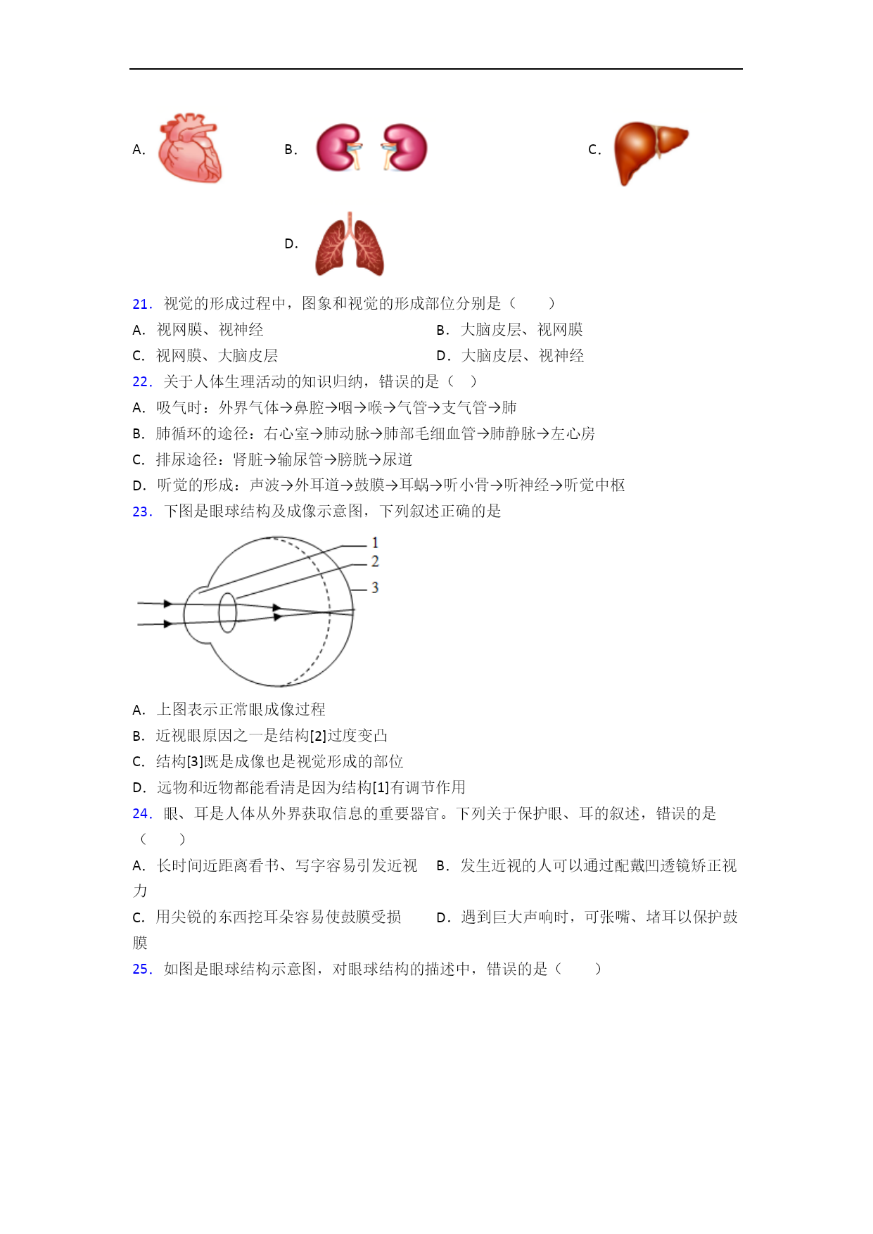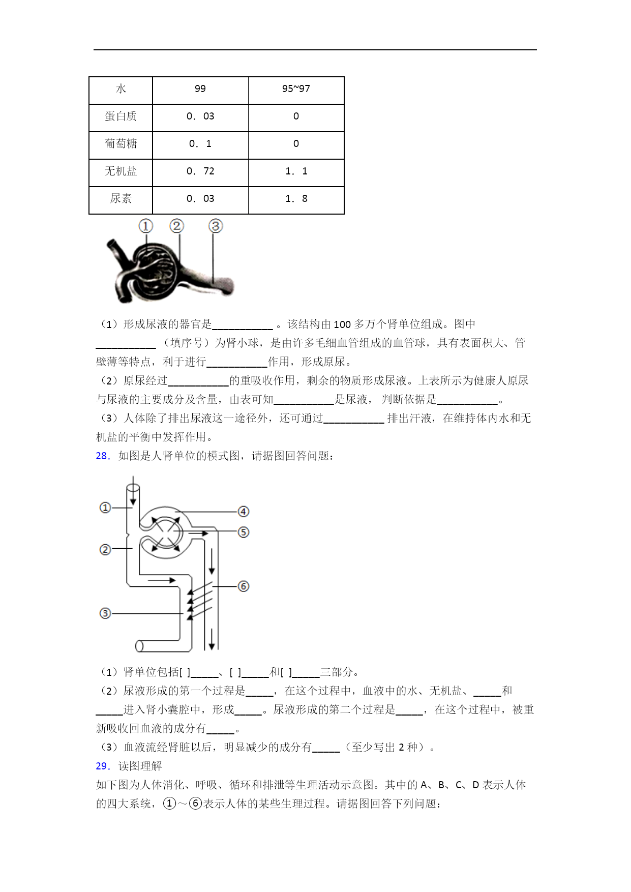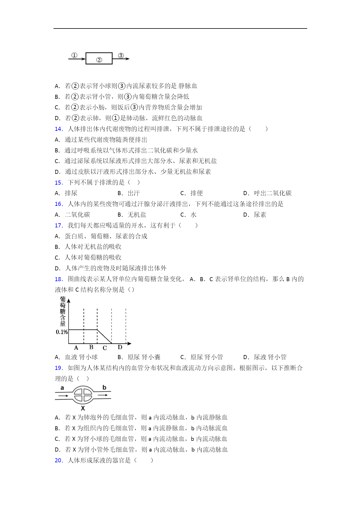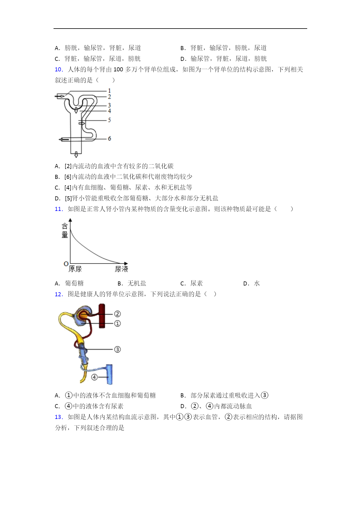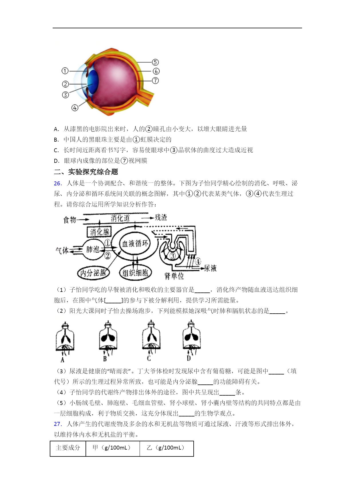 人教版初一生物第六章人体生命活动的调节单元易错题难题自检题检测一、选择题1.如图是尿的形成过程示意图,序号①至⑦表示相关结构,下列叙述错误的是A.每个肾单位是由①②⑥等部分组成B.①②起过滤作用,⑥起重吸收作用C.③、⑤、⑥中尿素浓度最低的是⑥D.健康人进食过咸的食物,⑦中盐分会增加2.下列关于人体部分器官功能的叙述,不正确的是A.膀胱——暂时储存尿液B.子宫——受精的场所C.肺——气体交换的场所D.小肠——消化和吸收的主要场所3.下列与尿液形成和排出过程无直接关系的器官是()A.心脏B.输尿管C.肾脏D