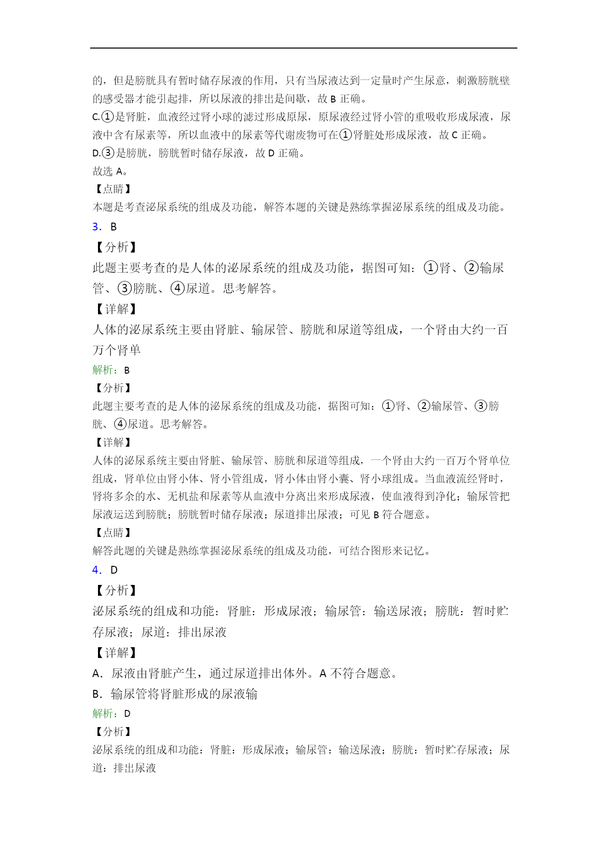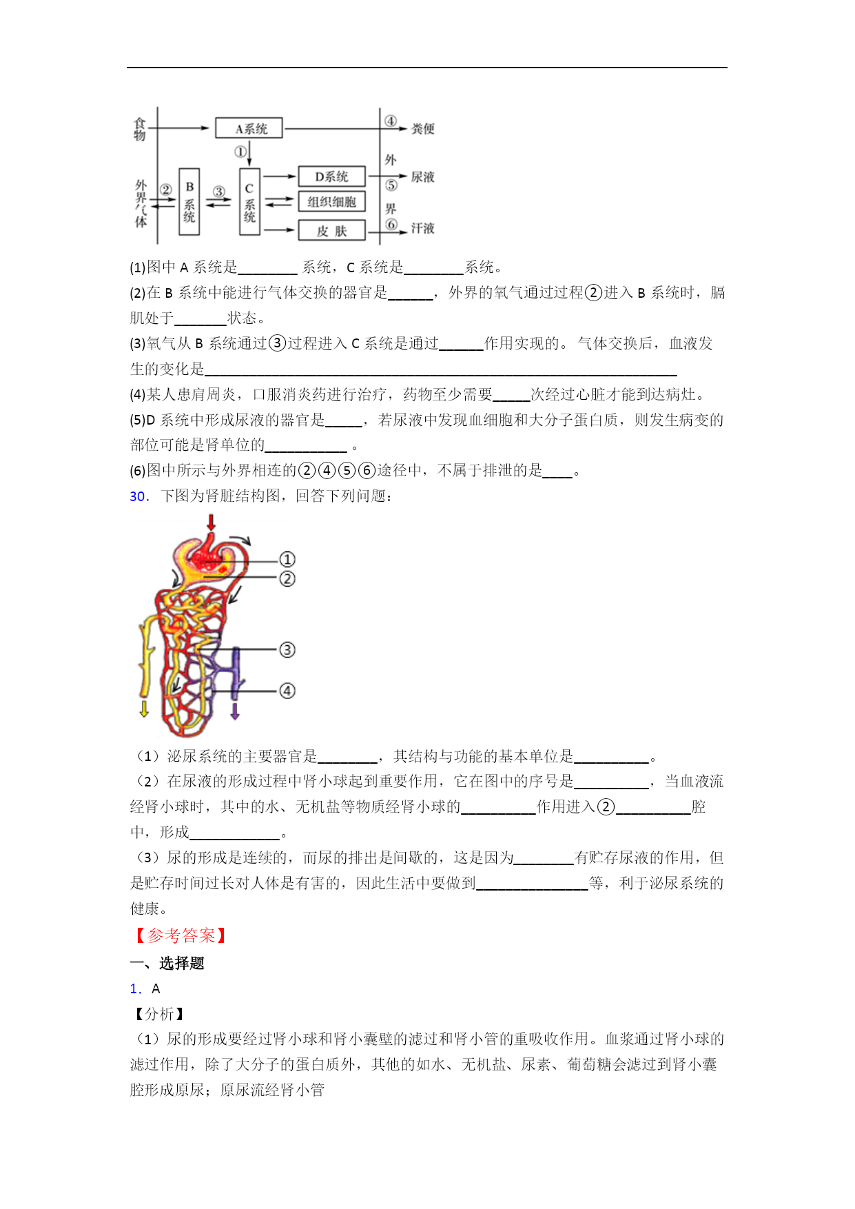 苏科版初一生物第六章人体生命活动的调节单元易错题专项训练检测一、选择题1.如图是尿液形成过程示意图。某人尿液中检出红细胞、蛋白质等成分,推断可能发生病变的部位是()A.①B.②C.③D.④2.下列有关泌尿系统的组成和功能的叙述中,不正确的是A.肾脏是泌尿系统组成之一,其结构和功能的基本单位是肾单位B.泌尿系统的组成中,形成尿液的器官是膀胱C.人体排出废物最主要的途径是通过泌尿系统D.人体的泌尿系统由肾脏、输尿管、膀胱和尿道组成3.泌尿系统的组成是()A.肾脏、输尿管、膀胱、尿道B.肾脏、肾小球、肾小囊、肾