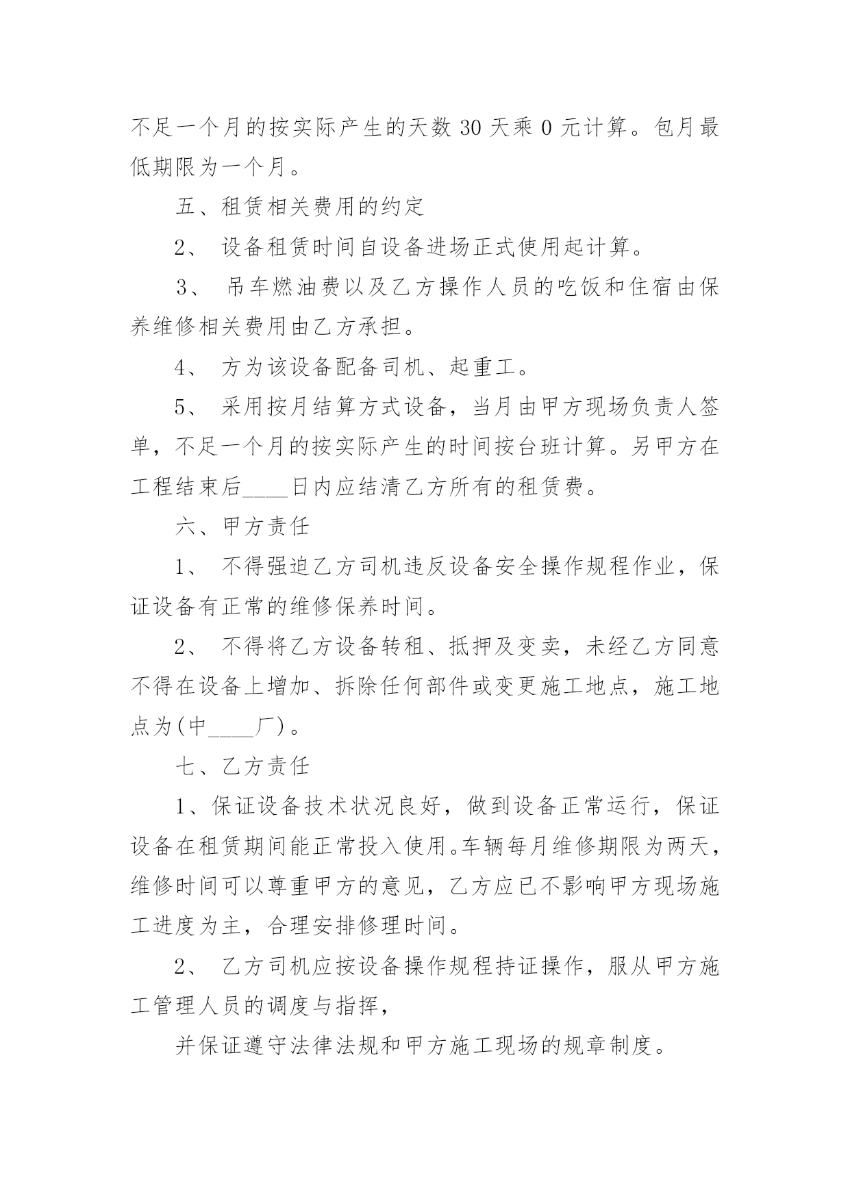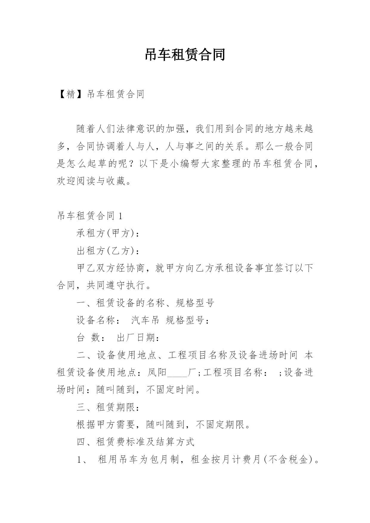 吊车租赁合同(精选)吊车租赁合同在人们愈发重视契约的社会中,合同对我们的帮助越来越大,合同能够促使双方正确行使权力,严格履行义务。知道吗,写合同可是有方法的哦,以下是小编为大家整理的吊车租赁合同,欢迎阅读,希望大家能够喜欢。吊车租赁合同1承租方(甲方):xxxxx出租方(乙方):xxxxx甲乙双方经协商,就甲方向乙方承租设备事宜签订以下合同,共同遵守执行。一、租赁设备的名称、规格型号设备名称:汽车吊规格型号:xxxxx台数:xxxxx出厂日期:xxxxx二、设备使用地点、工程项目名称及设备进场时间本租赁设