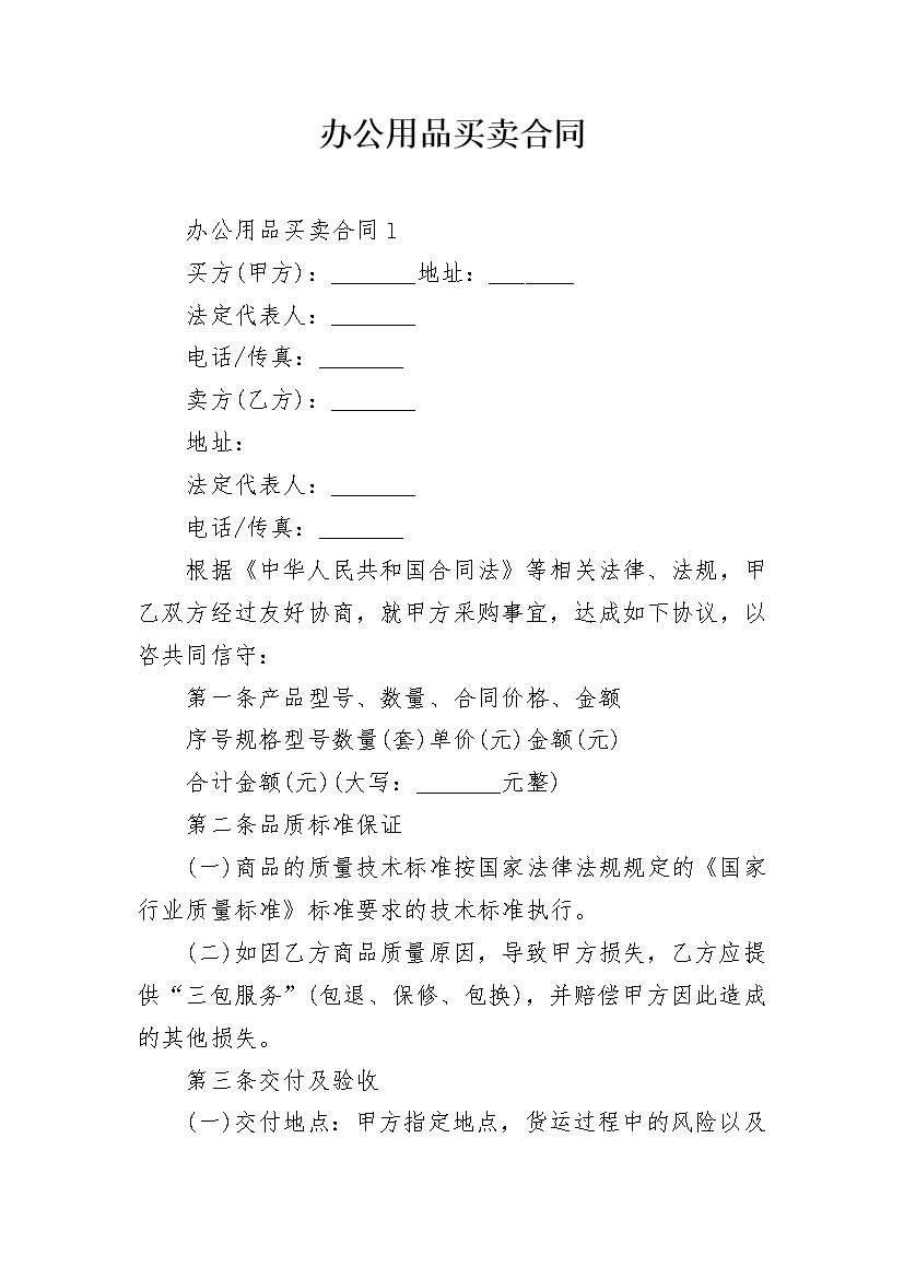 办公用品买卖合同办公用品买卖合同1买方(甲方):_______地址:_______法定代表人:_______电话/传真:_______卖方(乙方):_______地址:法定代表人:_______电话/传真:_______根据《中华人民共和国合同法》等相关法律、法规,甲乙双方经过友好协商,就甲方采购事宜,达成如下协议,以咨共同信守:第一条产品型号、数量、合同价格、金额序号规格型号数量(套)单价(元)金额(元)合计金额(元)(大写:_______元整)第二条品质标准保证(一)商品的质量技术标准按国家法律法规规
