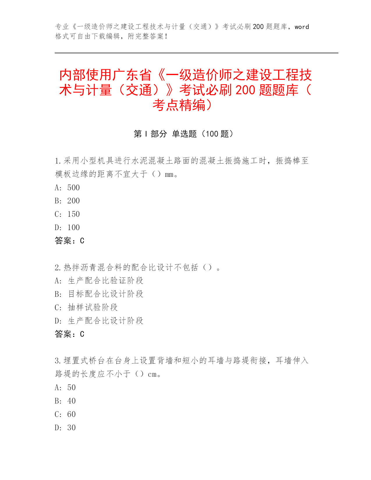 专业《一级造价师之建设工程技术与计量(交通)》考试必刷200题题库,word格式可自由下载编辑,附完整答案!内部使用广东省《一级造价师之建设工程技术与计量(交通)》考试必刷200题题库(考点精编)第I部分单选题(100题)1.采用小型机具进行水泥混凝土路面的混凝土振捣施工时,振捣棒至模板边缘的距离不宜大于()mm。A:500B:200C:150D:100答案:C2.热拌沥青混合料的配合比设计不包括()。A:生产配合比验证阶段B:目标配合比设计阶段C:抽样试验阶段D:生产配合比设计阶段答案:C3.埋置式桥台