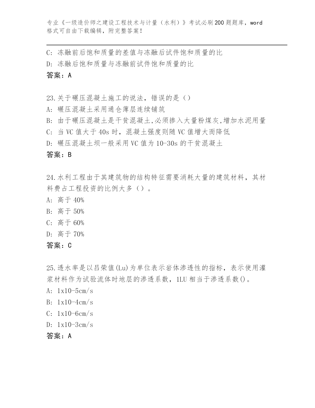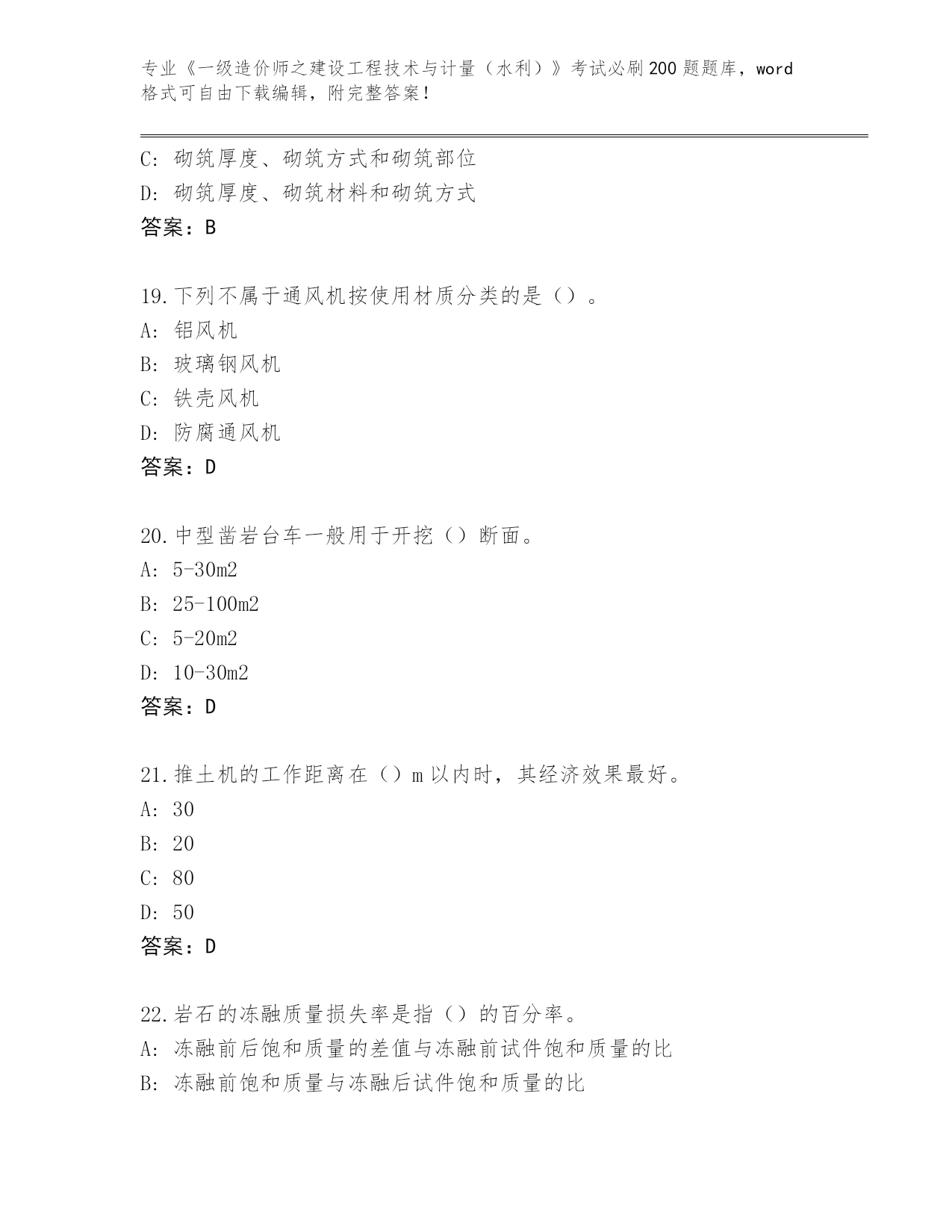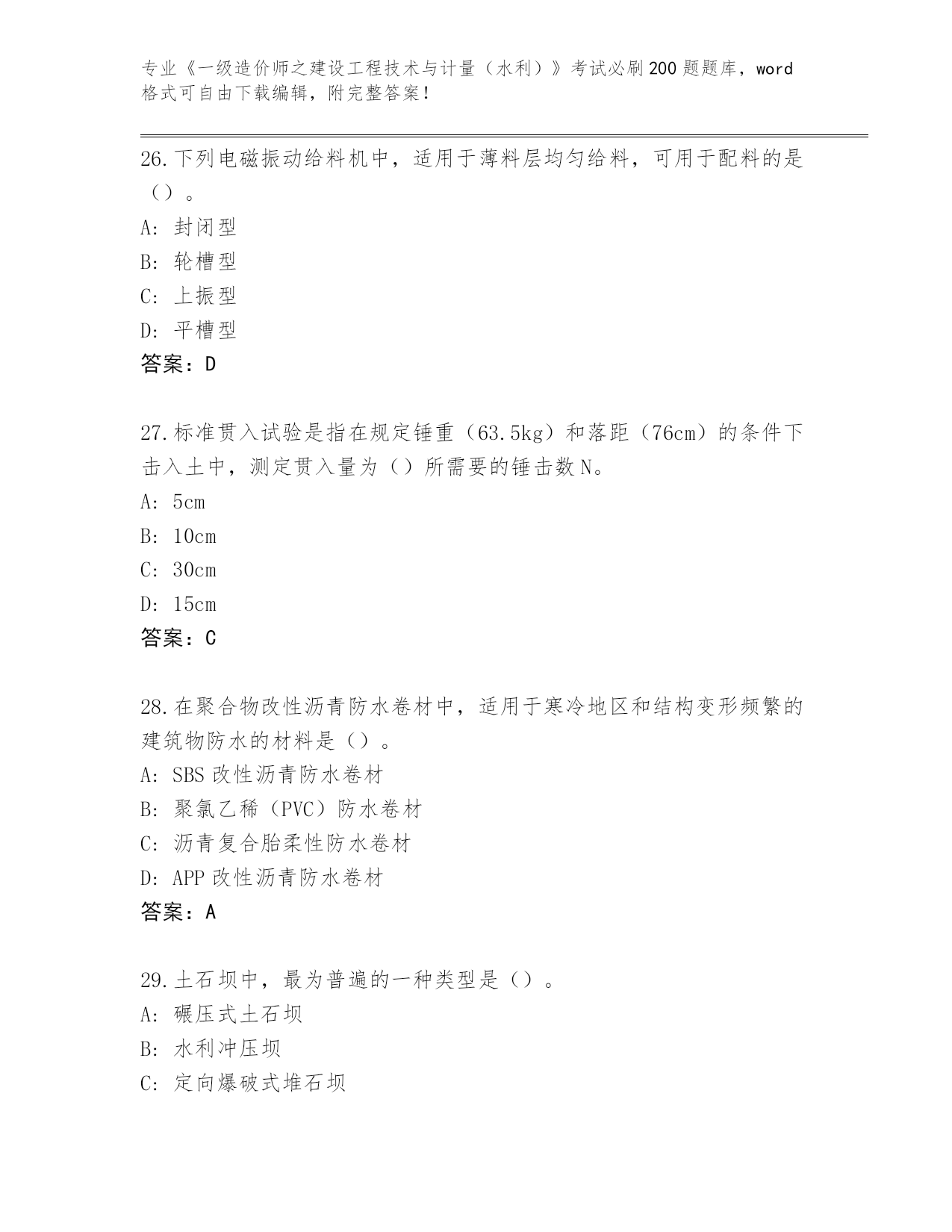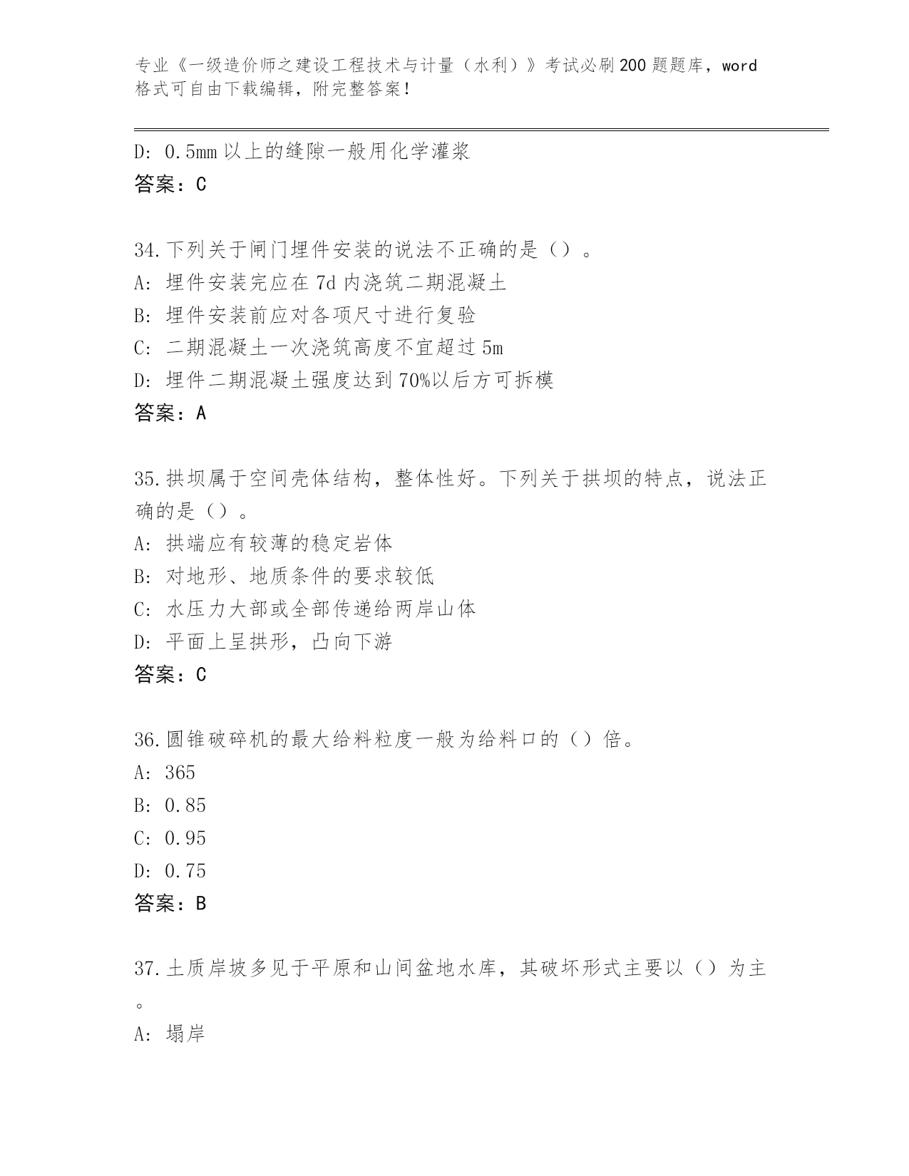 专业《一级造价师之建设工程技术与计量(水利)》考试必刷200题题库,word格式可自由下载编辑,附完整答案!内部使用吉林省洮北区《一级造价师之建设工程技术与计量(水利)》考试必刷200题精编答案第I部分单选题(100题)1.根据《水利工程工程量清单计价规范》(GB50501),水利工程工程量清单项目编码中的第五、六位为()A:专业工程顺序码B:水利工程顺序码C:分项工程顺序码D:分类工程顺序码答案:D2.闸门按构造特征分为平板闸门、弧形闸门、船闸闸门、一体化智能闸门和()。A:工作闸门B:露顶闸门C:金属