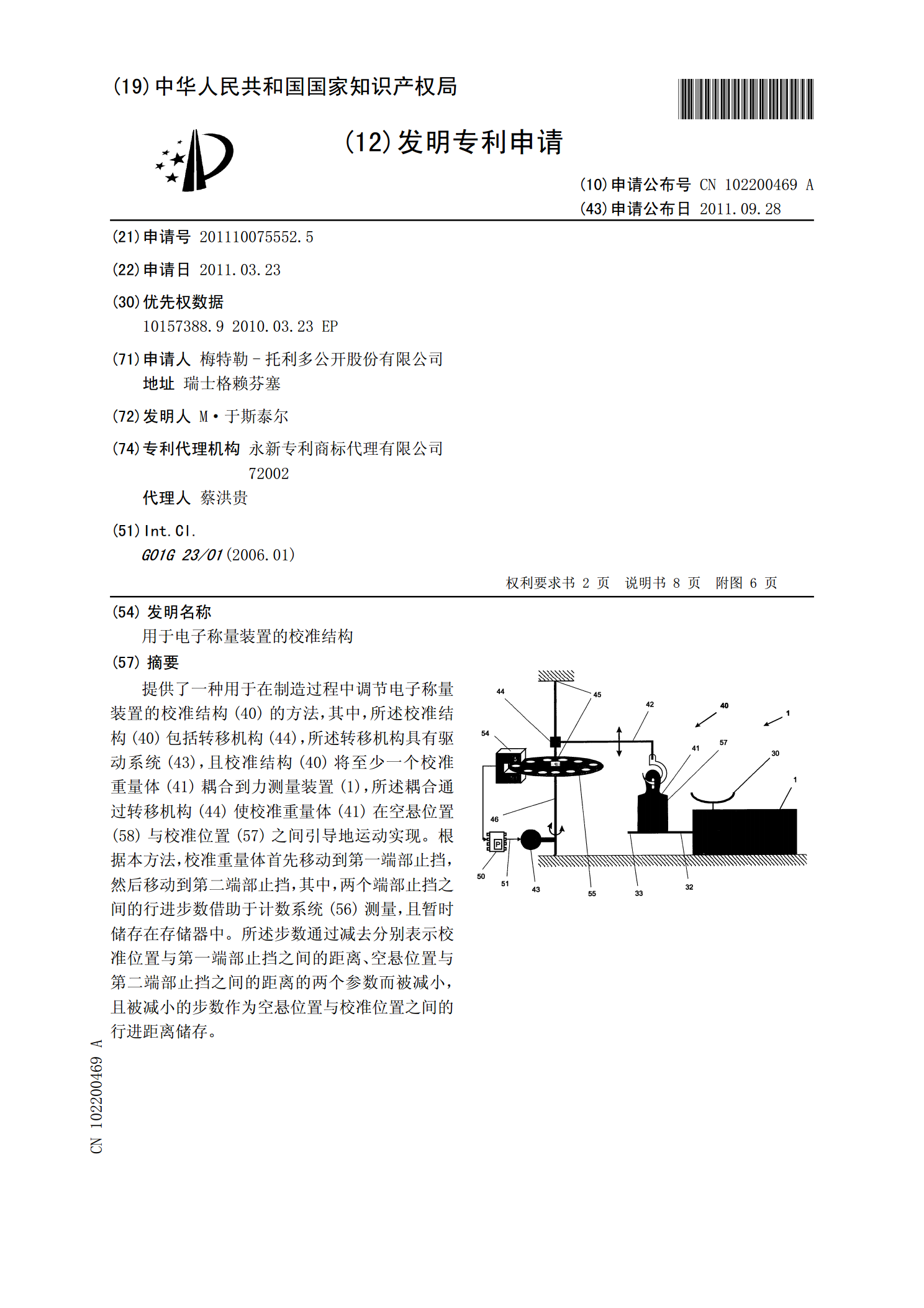 提供了一种用于在制造过程中调节电子称量装置的校准结构(40)的方法,其中,所述校准结构(40)包括转移机构(44),所述转移机构具有驱动系统(43),且校准结构(40)将至少一个校准重量体(41)耦合到力测量装置(1),所述耦合通过转移机构(44)使校准重量体(41)在空悬位置(58)与校准位置(57)之间引导地运动实现。根据本方法,校准重量体首先移动到第一端部止挡,然后移动到第二端部止挡,其中,两个端部止挡之间的行进步数借助于计数系统(56)测量,且暂时储存在存储器中。所述步数通过减去分别表示校准位置与