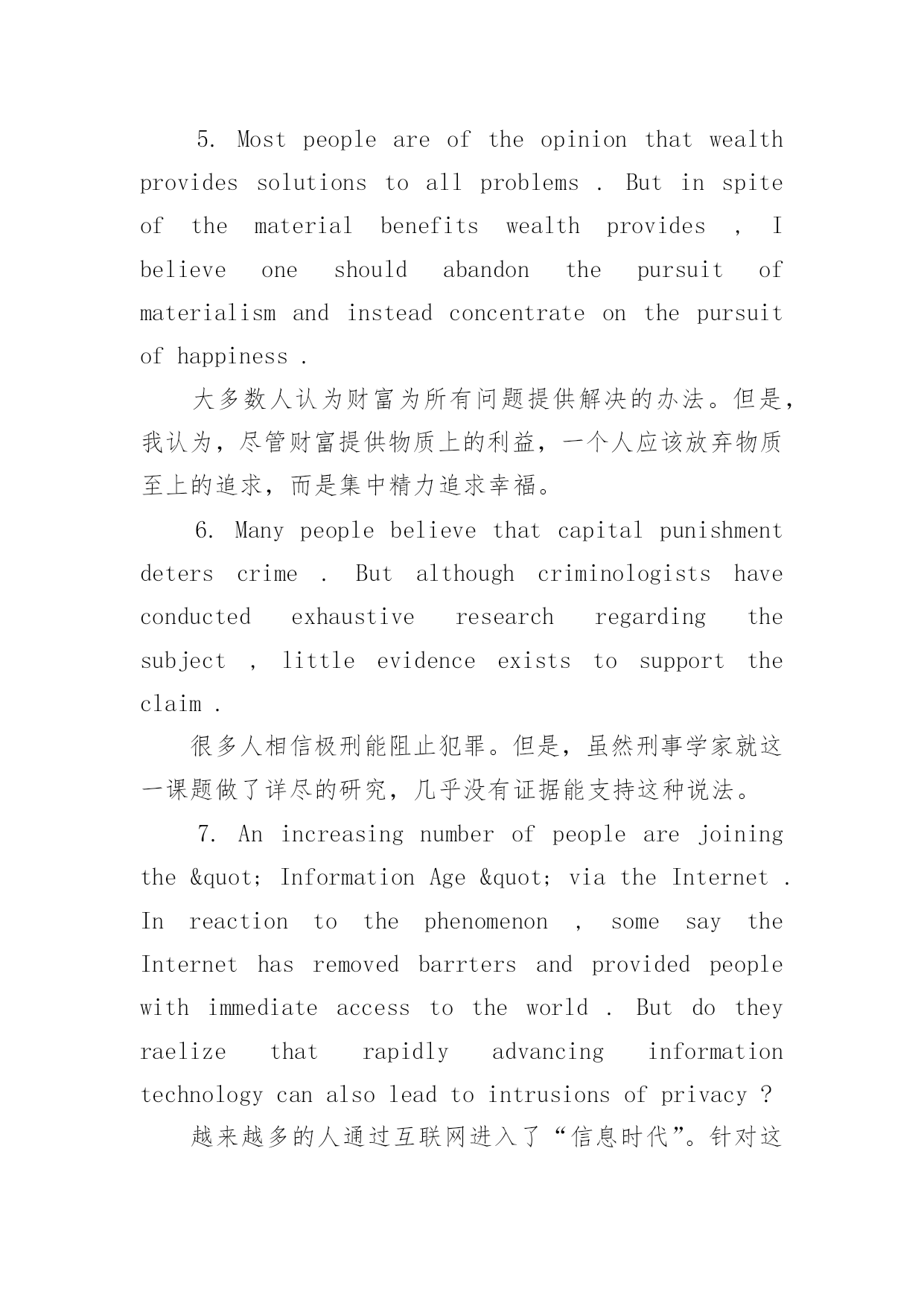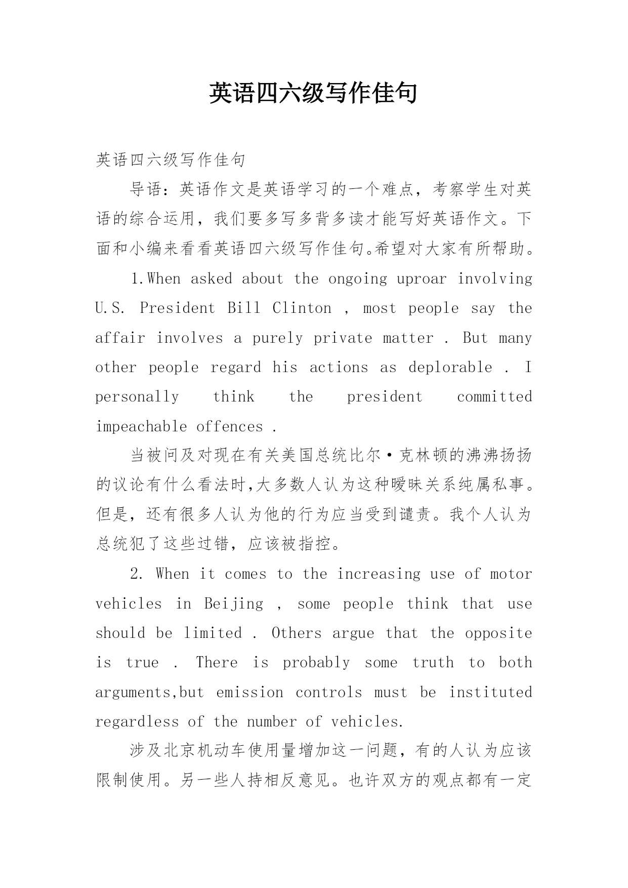 英语四六级写作佳句1.WhenaskedabouttheongoinguproarinvolvingU.S.PresidentBillClinton,mostpeoplesaytheaffairinvolvesapurelyprivatematter.Butmanyotherpeopleregardhisactionsasdeplorable.Ipersonallythinkthepresidentcommittedimpeachableoffences.当被问及对现在有关美国总统比尔·克林顿的沸沸扬扬的