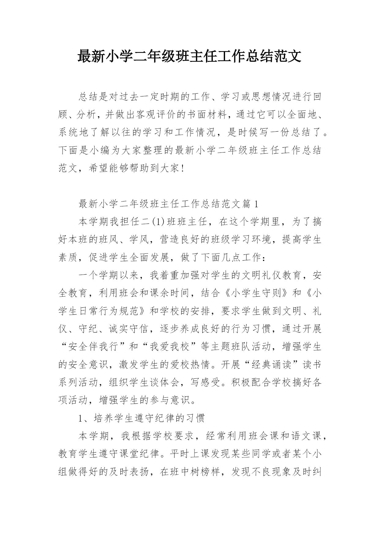最新小学二年级班主任工作总结范文总结是对过去一定时期的工作、学习或思想情况进行回顾、分析,并做出客观评价的书面材料,通过它可以全面地、系统地了解以往的学习和工作情况,是时候写一份总结了。下面是小编为大家整理的最新小学二年级班主任工作总结范文,希望能够帮助到大家!最新小学二年级班主任工作总结范文篇1本学期我担任二(1)班班主任,在这个学期里,为了搞好本班的班风、学风,营造良好的班级学习环境,提高学生素质,促进学生全面发展,做了下面几点工作:一个学期以来,我着重加强对学生的文明礼仪教育,安全教育,利用班会和课