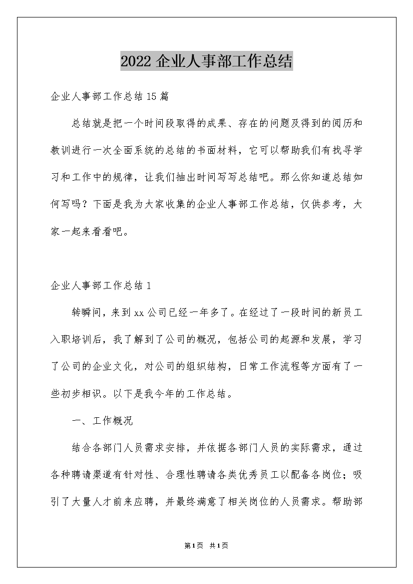 2022企业人事部工作总结企业人事部工作总结15篇总结就是把一个时间段取得的成果、存在的问题及得到的阅历和教训进行一次全面系统的总结的书面材料它可以帮助我们有找寻学习和工作中的规律让我们抽出时间写写总结吧。那么你知道总结如何写