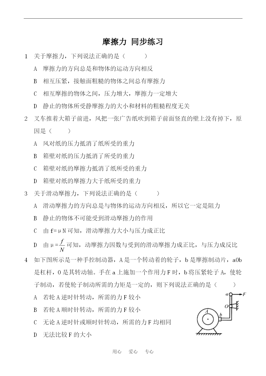用心爱心专心摩擦力同步练习1关于摩擦力,下列说法正确的是()A摩擦力的方向总是和物体的运动方向相反B相互压紧,接触面粗糙的物体之间总有摩擦力C相互摩擦的物体之间,压力增大,摩擦力一定增大D静止的物体所受静摩擦力的大小和材料的粗糙程度无关2叉车推着大箱子前进,风把一张广告纸吹到箱子前面竖直的壁上没有掉下,原因是()A风对纸的压力抵消了纸所受的重力B箱壁对纸的压力抵消了所受的重力C箱壁对纸的摩擦力抵消了纸所受的重力D箱壁对纸的摩擦力大于纸所受的重力3关于滑动摩擦力,下列说法正确的是()A滑动摩擦力的方向总是与
