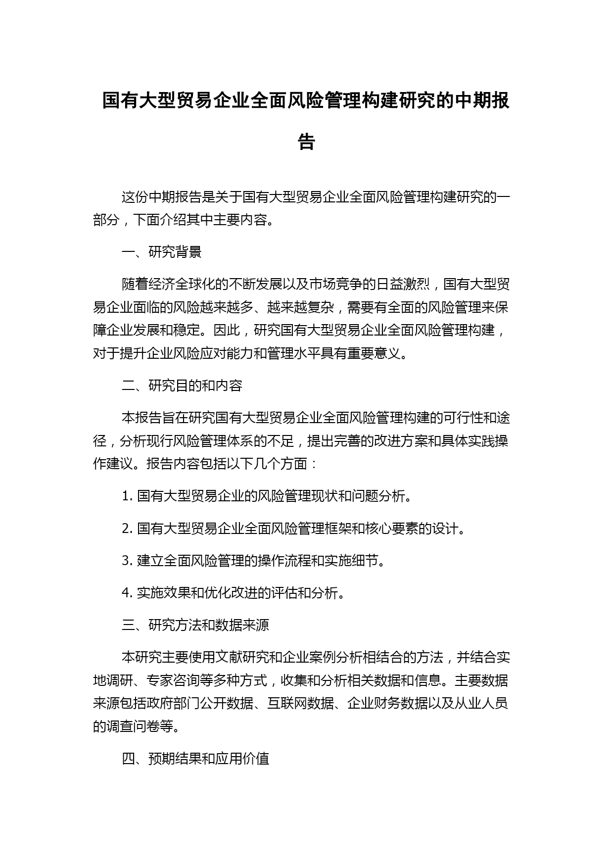 国有大型贸易企业全面风险管理构建研究的中期报告这份中期报告是关于国有大型贸易企业全面风险管理构建研究的一部分,下面介绍其中主要内容。一、研究背景随着经济全球化的不断发展以及市场竞争的日益激烈,国有大型贸易企业面临的风险越来越多、越来越复杂,需要有全面的风险管理来保障企业发展和稳定。因此,研究国有大型贸易企业全面风险管理构建,对于提升企业风险应对能力和管理水平具有重要意义。二、研究目的和内容本报告旨在研究国有大型贸易企业全面风险管理构建的可行性和途径,分析现行风险管理体系的不足,提出完善的改进方案和具体实践