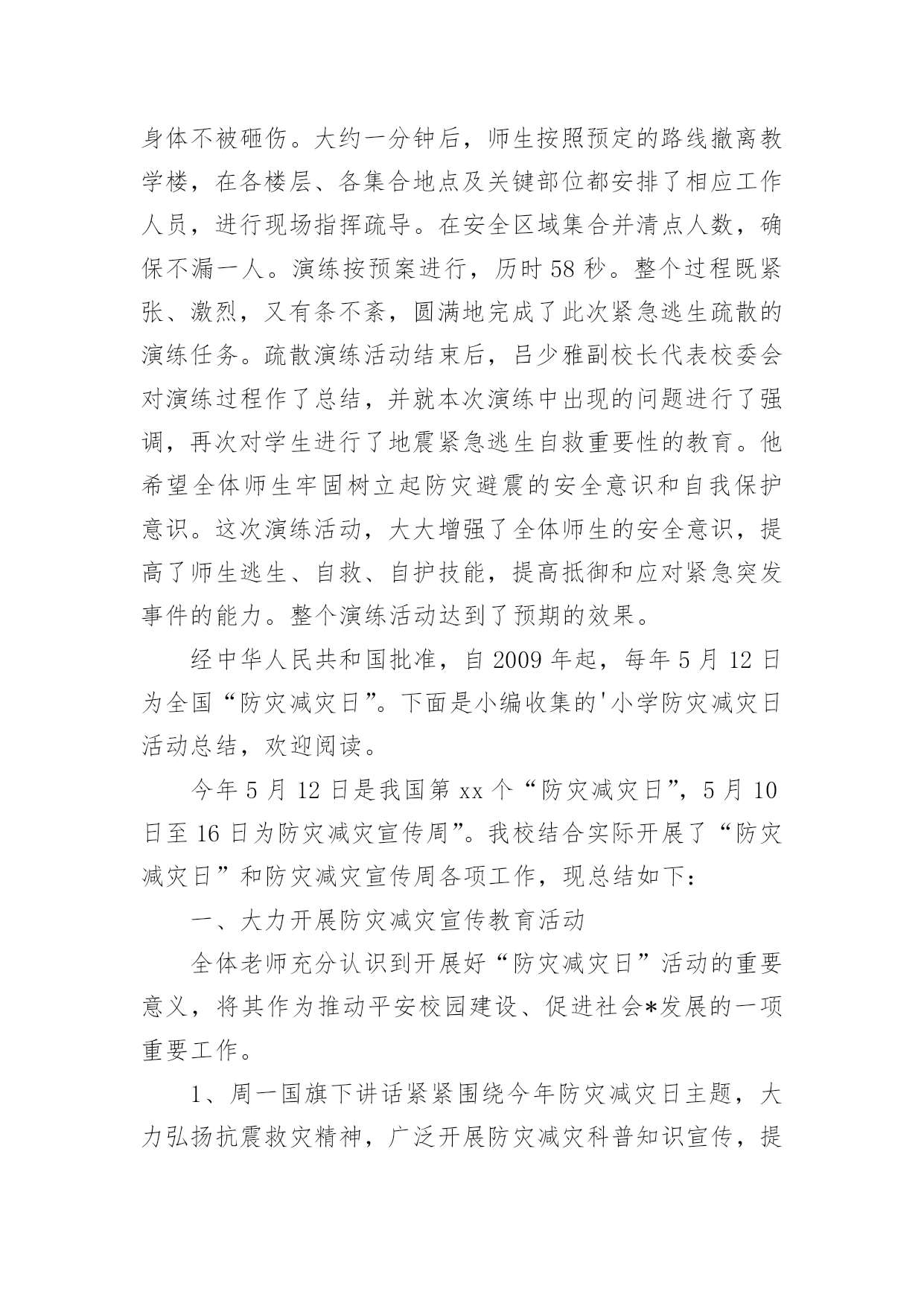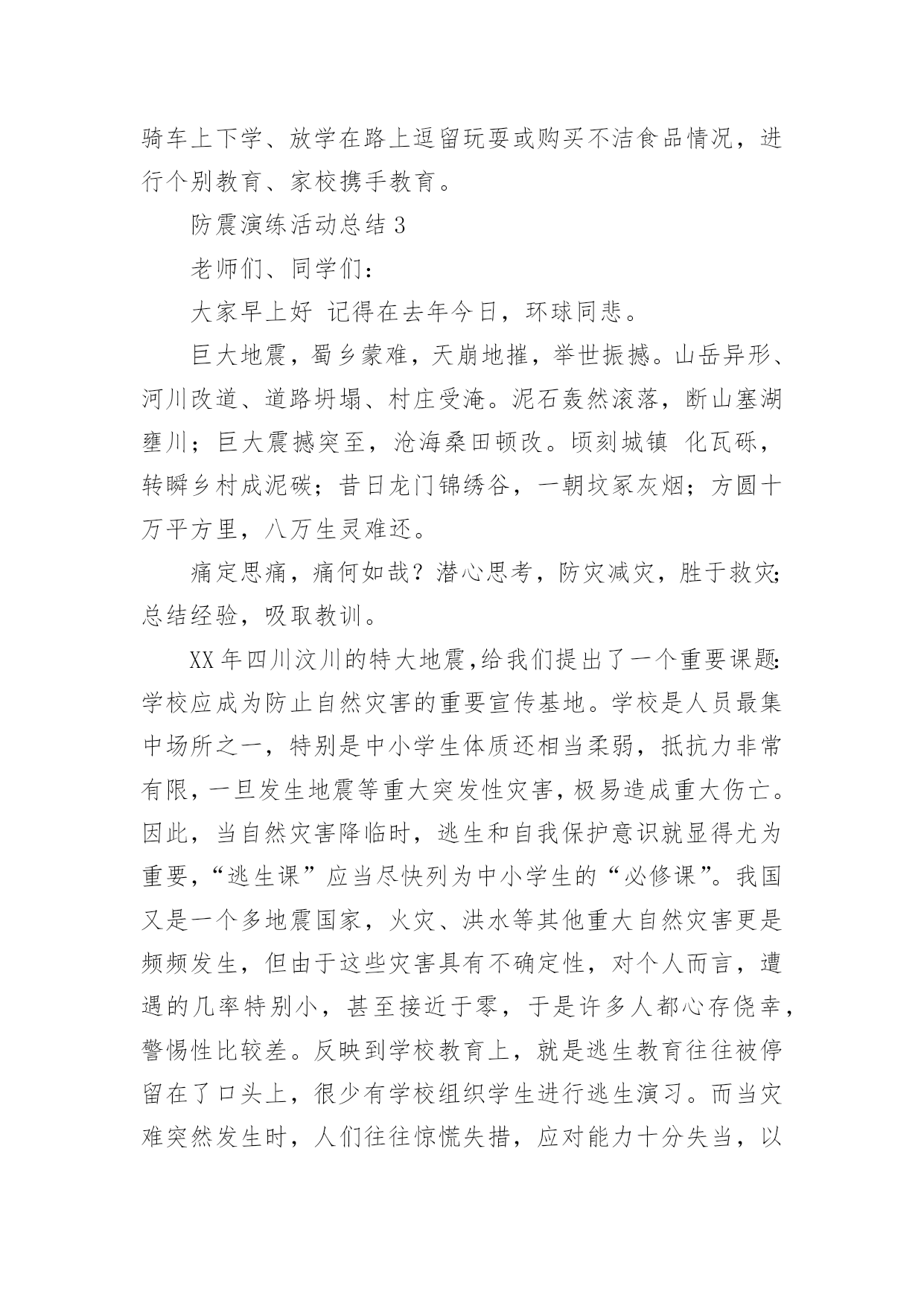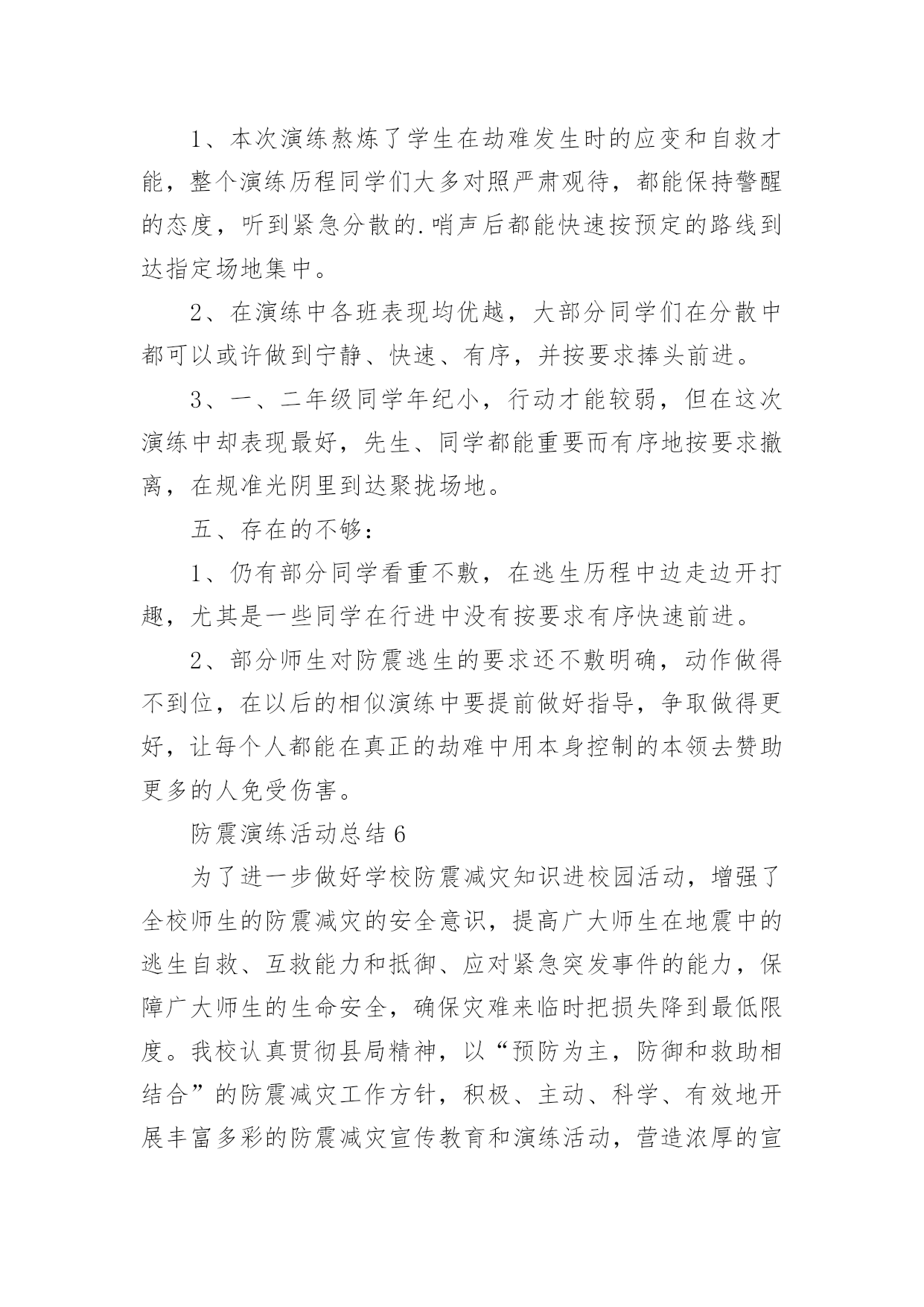 防震演练活动总结防震演练活动总结防震演练活动总结一:20**年汶川特大地震到玉树地震,许多鲜活的生命瞬间被地震无情的吞噬了,次次地震不停地给我们敲响警钟。为了预防突如其来的地震灾害,保证师生安全脱险,把损失降低到最低限度,根据上级主管部门和学校工作安排,定于20**年5月11日组织全校师生进行了一次防震减灾疏散演练。一、领导重视,组织到位。为了确保演练活动落到实处,学校成立了校园防震演练小组,并召开小组会议,部署演练工作。会上,学校领导要求全体成员首先从思想上要引起重视,增强防震安全意识,在学生中进行安全