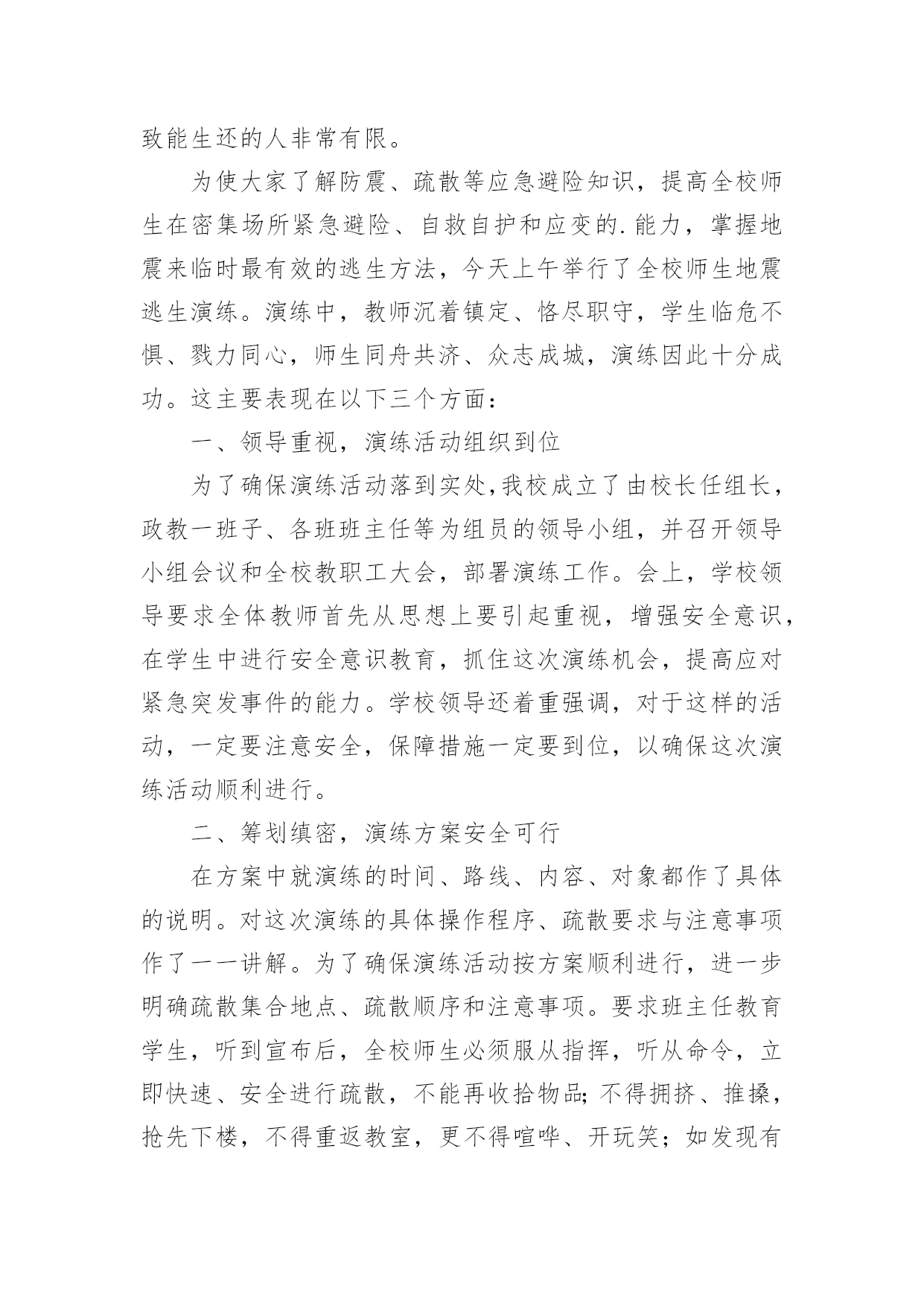 防震演练活动总结防震演练活动总结1安全工作是学校一切工作顺利开展的保证,我校对于学生的安全教育向来十分重视。20xx年10月19日上午课间操,我校进行了防震安全疏散演练。本次演练对学生的应变能力和自救能力进行了考验。一、演练目的:通过地震应急演练,使全校师生掌握应急避震的正确方法,熟悉震后我校紧急疏散的程序和线路,确保在地震来临时,我校地震应急工作能快速、高效、有序地进行,从而最大限度地保护全校师生的生命安全,特别是减少不必要的非震伤害。同时通过演练活动培养学生听从指挥、团结互助的品德,提高突发公共事件下