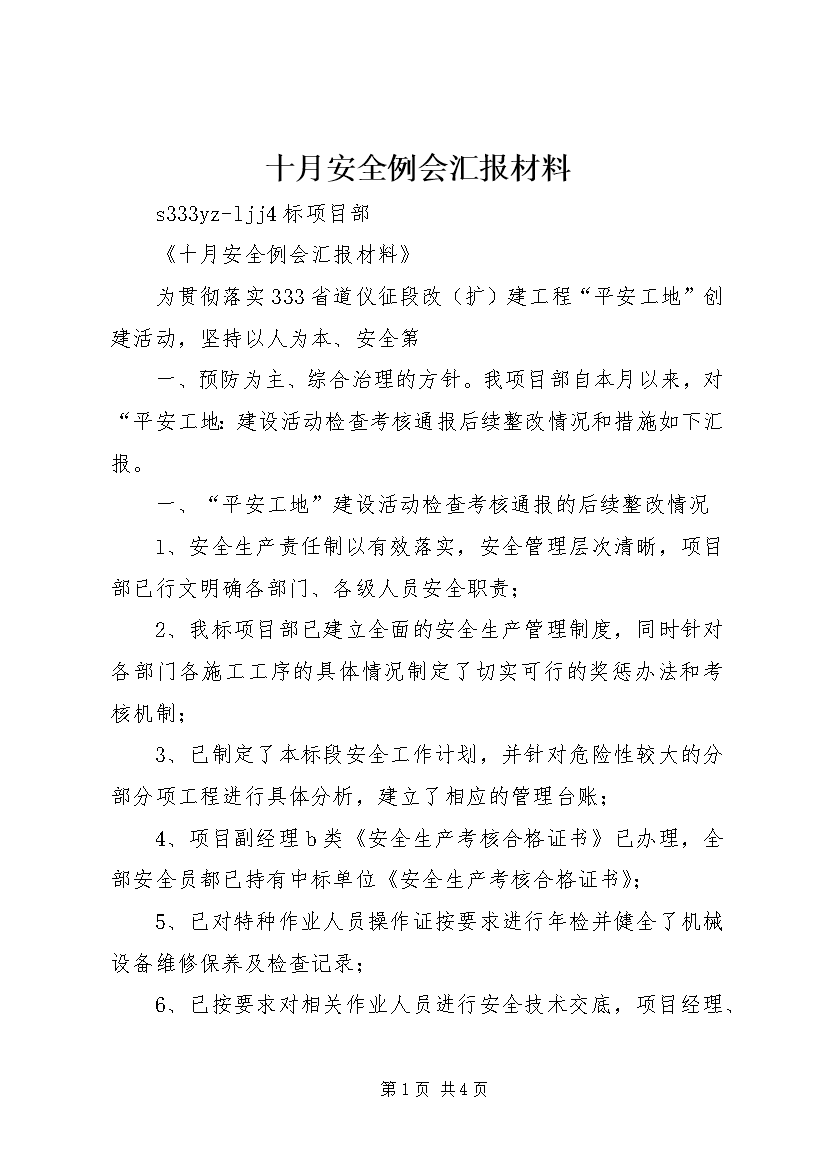 第PAGE\*Arabic\*MERGEFORMAT4页共NUMPAGES\*MERGEFORMAT4页十月安全例会汇报材料s333yz-ljj4标项目部《十月安全例会汇报材料》为贯彻落实333省道仪征段改(扩)建工程“平安工地”创建活动,坚持以人为本、安全第一、预防为主、综合治理的方针。我项目部自本月以来,对“平安工地:建设活动检查考核通报后续整改情况和措施如下汇报。一、“平安工地”建设活动检查考核通报的后续整改情况1、安全生产责任制以有效落实,安全管理层次清晰,项目部已行文明确各部门、各级