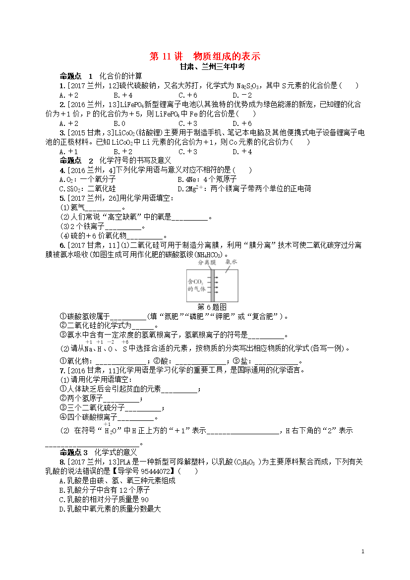 1第11讲物质组成的表示甘肃、兰州三年中考命题点1化合价的计算1.[2017兰州,12]硫代硫酸钠,又名大苏打,化学式为Na2S2O3,其中S元素的化合价是()A.+2B.+4C.+6D.-22.[2016兰州,13]LiFePO4新型锂离子电池以其独特的优势成为绿色能源的新宠,已知锂的化合价为+1价,P的化合价为+5,则LiFePO4中Fe的化合价是()A.+2B.0C.+3D.+63.[2015甘肃,3]LiCoO2(钴酸锂)主要用于制造手机、笔记本电脑及其他便携式电子设