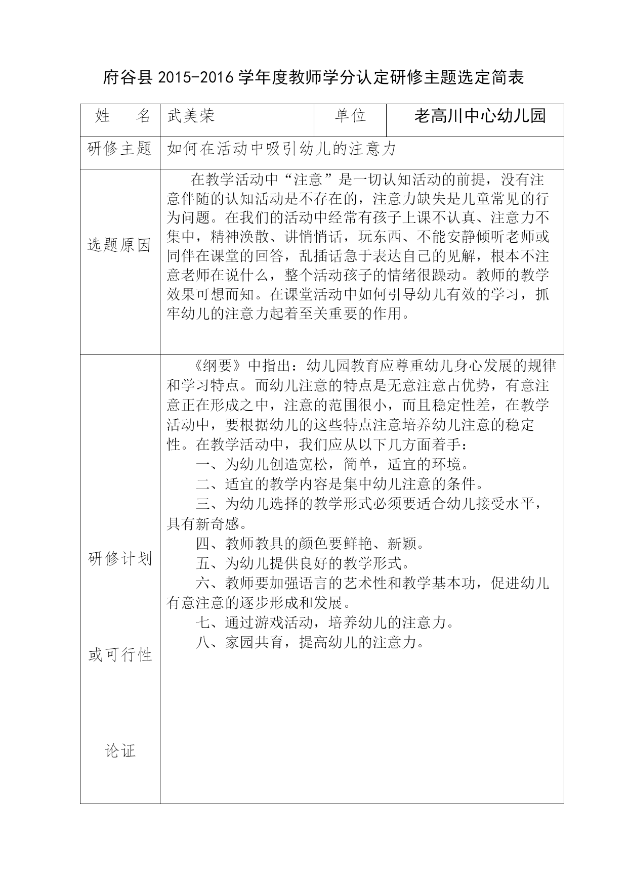府谷县2015-2016学年度教师学分认定研修主题选定简表姓名武美荣单位老高川中心幼儿园研修主题如何在活动中吸引幼儿的注意力选题原因在教学活动中“注意”是一切认知活动的前提,没有注意伴随的认知活动是不存在的,注意力缺失是儿童常见的行为问题。在我们的活动中经常有孩子上课不认真、注意力不集中,精神涣散、讲悄悄话,玩东西、不能安静倾听老师或同伴在课堂的回答,乱插话急于表达自己的见解,根本不注意老师在说什么,整个活动孩子的情绪很躁动。教师的教学效果可想而知。在课堂活动中如何引导幼儿有效的学习,抓牢幼儿的注意力起着