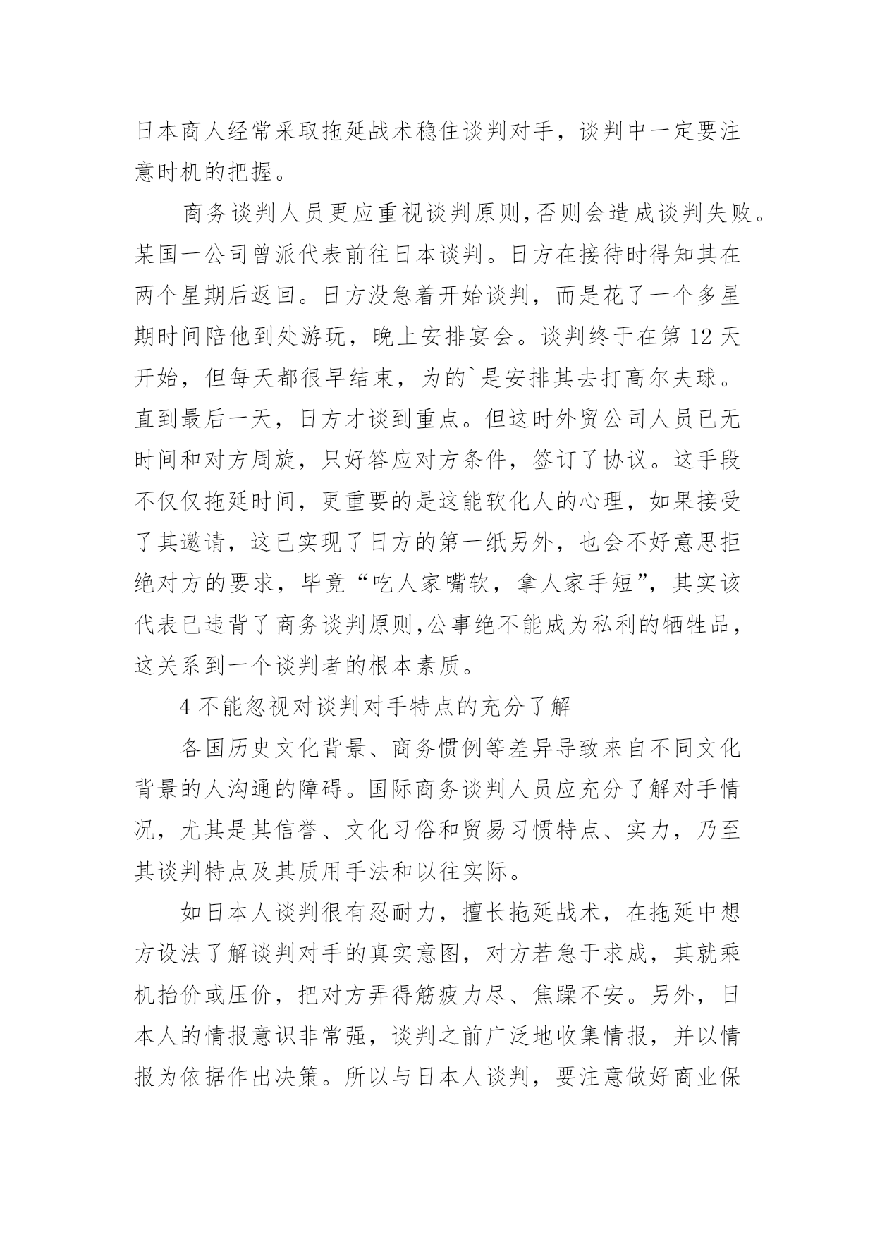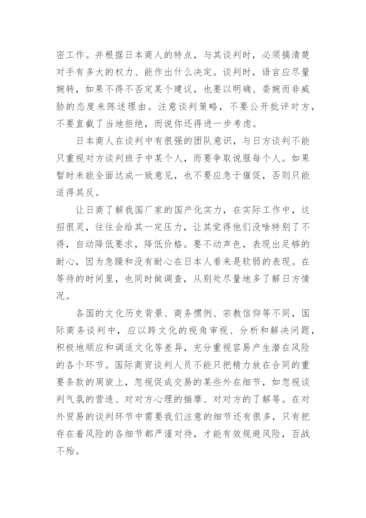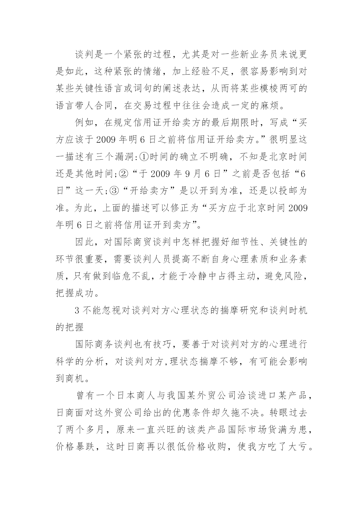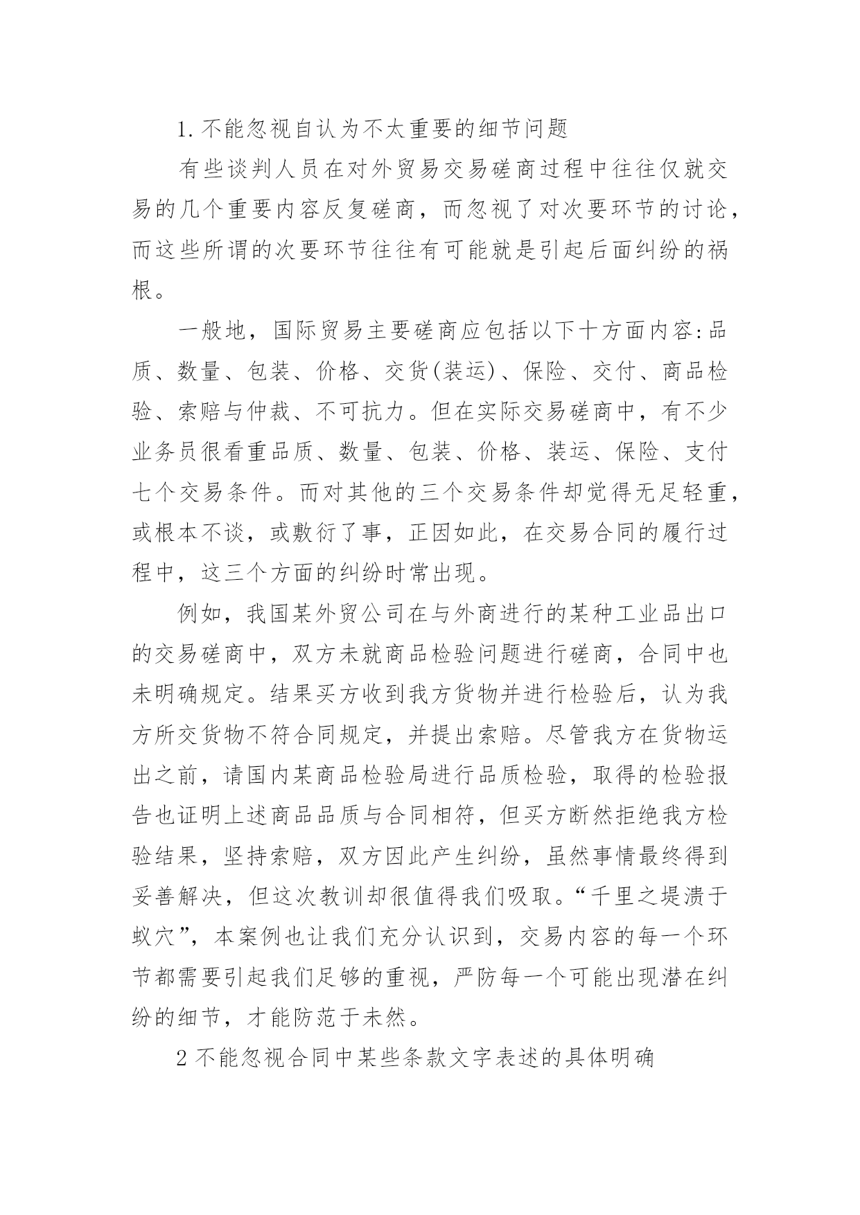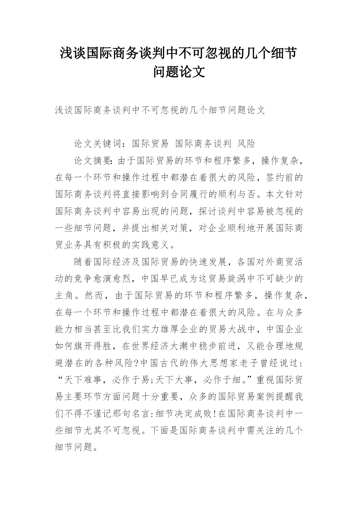 浅谈国际商务谈判中不可忽视的几个细节问题论文浅谈国际商务谈判中不可忽视的几个细节问题论文论文关键词:国际贸易国际商务谈判风险论文摘要:由于国际贸易的环节和程序繁多,操作复杂,在每一个环节和操作过程中都潜在着很大的风险,签约前的国际商务谈判将直接影响到合同履行的顺利与否。本文针对国际商务谈判中容易出现的问题,探讨谈判中容易被忽视的一些细节问题,并提出相关对策,对企业顺利地开展国际商贸业务具有积极的实践意义。随着国际经济及国际贸易的快速发展,各国对外商贸活动的竞争愈演愈烈,中国早已成为这贸易旋涡中不可缺少的主