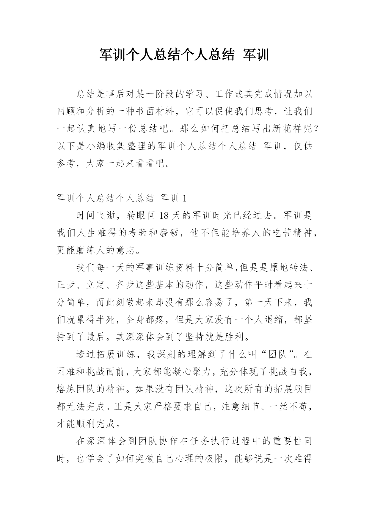 军训个人总结个人总结军训军训个人总结个人总结军训1时间飞逝,转眼间18天的军训时光已经过去。军训是我们人生难得的考验和磨砺,他不但能培养人的吃苦精神,更能磨练人的意志。我们每一天的军事训练资料十分简单,但是是原地转法、正步、立定、齐步这些基本的动作,这些动作平时看起来十分简单,而此刻做起来却没有那么容易了,第一天下来,我们就累得半死,全身都疼,但是大家没有一个人退缩,都坚持到了最后。其深深体会到了坚持就是胜利。透过拓展训练,我深刻的理解到了什么叫“团队”。在困难和挑战面前,大家都能凝心聚力,充分体现了挑战