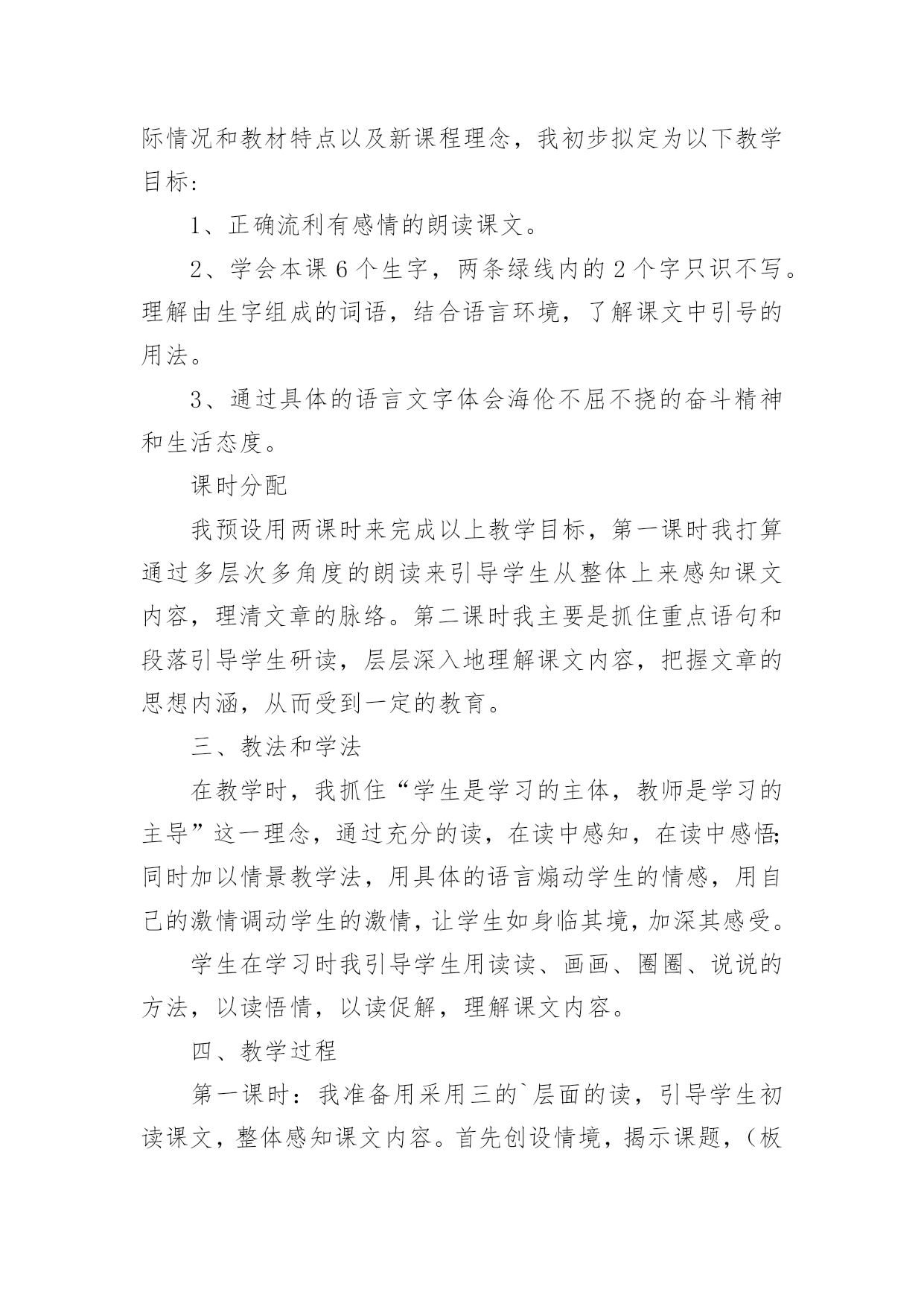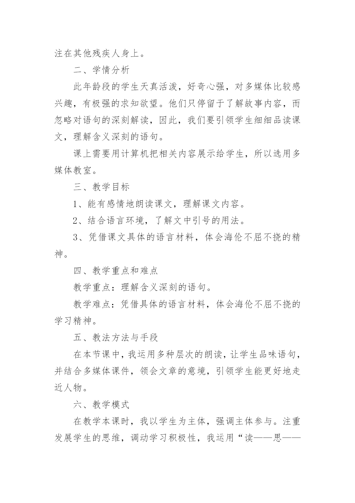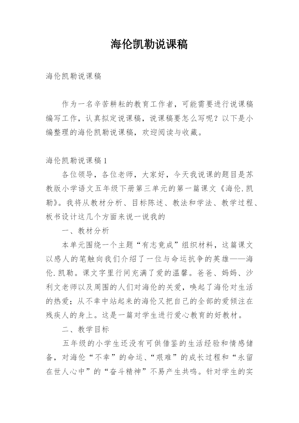 海伦凯勒说课稿海伦凯勒说课稿作为一名辛苦耕耘的教育工作者,可能需要进行说课稿编写工作,认真拟定说课稿,说课稿要怎么写呢?以下是小编整理的海伦凯勒说课稿,欢迎阅读与收藏。海伦凯勒说课稿1各位领导,各位老师,大家好,今天我说课的题目是苏教版小学语文五年级下册第三单元的第一篇课文《海伦.凯勒》。我将从教材分析、目标陈述、教法和学法、教学过程、板书设计这几个方面来说一说我的一、教材分析本单元围绕一个主题“有志竟成”组织材料,这篇课文以感人的笔触向我们介绍了一位与命运抗争的英雄——海伦.凯勒。课文字里行间充满了爱的