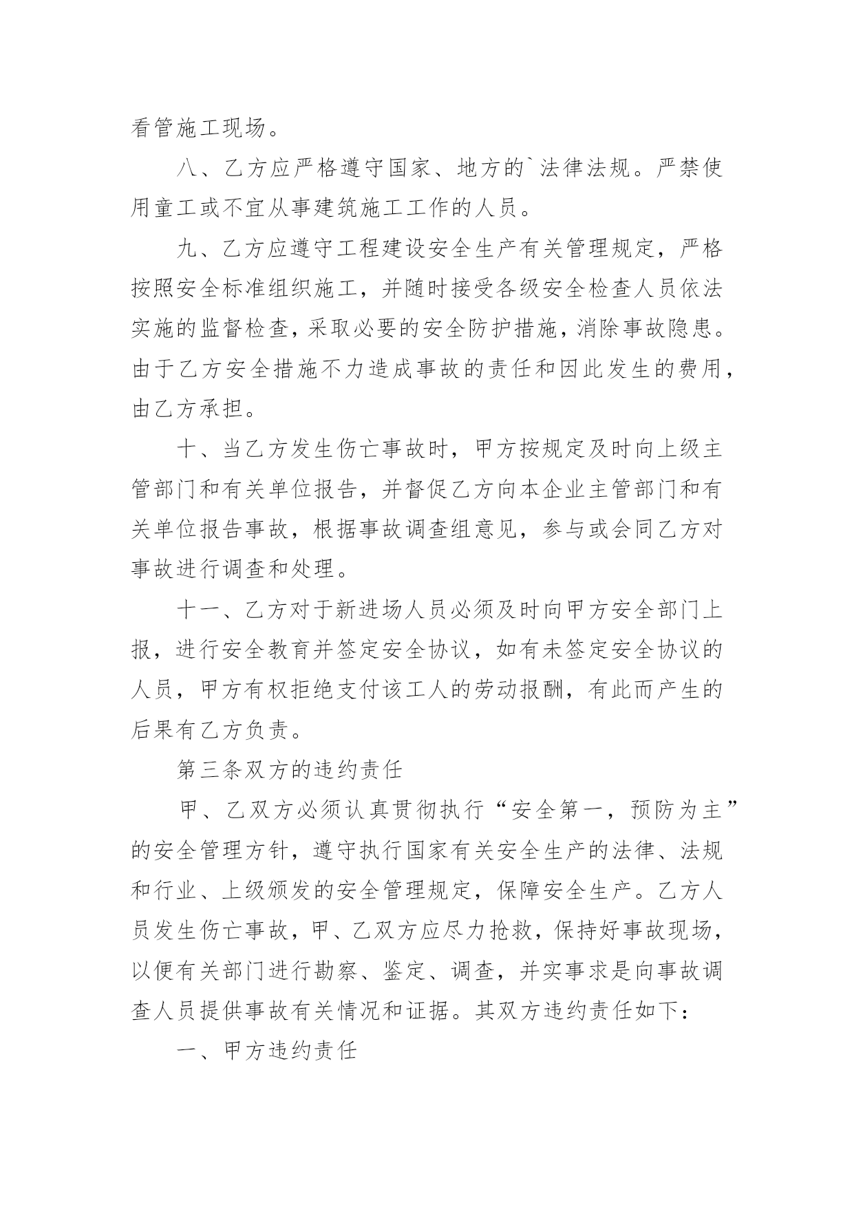 施工协议书施工协议书在当下社会,各种协议频频出现,签订协议能够保证双方合作愉快。大家知道协议的格式吗?以下是小编为大家收集的施工协议书,欢迎阅读,希望大家能够喜欢。施工协议书1甲方:乙方:为了强化施工现场安全管理,保护施工人员的人身安全、健康和国家财产,保障施工生产的顺利进行,依据《中华人民共和国劳动法》、《中华人民共和国建筑法》和市建委关于建筑工程的有关规定,双方就鲁台经贸中心--会展中心工程施工安全生产达成如下协议:一、双方责任:1、乙方在安全生产和文明施工中必须严格执行国家及行业有关操作规程和甲方的