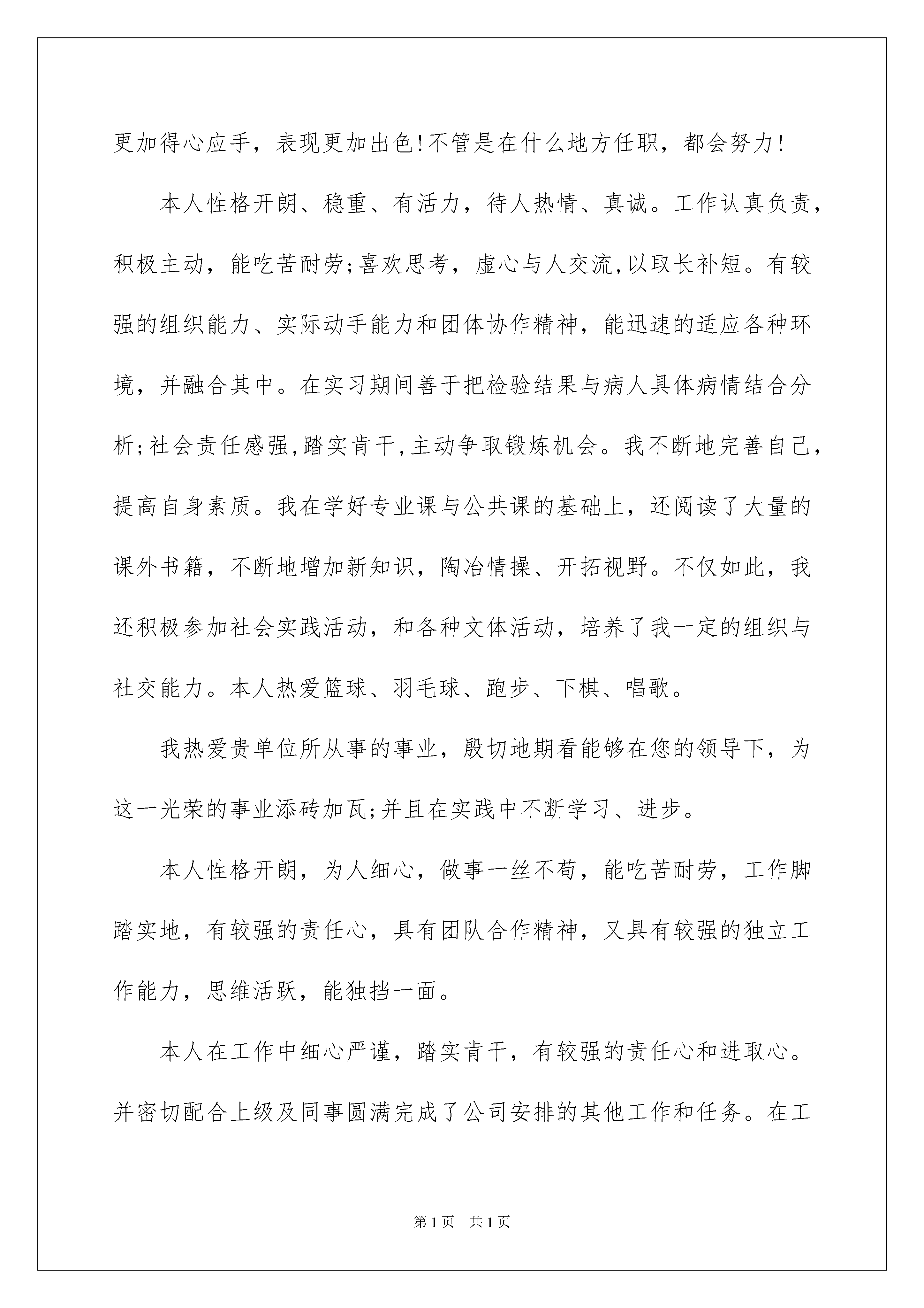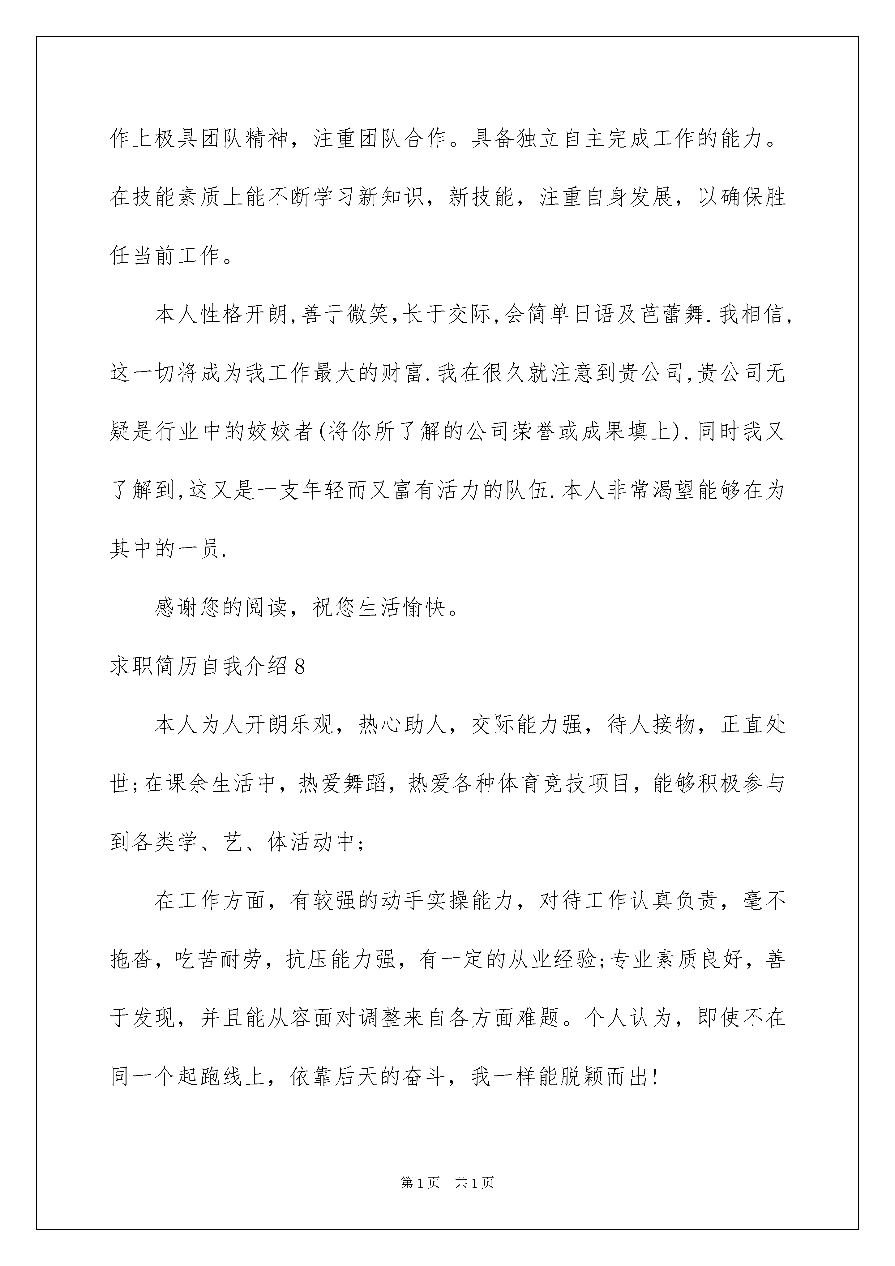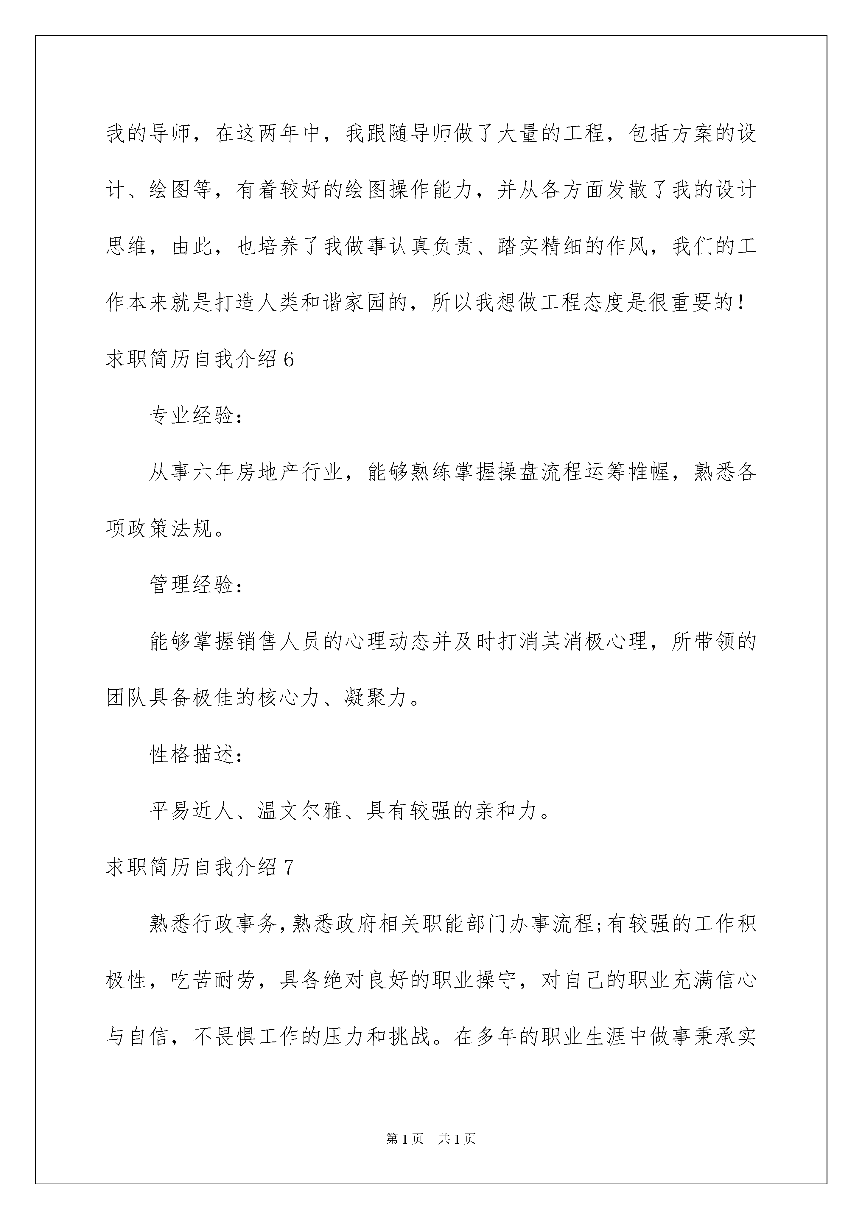 此资料由网络收集而来,如有侵权请告知上传者立即删除。资料共分享,我们负责传递知识。求职简历自我介绍求职简历自我介绍范文大全自我介绍需要自信、利索、有强烈的付出心态。每个人可根据自己不同的想法来介绍自己,以下是小编搜集整理的求职简历自我介绍范文,欢迎阅读。求职简历自我介绍范文11、阳光开朗积极向上做事认真负责。2、学习能力,沟通能力,组织能力良好。3、以谨慎的工作作风,认真积极的工作态度,细心完成本职工作。本人工作踏实,刻苦耐劳,如有幸被录用我将会竭尽全力为贵单位创造效益,以尽