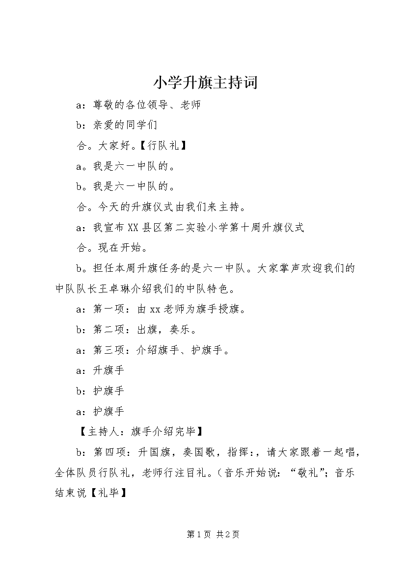 小学升旗主持词a:尊敬的各位领导、老师b:亲爱的同学们合。大家好。【行队礼】a。我是六一中队的。b。我是六一中队的。合。今天的升旗仪式由我们来主持。a:我宣布XX县区第二实验小学第十周升旗仪式合。现在开始。b。担任本周升旗任务的是六一中队。大家掌声欢迎我们的中队队长王卓琳介绍我们的中队特色。a:第一项:由xx老师为旗手授旗。b:第二项:出旗奏乐。a:第三项:介绍旗手、护旗手。