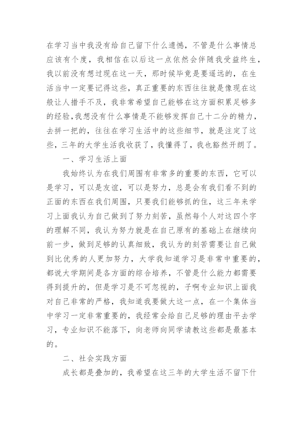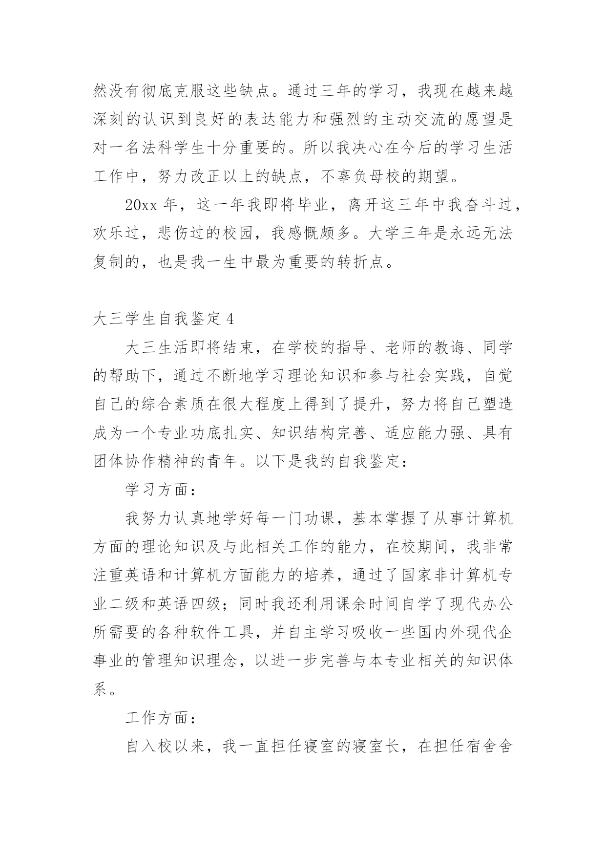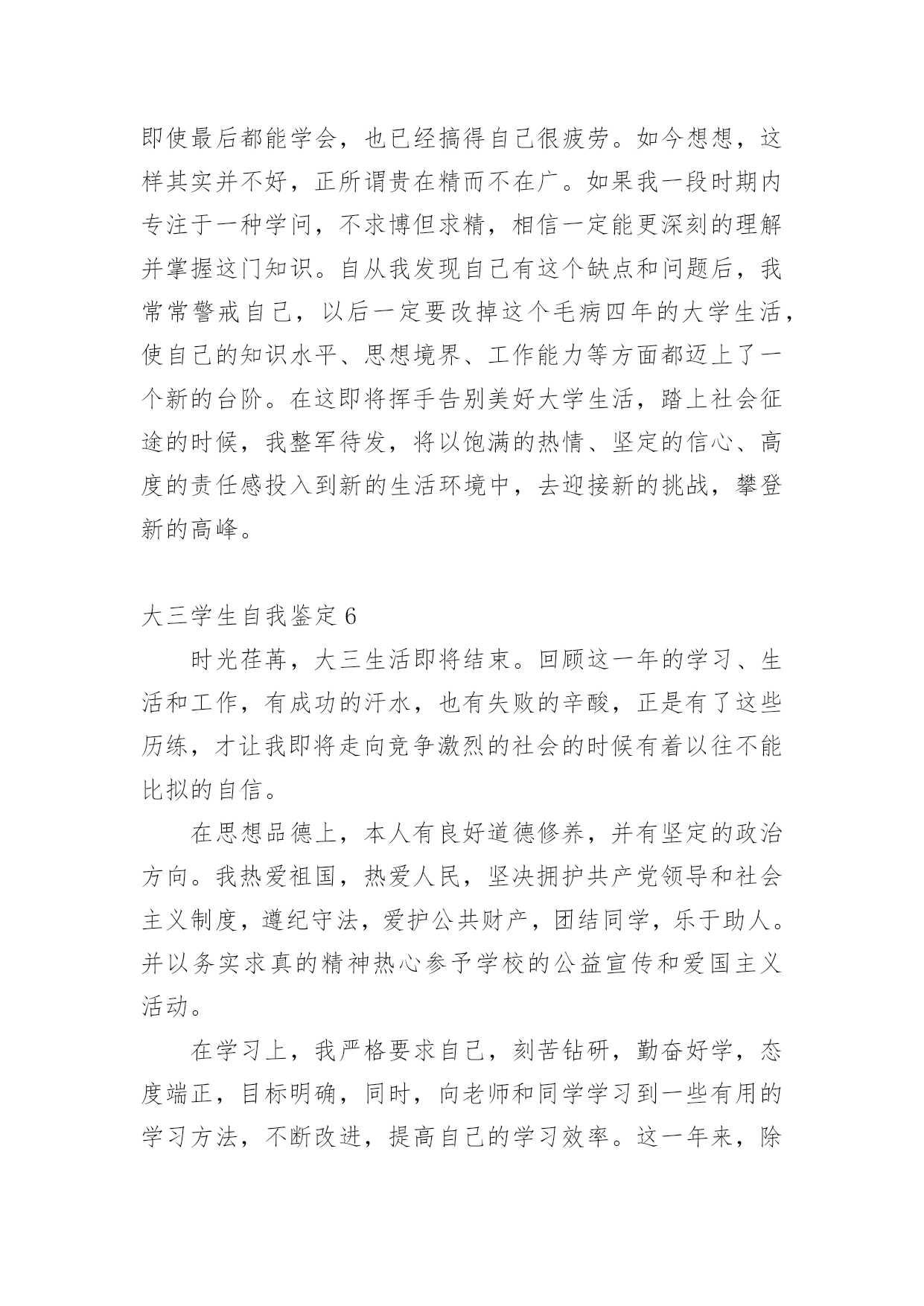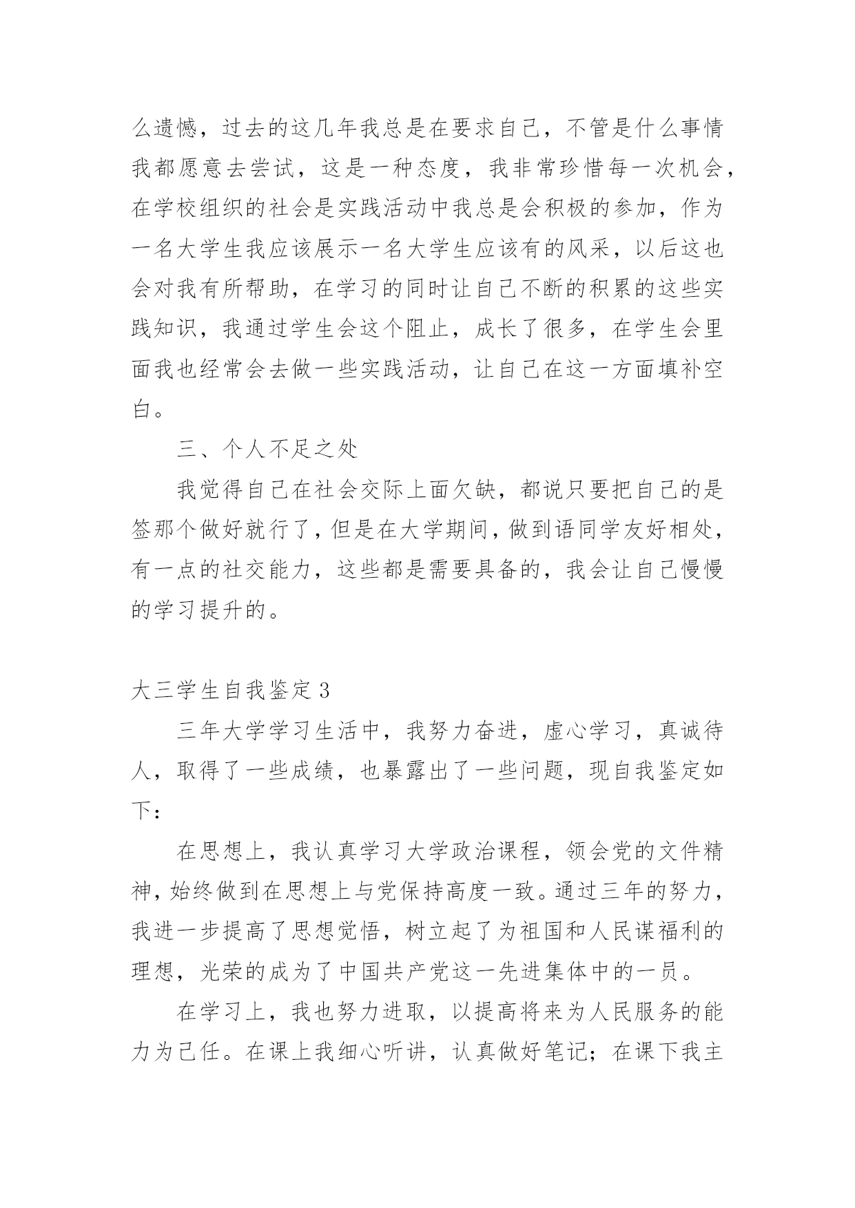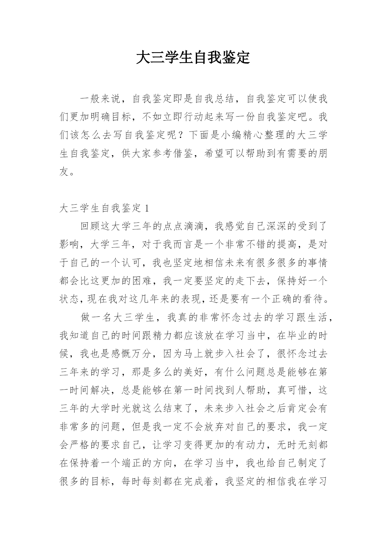 大三学生自我鉴定【荐】大三学生自我鉴定自我鉴定是一个人对某一特定时间段内的学习和工作生活等表现的自我总结,它可以帮助我们有寻找学习和工作中的规律,不如立即行动起来写一份自我鉴定吧。那么自我鉴定有什么格式呢?下面是小编为大家整理的大三学生自我鉴定,仅供参考,大家一起来看看吧。大三学生自我鉴定1一、在学校的生活中我勤奋坚强,坚持诚实。我对专业课的学习需要多练,不能空想,我比以前增加了动手的能力。我在学习、工作、和生活上遇到许多挫折,面对着这些,我选择了勇敢去面对,而不是退缩。我在学校结交了很多朋友,交友的首要