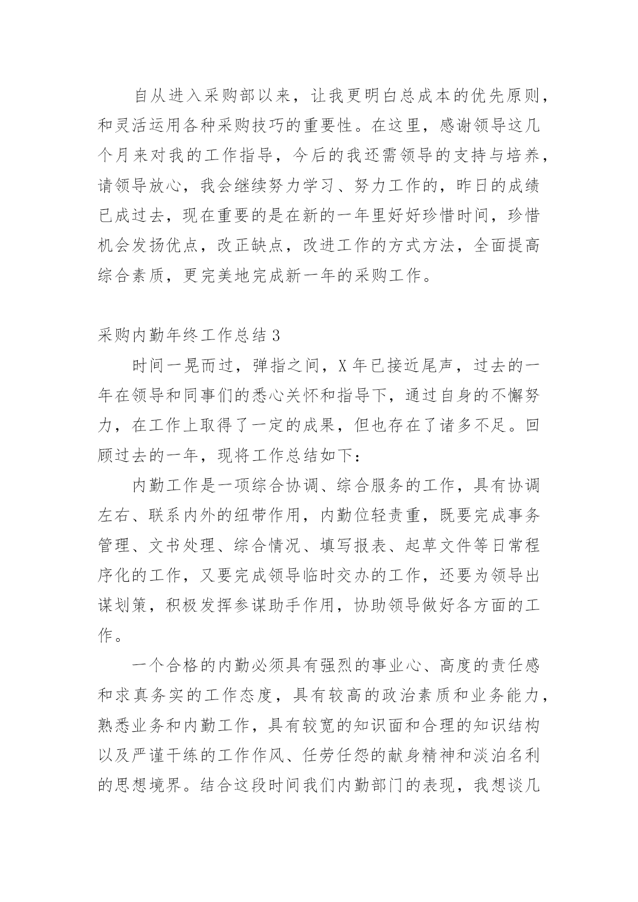 采购内勤年终工作总结采购内勤年终工作总结10篇总结是在一段时间内对学习和工作生活等表现加以总结和概括的一种书面材料,它有助于我们寻找工作和事物发展的规律,从而掌握并运用这些规律,让我们一起认真地写一份总结吧。如何把总结做到重点突出呢?以下是小编整理的采购内勤年终工作总结,欢迎阅读,希望大家能够喜欢。采购内勤年终工作总结1时间过得真快,加入XX工作已经一年了。非常荣幸和庆幸自己能够成为xX的一员,要感谢的是领导对我的信任和工作上给予的肯定,同时也离不开各位同事在我工作上的帮助和支持。给了我一个发现自我、认识