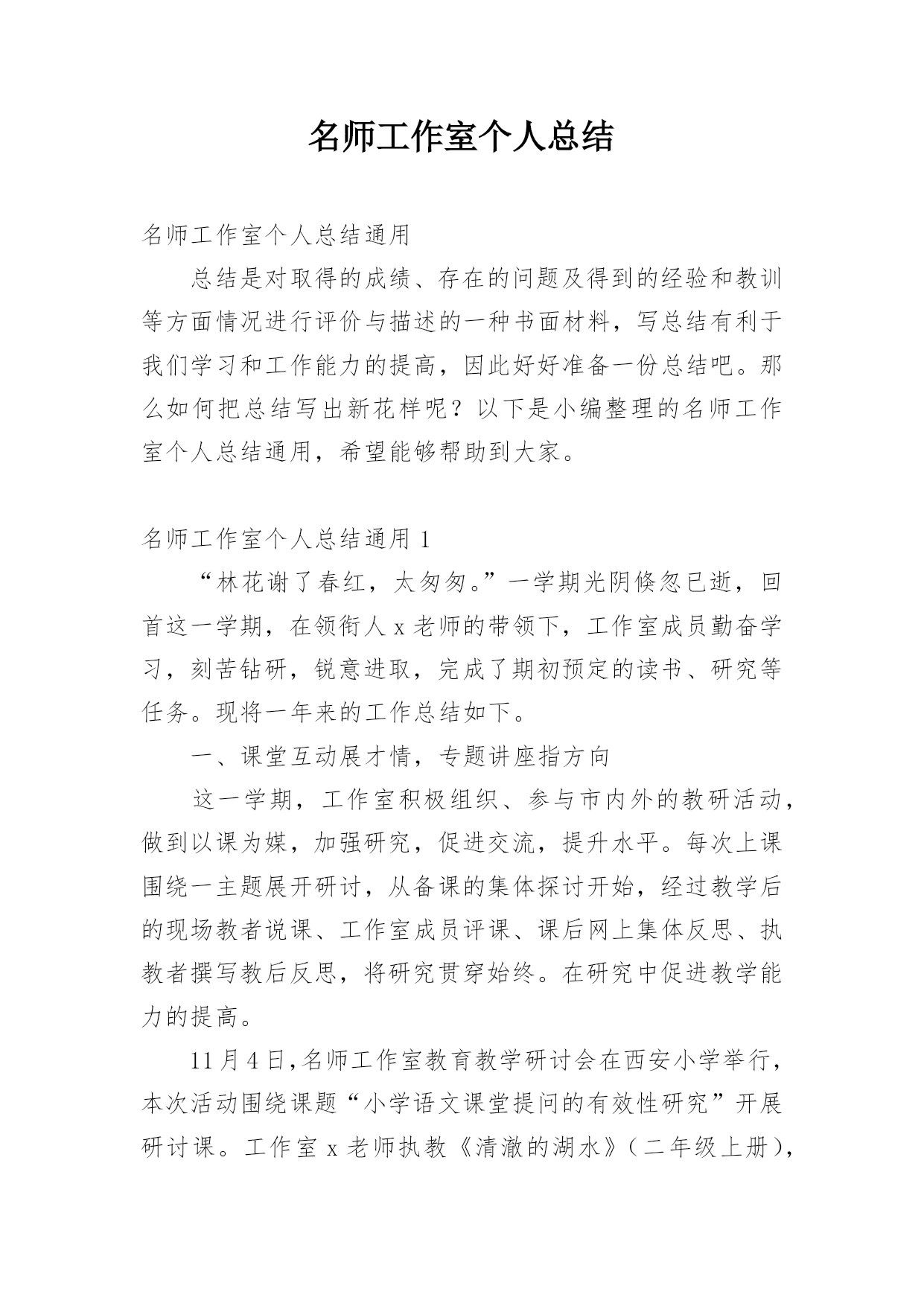 名师工作室个人总结名师工作室个人总结通用总结是对取得的成绩、存在的问题及得到的经验和教训等方面情况进行评价与描述的一种书面材料,写总结有利于我们学习和工作能力的提高,因此好好准备一份总结吧。那么如何把总结写出新花样呢?以下是小编整理的名师工作室个人总结通用,希望能够帮助到大家。名师工作室个人总结通用1“林花谢了春红,太匆匆。”一学期光阴倏忽已逝,回首这一学期,在领衔人x老师的带领下,工作室成员勤奋学习,刻苦钻研,锐意进取,完成了期初预定的读书、研究等任务。现将一年来的工作总结如下。一、课堂互动展才情,专题
