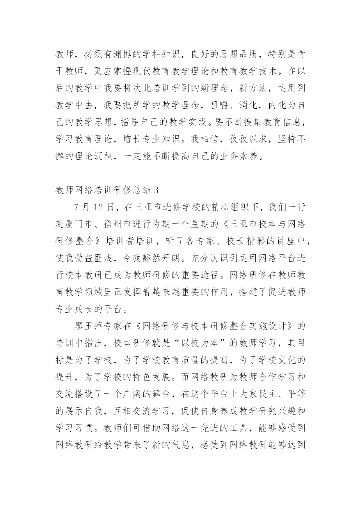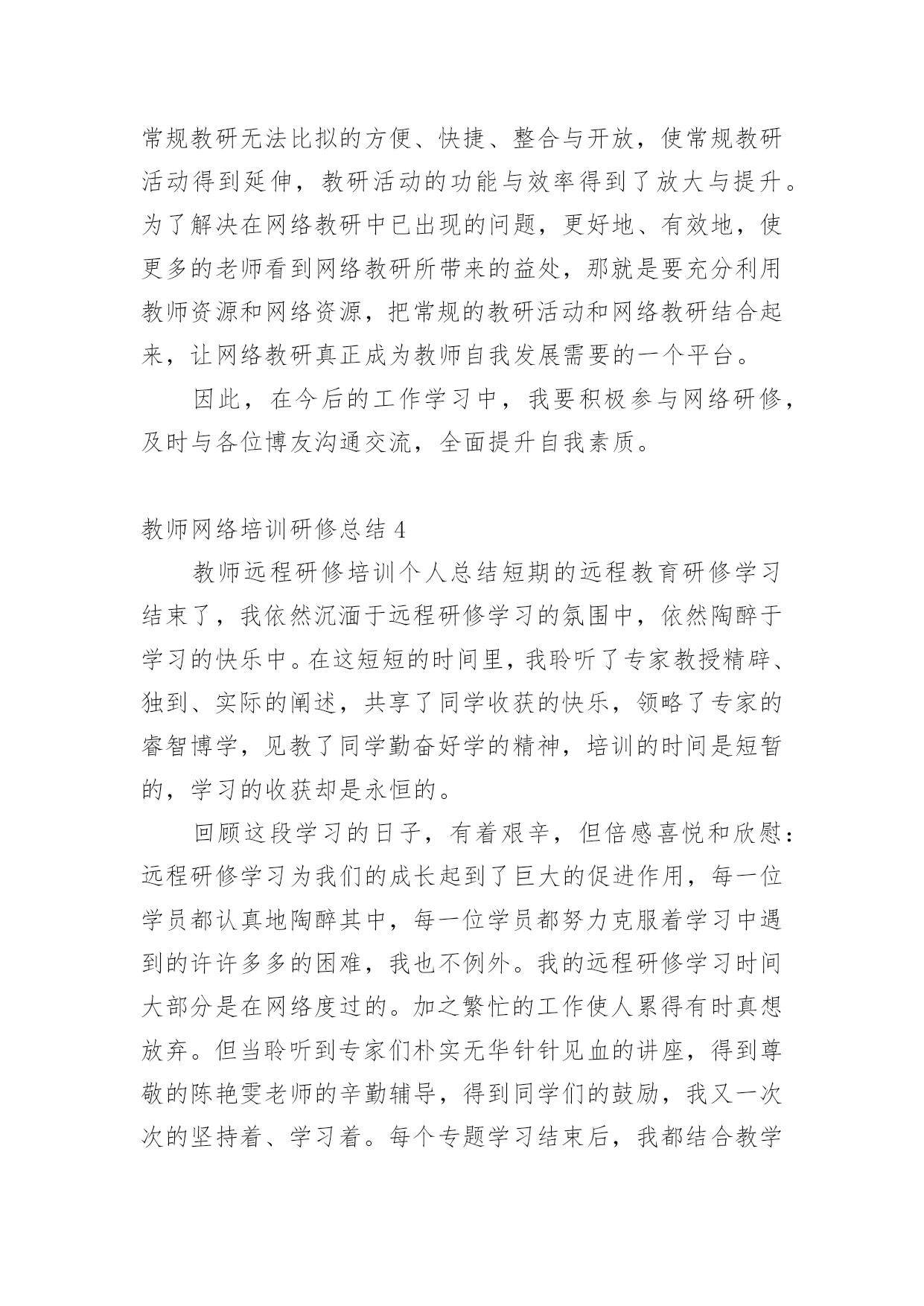 教师网络研修培训总结2021教师网络研修培训总结总结就是把一个时间段取得的成绩、存在的问题及得到的经验和教训进行一次全面系统的总结的书面材料,它能帮我们理顺知识结构,突出重点,突破难点,不妨让我们认真地完成总结吧。那么总结应该包括什么内容呢?下面是小编帮大家整理的2021教师网络研修培训总结,仅供参考,欢迎大家阅读。教师网络研修培训总结1通过这段时间的学习,收益颇多自参加远程研修以来,作为研修学员的我通过认真收看视频教学、撰写学习心得体会、参加班级交流和互评,从中学到了专家和同行们的很多值得我参考和借鉴的