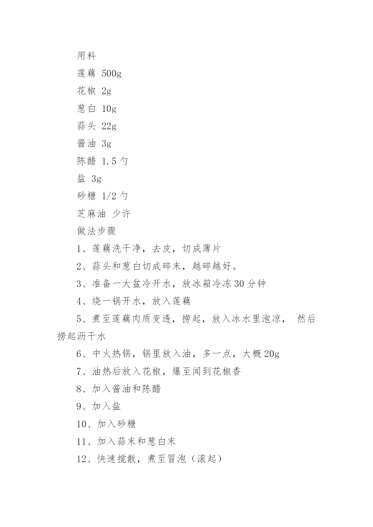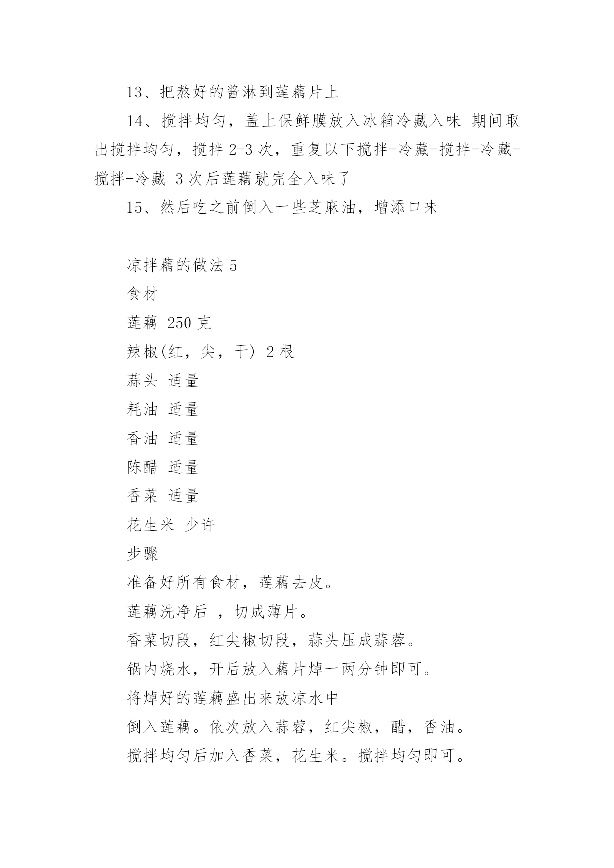 凉拌藕的做法凉拌藕是常见的家常菜,特点是清脆爽口,味酸甜。那么这道菜具体是怎么做出来的呢?请阅读以下文章,跟着小编一起来了解。凉拌藕的做法1用料主料藕一段彩椒半个尖椒1个辅料盐适量香油几滴黑芝麻1勺桂花香醋适量辣椒油1勺糖1勺蒜4瓣凉拌藕片的做法1.藕去皮切片,用清水泡去少量淀粉。2.备料3.将藕片焯水,1-2分钟。根据切的藕片的`厚度4.焯好的藕片用凉水冲净,控水。5.所有东东放在一起拌匀即可营养价值藕生食能清热润肺,凉血行瘀;熟吃可健脾开胃,止泻固精。老年人常吃藕,可以调中开胃,益血补髓,安神健脑,具