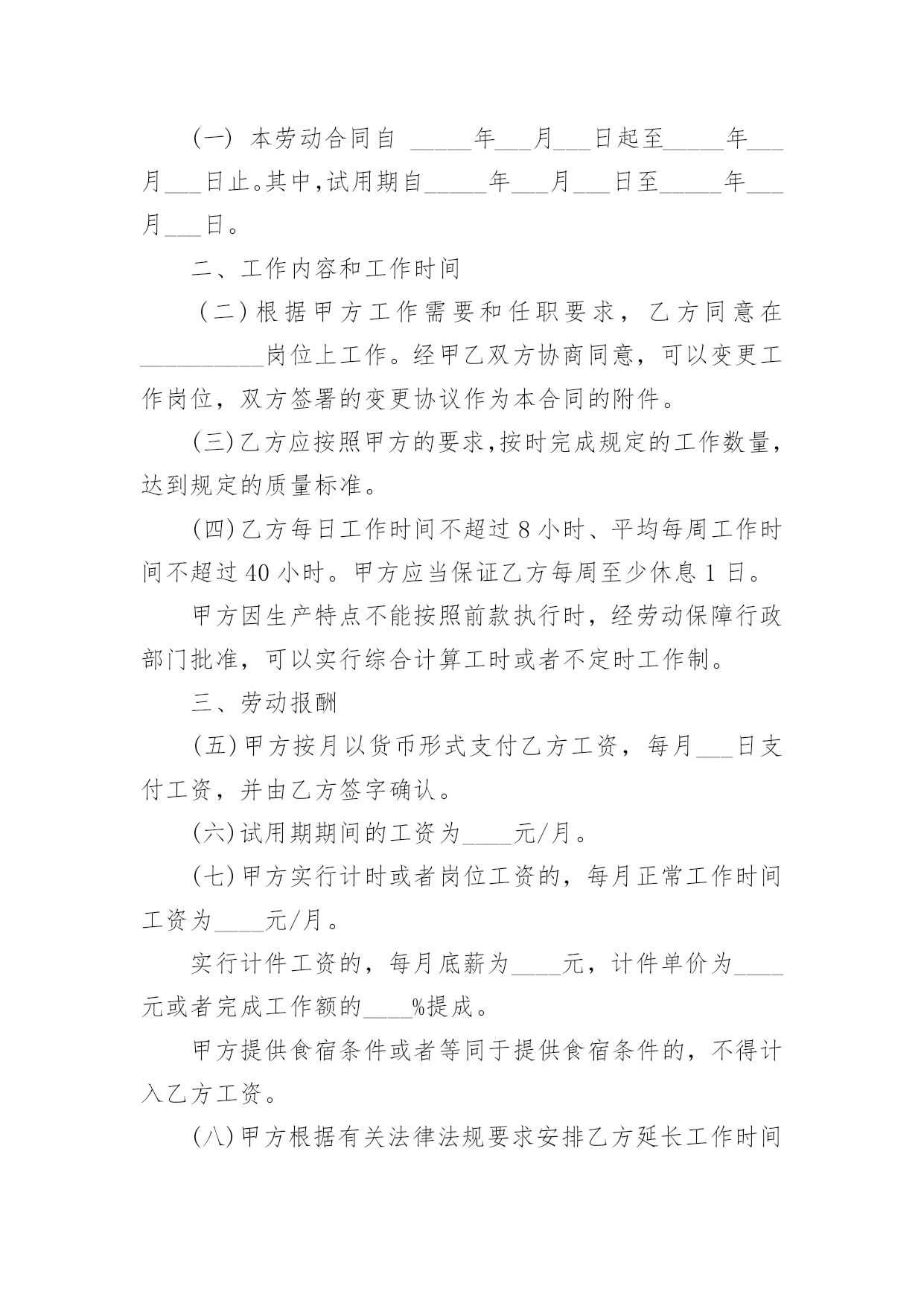 服务员劳动合同服务员劳动合同合集15篇在人民愈发重视法律的社会中,很多场合都离不了合同,签订合同可以明确双方当事人的权利和义务。拟定合同的注意事项有许多,你确定会写吗?下面是小编精心整理的服务员劳动合同,欢迎阅读,希望大家能够喜欢。服务员劳动合同1甲方:_______________________________乙方:_______________________________经甲、乙双方协商同意,自愿签订本合同。一、合同期限:合同期限为______年,______年______月______日起至_
