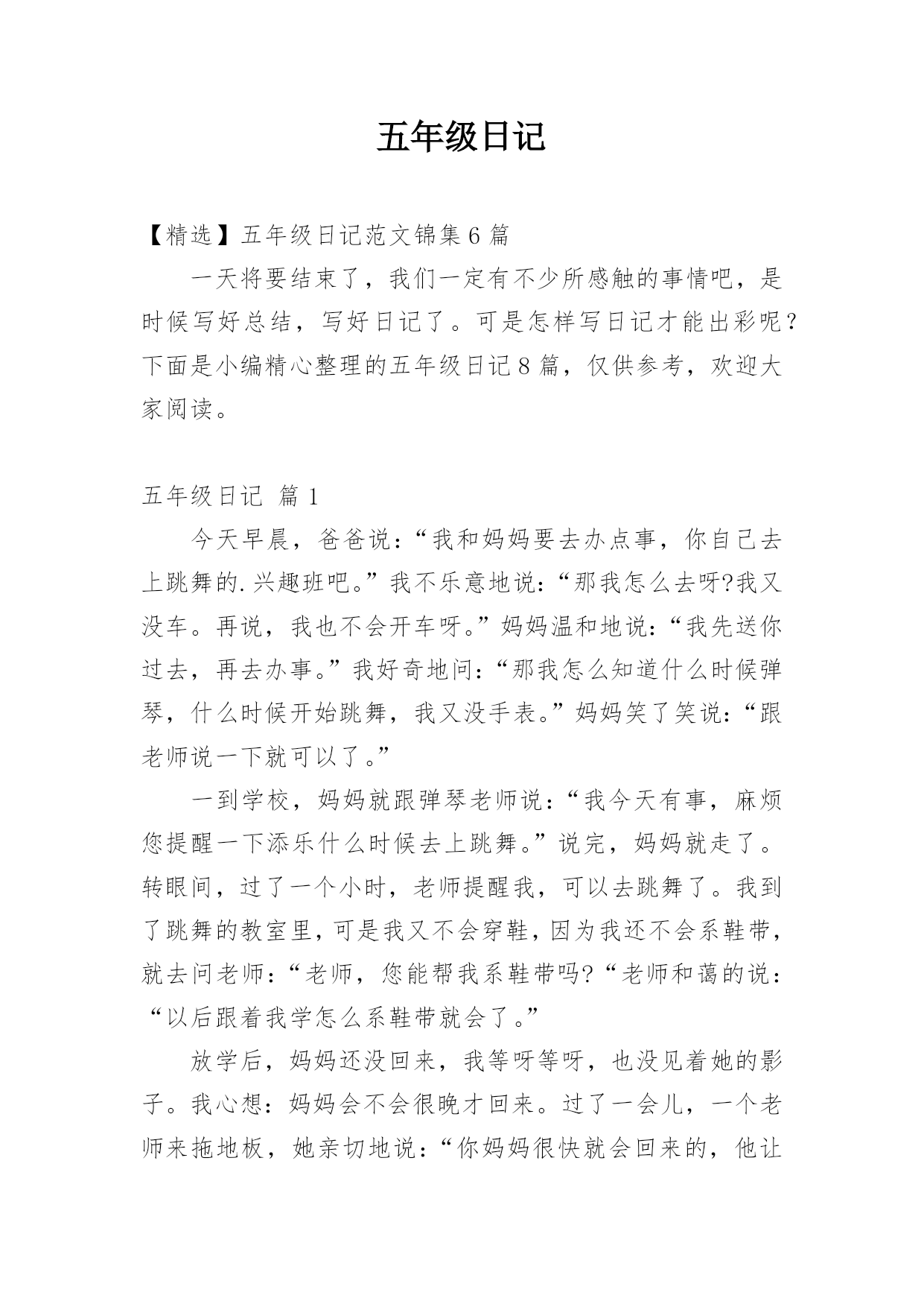 五年级日记【精选】五年级日记范文锦集6篇一天将要结束了,我们一定有不少所感触的事情吧,是时候写好总结,写好日记了。可是怎样写日记才能出彩呢?下面是小编精心整理的五年级日记8篇,仅供参考,欢迎大家阅读。五年级日记篇1今天早晨,爸爸说:“我和妈妈要去办点事,你自己去上跳舞的.兴趣班吧。”我不乐意地说:“那我怎么去呀?我又没车。再说,我也不会开车呀。”妈妈温和地说:“我先送你过去,再去办事。”我好奇地问:“那我怎么知道什么时候弹琴,什么时候开始跳舞,我又没手表。”妈妈笑了笑说:“跟老师说一下就可以了。”一到学校