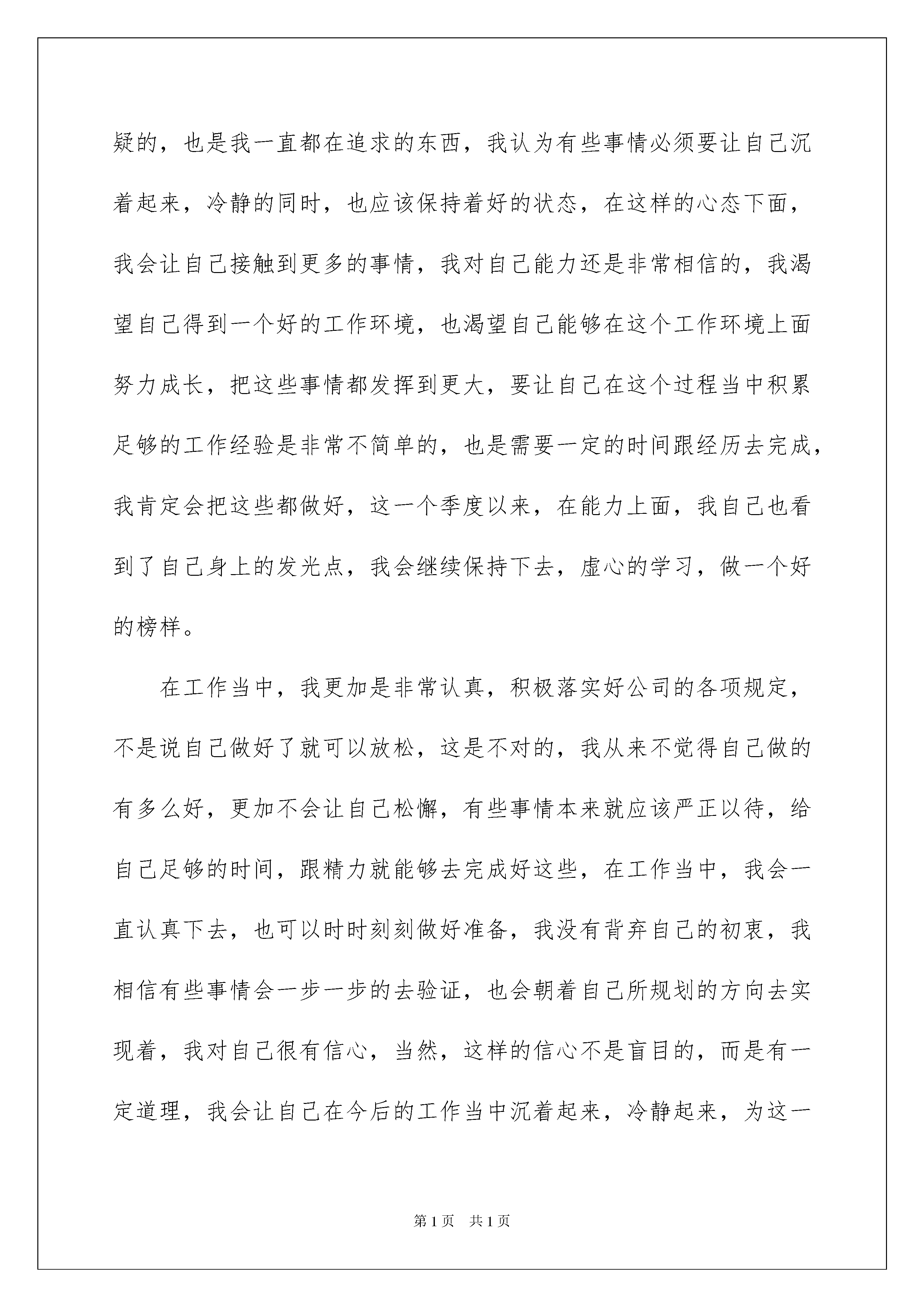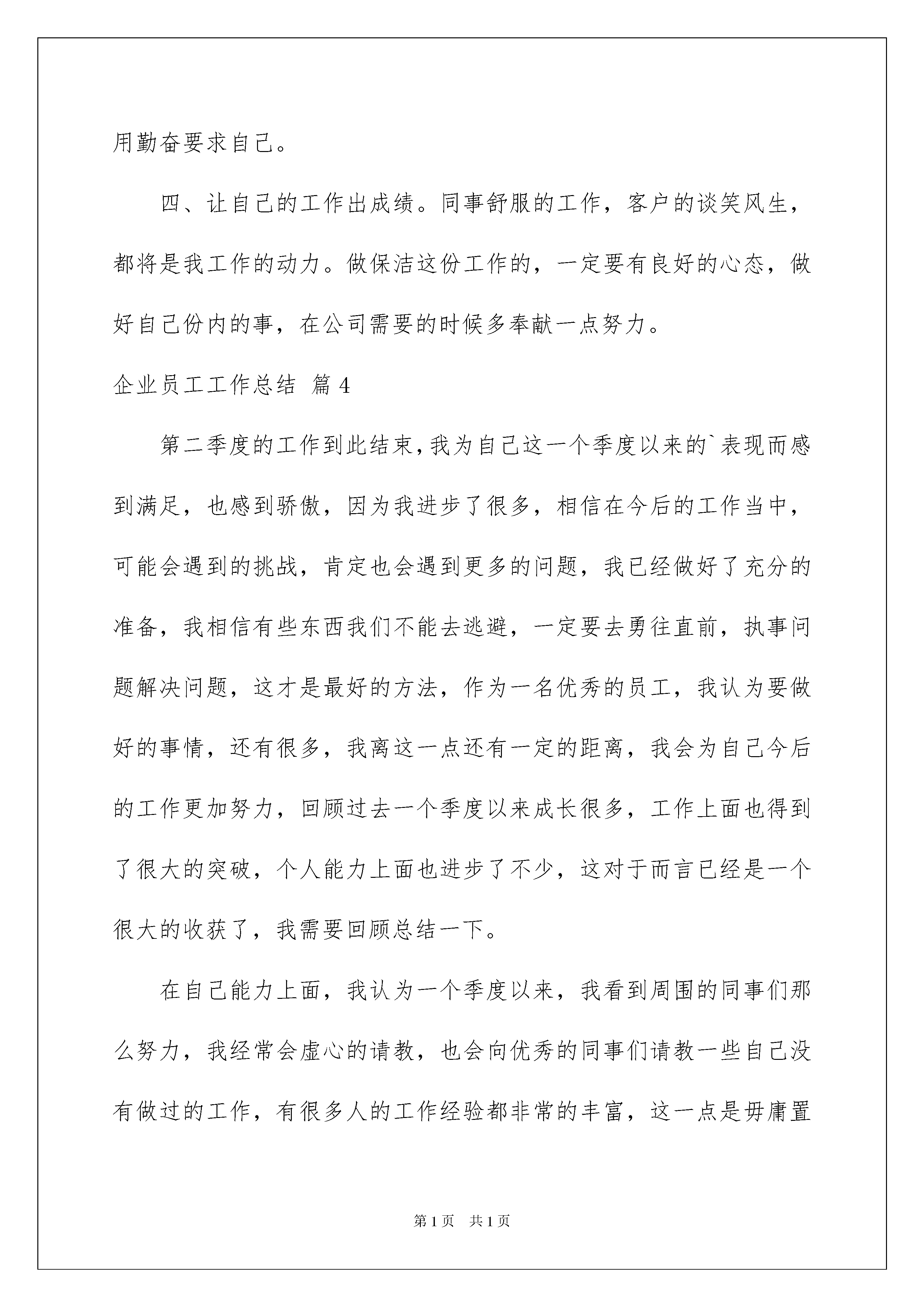 2022企业员工工作总结七篇企业员工工作总结七篇总结是对某一阶段的工作、学习或思想中的经验或情况进行分析研究的书面材料,它可以使我们更有效率,让我们一起来学习写总结吧。那么总结有什么格式呢?下面是我收集整理的企业员工工作总结7篇,希望能够帮助到大家。企业员工工作总结篇1光阴如梭,今年已过了一半,在上半年里我学到了很多,非常感谢公司提供给我一个成长的平台,让我在工作中不断的学习,不断的进步,慢慢的提升自身的素质和才能。回首过去的半年当中,公司陪伴我走过很重要的一个阶段,使我懂得了很多。在此我向公司尊敬的领导以及亲爱的同事们表示衷心的感谢,有你们的协助才能使我在工作中得心应手,也因有你们的帮助,才能令我在公司的发展上一个台阶。下面我将上半年的具体工作情况总结如下:一、认认真真,做好本职工作一是遵从__岗位职责,坚持做好出货工作,保证发货的准确无误,尽量完善工作以保证零投诉;二是做好入库接受,保证库存数据的准确,确保库存数据达到实实在在的百分百;三是完成二位领班临时安排的工作与积极参与整理工作,深化工作安全意识,提出各项合理化意见。及时与业务和生产部沟通联系,保证物流系统正常有序的进行。二、严于律已,自觉遵守各项制度严格遵守__的各项制度。谨记领导的指示和批评并付诸于实际,不迟到,不早退,不旷工。做事要谨慎认真,向领导汇报的仔细检查,日常工作要记录并及时上报;待人处事要有礼貌,对待同事要坦诚宽容;严肃办公室纪律,工作不懈怠,不玩游戏、不闲聊、不做与工作内容无关的事情。三、存在的不足一些事还无法循规蹈矩的做好,需要增强自己的毅力不够。工作中不够大胆,要在不断的学习过程中改变工作方法,不断创新完善。四、下半年的工作打算一路既往抓发货。要理清发货流程,更细化的,更明朗的。要不断总结提高,完善要不断提高修养,树立良好的公司形象,要提高自己的服务意识和办事效率,明确自己的工作重点与工作目标。对工作中存在的问题不断提出积极及合理化意见。无论是工作中的不足还是改进措施都是下半年应该好好深思探讨并付诸实际行动的。上半年的工作还算美满,我对下半年的工作充满信心,期待__公司在未来的半年能有一个更崭新的面貌!企业员工工作总结篇2不知不觉间,一年的时间又过去了。20__年,我幸运的来到了___公司,并在通过了层层筛选后,最终成为了一名采购部的试用期人员!如今,经过这一年多的努力,我早已结束了自己的试用期工作,真真正正的成为了一名正式的___采购员!尽管是这么说,但其实以我的资历和能力,在___公司的采购部前辈面前,我还是有许多的不足和问题,这都是我需要在今后的工作中改善和提升的地方!为此,反思这一年的工作情况,我对自己的工作总结如下:一、思想的转变从一名试用期员工转变成了正式的___员工,在工作称呼发生改变的同时,我的思想也在锻炼中进行了锻炼和改善。在工作之余,我通过对公司文化的学习,深刻的确定了自己作为___人的思想,在工作中严格努力的要求自己,并认真的对待每一次工作,积极的为企业贡献力量。此外,我还利用自己的休息时间,通过网络媒体,了解国家的发展,政策的改变。并且熟读了采购相关的法律,增强了自己的法律意识,加强了自己的品德和政治修养。二、工作情况前期,作为一名采购的新人,我在过去一直以来都认为采购其实是一个非常简单的工作,用适当的价钱买下适当的原材料或产品,这怎么听都像是“跑腿”的工作。但如今,在真正的深入了解了采购这份工作之后,我才明白。采购,不仅仅是“跑”这么简单。我们不能没有目的的跑,更不能随便的跑,必须在了解市场,了解原材料和产品的情况下,有计划,有目的的去完成采购的工作。在工作中,我一直在__领导的带领下学习采购知识,在工作中,我明白了如何辨别采购品,也了解到了附近市场和供应商的情况。学会了在采购中货比三家,并能更好的规划采购计划,为公司尽可能的在保证质量的情况下节省采购资金!如今,经过了工作,我才知道“买”也是这样一门大学问!并且深深的了解到,作为采购,我们的工作影响着许多重要部门的工作!为此,我们才更要在工作中更加严格、仔细的去要求的自己!如今,尽管这一年我没有什么突出的贡献,但我也稳扎稳打的完成好了自己的工作目标。但在今后的工作中,我会更加严格的要求自己,让自己的工作完成的更加出色!企业员工工作总结篇3不知不觉中,我在新的岗位上工作了近一年的时间,在这一年时间里,我非常感谢饭店的每一位领导和员工,是你们教会了我如何做人、如何做事,让我懂得了许许多多的道理,为今后更好的工作,现将我一年来的工作总结如下:一、一年来的工作表现(一)强化形象,提高自身素质。为做好自己的保洁工作,我坚持严