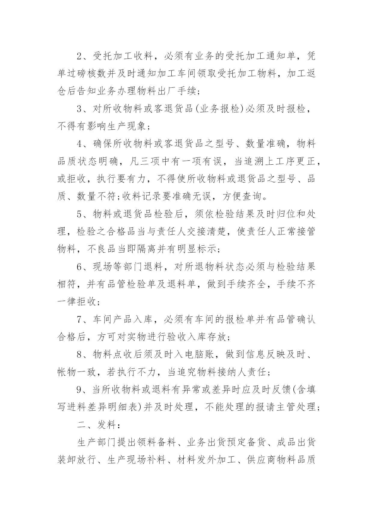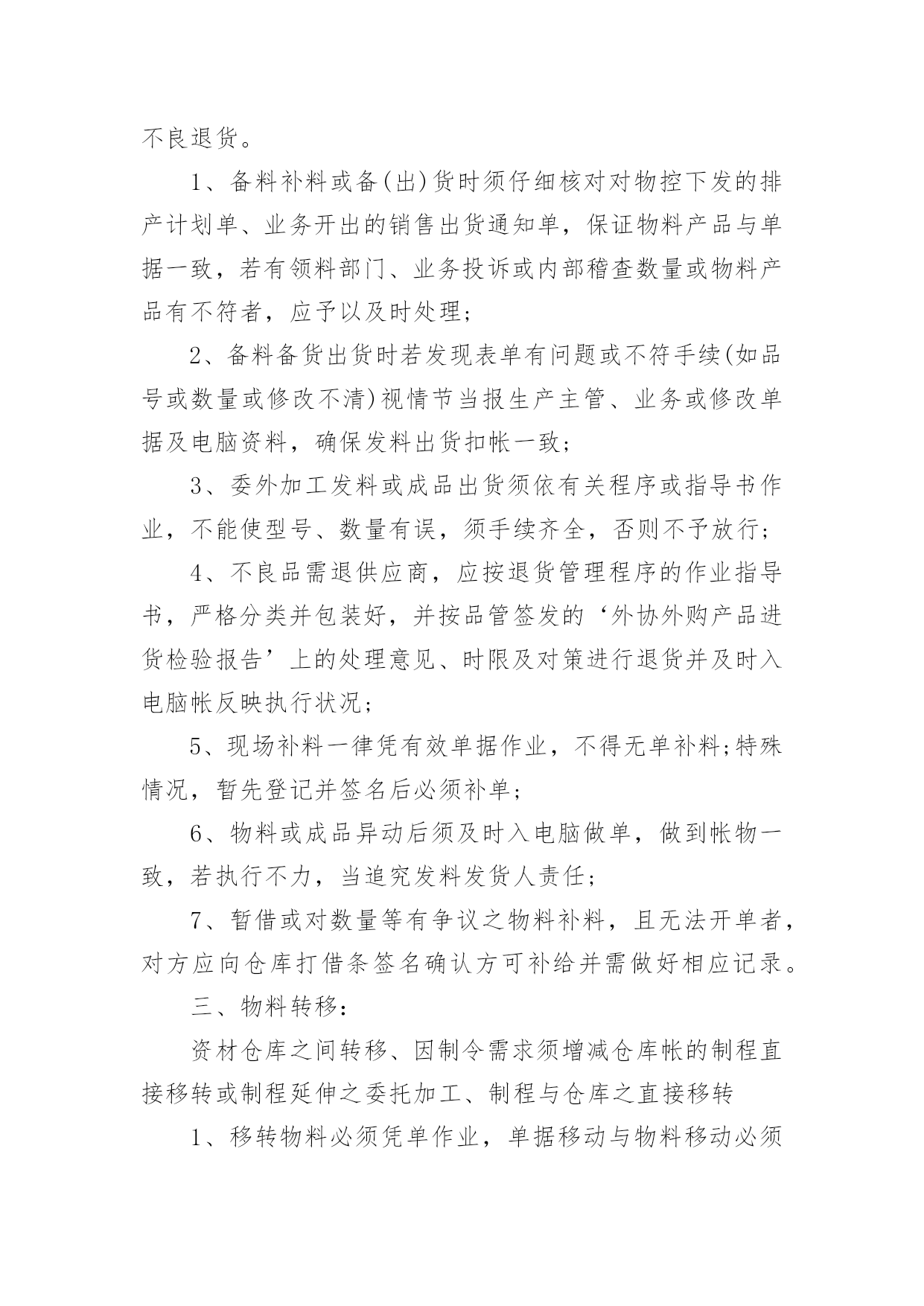 仓库管理制度仓库管理制度【优】在充满活力,日益开放的今天,接触到制度的地方越来越多,好的制度可使各项工作按计划按要求达到预计目标。那么制度的格式,你掌握了吗?以下是小编精心整理的仓库管理制度,仅供参考,大家一起来看看吧。仓库管理制度1收(含退货退料、受托加工)料、发(含备料、补料、发外加工、销售出货、报废)料、物料转移(仓库转移、制程转移、制程委托)、单据处理、帐务处理、责任区管理、公共环境、设备维护保养、工作服从、服务与沟通、值日生职责、领导者责任。一、收料处理:供应商送货收料、受托加工收料、客户成品退