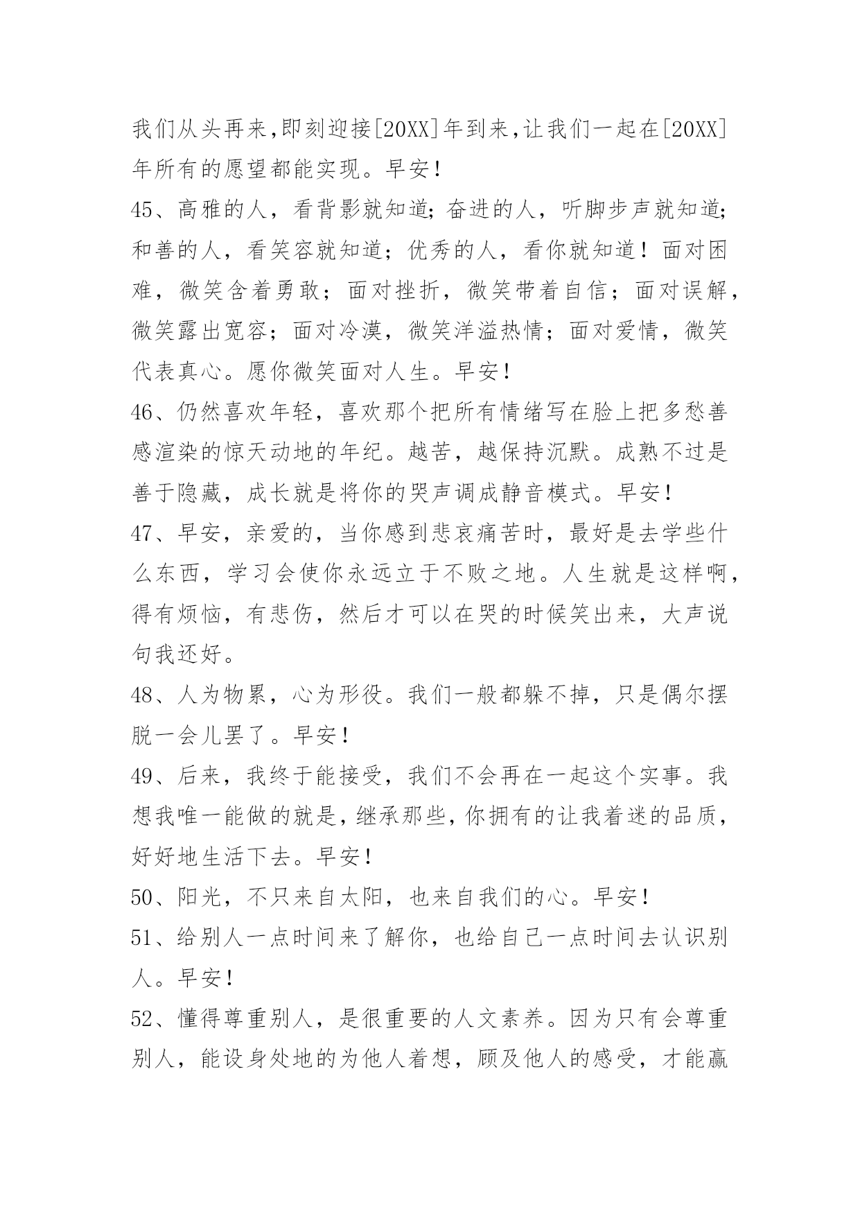 简单的适合早上发的早安QQ问候语2024年简单的适合早上发的早安QQ问候语集锦61句在发生误解和争执的时候,一定要换个角度、站在对方的立场上为人家想想,理解一下人家的处境,千万别情绪化,把人家的隐私抖了出来。早安!以下是小编搜索整理的适合早上发的早安问候语61句,欢迎阅读借鉴。1、无论是谁,都有充足的理由相信自己。显赫也罢,平淡也罢,尊贵也罢,卑微也罢,一切都不重要,关键是我们要有自信的态度。拥有自信,我们才能舒展自己的每一个细胞,开创属于自己的一片天地。自信的人不会沉沦。一个人不论活得多么卑微,自信就是