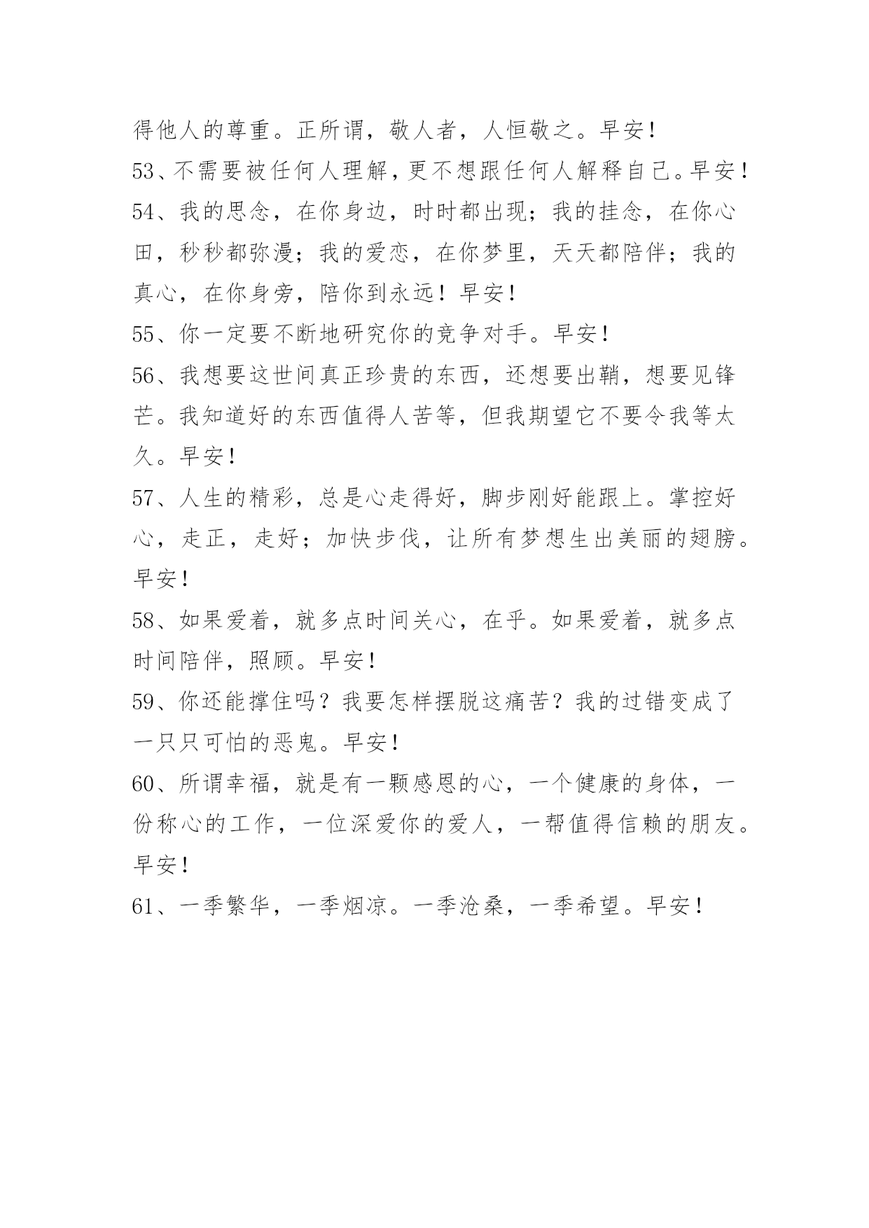 简单的适合早上发的早安QQ问候语简单的适合早上发的早安QQ问候语大汇总55句你必须非常努力,因为后面还有一群人在等着看你的笑话。早安!以下是小编为大家准备的适合早上发的早安问候语55句,希望大家喜欢。1、有些话,不可轻与人言,雄辩不绝者银,韬光养晦者金;有些事,不可贸然疾行,常立人前遭人妒,木秀于林风必摧;有些不平,不可忿而宣泄,万相丛生成世态,隐忍决绝能制人;有些微利,不可随意伸手,得是一种短暂,失是一种境界;有些平凡,不可丢而弃之,因为淡所以久远,因为静能成永恒。早安!2、春去春回,花开花谢,这是规律