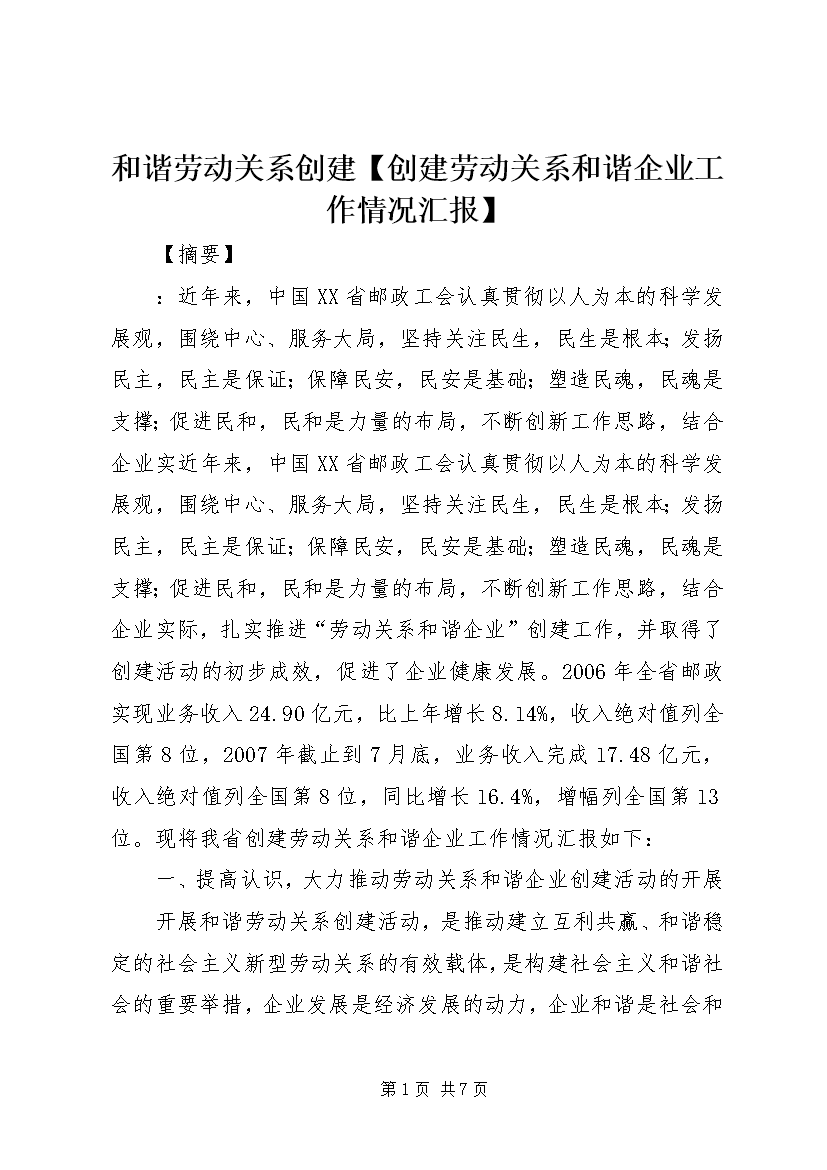 和谐劳动关系创建【创建劳动关系和谐企业工作情况汇报】【摘要】:近年来,中国XX省邮政工会认真贯彻以人为本的科学发展观,围绕中心、服务大局,坚持关注民生,民生是根本;发扬民主,民主是保证;保障民安,民安是基础;塑造民魂,民魂是支撑;促进民和,民和是力量的布局,不断创新工作思路,结合企业实近年来,中国XX省邮政工会认真贯彻以人为本的科学发展观,围绕中心、服务大局,坚持关注民生,民生是根本;发扬民主,民主是保证;保障民安,民安是基础;塑造民魂,民魂是支撑;促进民和,民和是力量的布局,不断创新工作思路,结合企业实