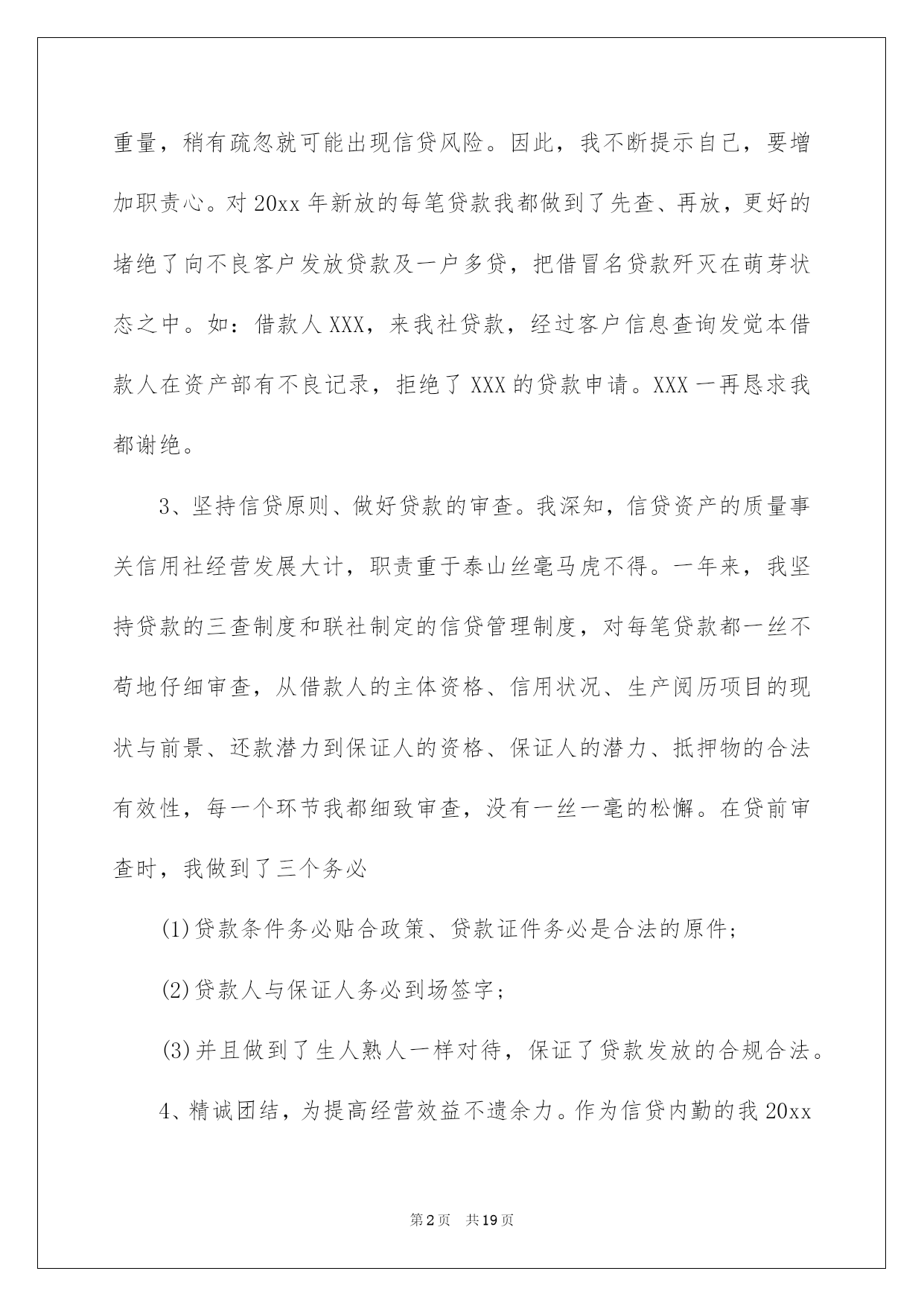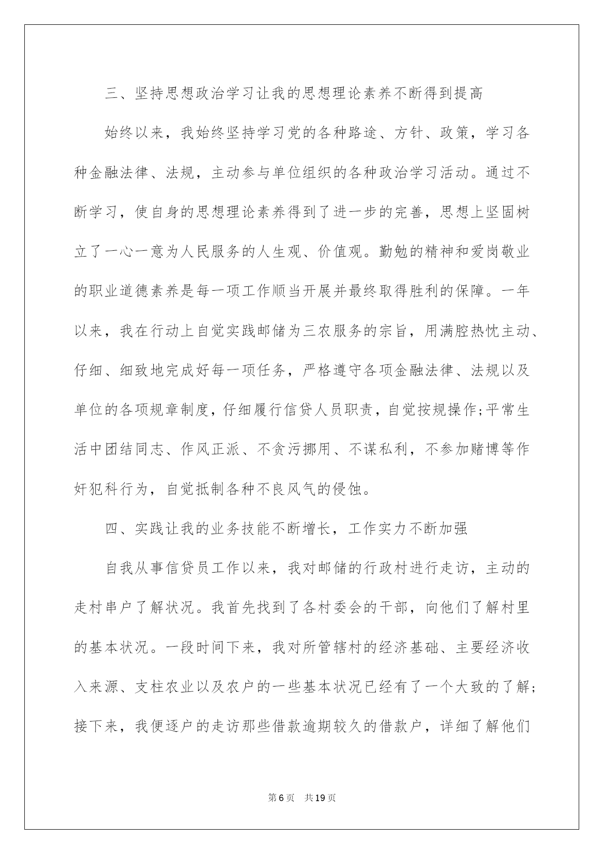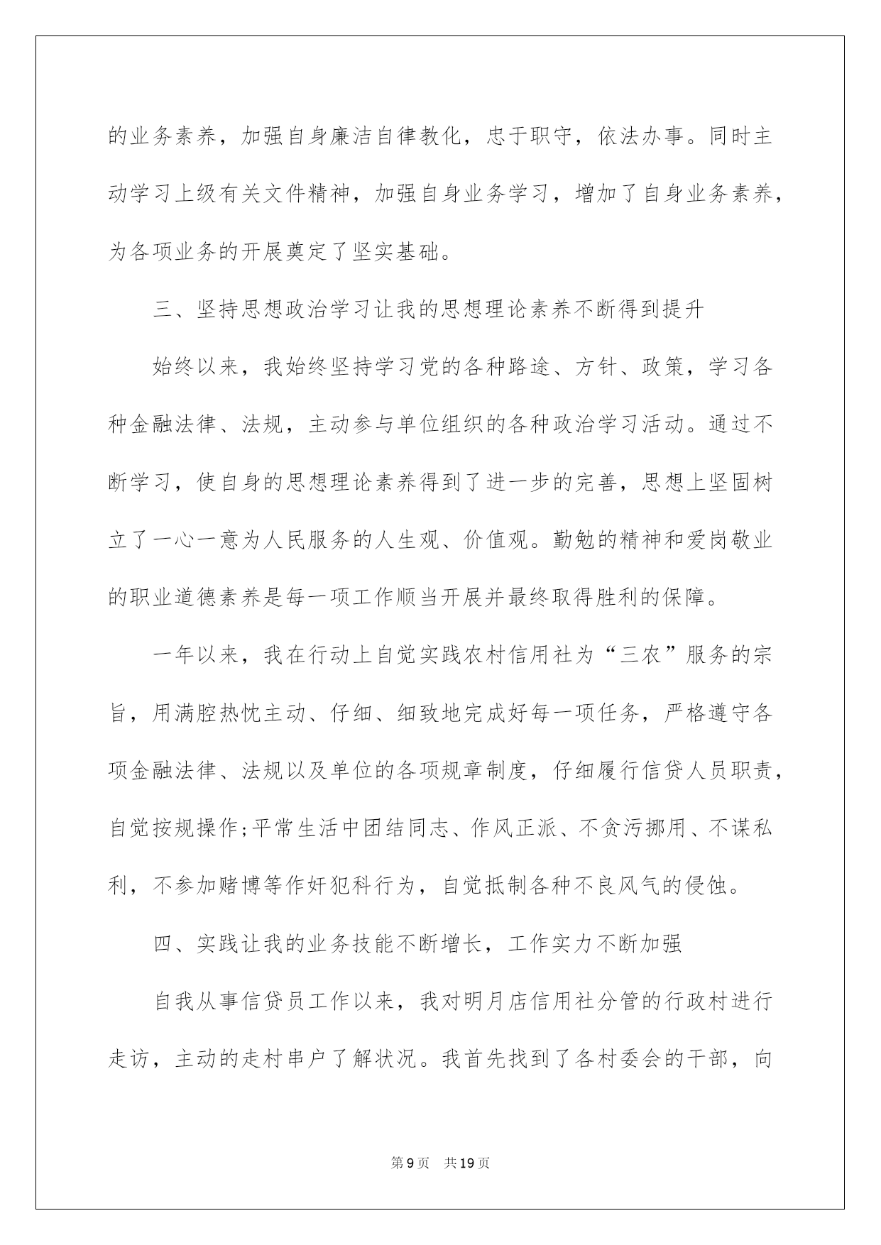 信贷员述职报告信贷员述职报告15篇在当下社会,报告与我们的生活紧密相连,多数报告都是在事情做完或发生后撰写的。相信很多朋友都对写报告感到非常苦恼吧,下面是小编为大家收集的信贷员述职报告,欢迎阅读与收藏。信贷员述职报告1在匆匆忙忙中,一年的时间很快过去了。在这过去的一年里,我在领导的带领和同事的帮助下,认真履行职责,踏踏实实的做好本职工作。我热爱自己的本职工作,能够正确认真的去对待每一项任务,把金融政策及精神灵活的运用在工作中,工作中能够采取积极主动认真遵守规章制度,及时完成领导交办的各项工作任务。现将一年
